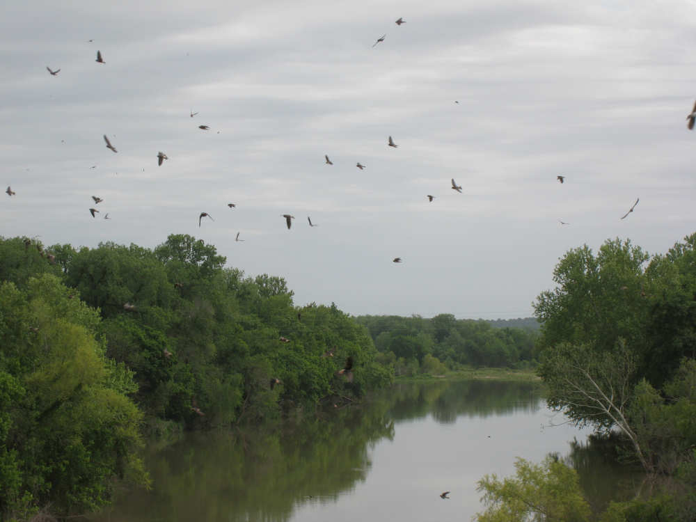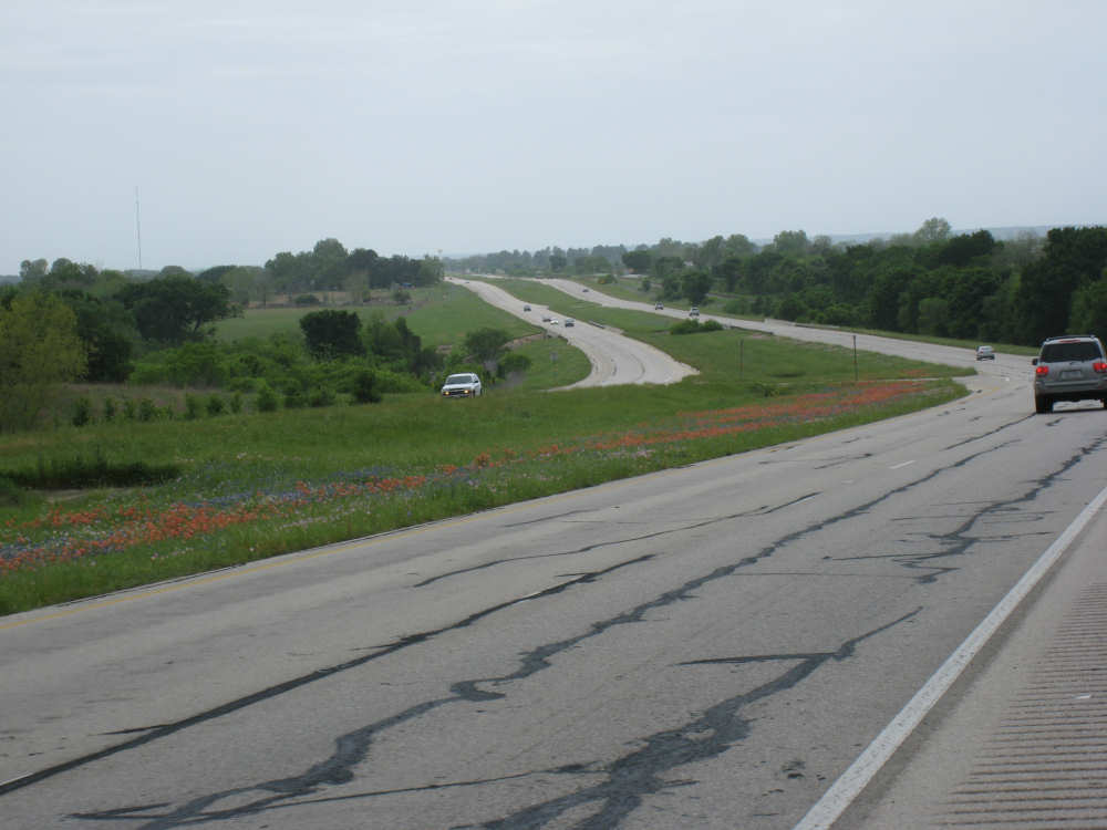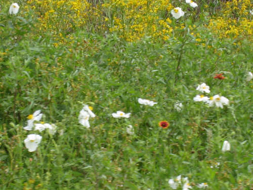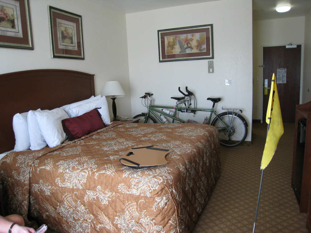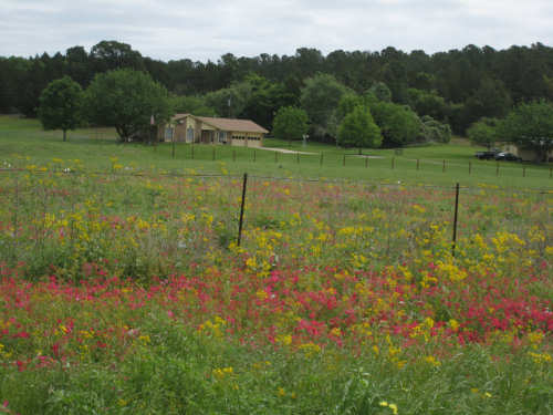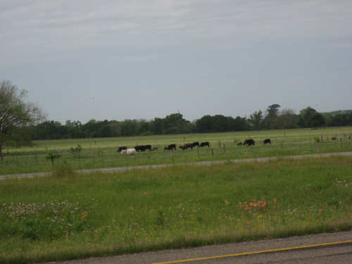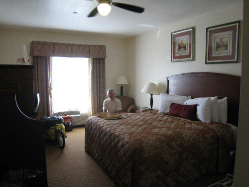 Thursday, April 10, 2008 We sort of wimped out again today. We were going to follow the Adventure Cycling route to Austin, which included going through a couple of state parks and other scenic spots. But when we looked at the route last night, it looked so complicated, long (71 miles), and hilly, it made us feel tired just looking at it. Besides which, we were camping out, and the weather predicted thunderstorms over night and the next morning, and gusty winds all day, so we figured we'd have to pack in the rain, we'd get a late start, and we'd have to pick out this complicated route in the rain. Then we realized that we could get to Austin by just going on SR 71, the road we ended on yesterday - simple, less hilly, and shorter by 11 miles! OK, less scenic and less interesting too, but that didn't seem enough to tip the scales at the time. So, SR 71 it was. It turned out the weather wasn't that bad - it was windy all night but didn't rain at all. It was cool and humid when we packed, it only drizzled some for a while when we were on the road, and the wind wasn't bad at all. But I think we still made out fine, the road was scenic enough with all the wildflowers along the sides and in the median, and it was definitely easier. The traffic was bad in a couple of spots - by the town of Bastrop and at the end when we got into Austin. The only time we didn't have a wide shoulder was in Austin, where there was 3 lanes of fast-moving traffic with almost no shoulder. But the drivers were respectful of us and we got through fine. We passed through the town of La Grange (where we spent the night) and found it to have a very nice-looking downtown. It also seemed to have its priorities straight - one of the side roads had been built around a gorgeous old tree rather than cutting it down! La Grange, and in fact, the RV Park we stayed at, is the stopover town for the big MS 150 mile tour that runs between Houston and Austin every year. It's scheduled for this Saturday and Sunday, and we saw lines of Port-a-Potties at a number of places along SR 71, in preparation for the crowds. It's a huge event, about 13,000 riders; we were glad we timed our visit just ahead of it. We went over the Colorado River 3 more times today - it seems to curve around a great deal. At one crossing, we saw hundreds of small birds zooming around and chattering away cheerily. The roadside was quite lovely most of the time; we had blankets of Indian Paintbrush and Evening Primrose, some white flowers, and scatterings of Blue Bonnets and several other pretty flowers. There were lots of trees, including some pecan trees apparently - pecans seem to be a major crop here - some cattle ranches, other huge fields with crops just starting, and a few towns here and there. Bastrop was the most significant town we saw before Austin, and we stopped there for lunch at a Mediterranean restaurant. We came into Austin at 60 miles in less than 5-1/2 hours. Even though we left the campsite at 8 am, later than usual and without having had breakfast yet, we arrived at our motel at 4:20. The motel was the poshest (and most expensive) we've stayed at yet, so we had to take a couple of pictures of that too. P.S. I've updated yesterday's wildflower photos with names, if you want to check back. |