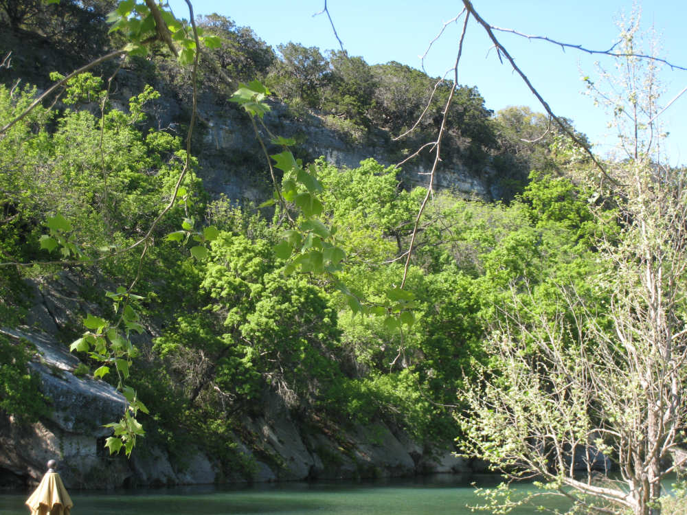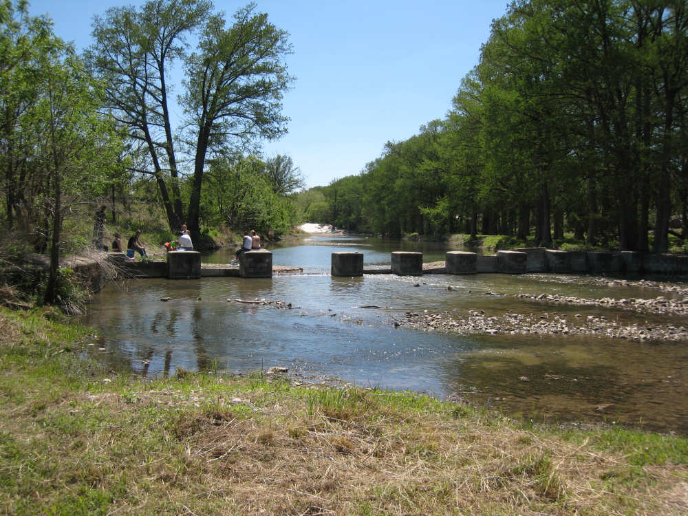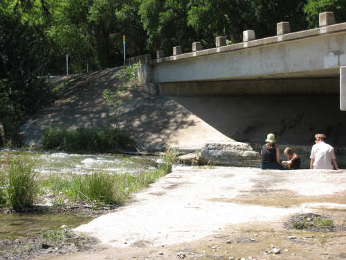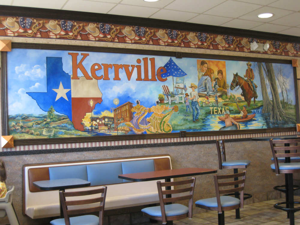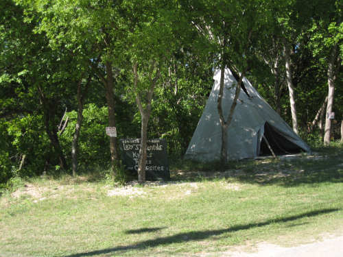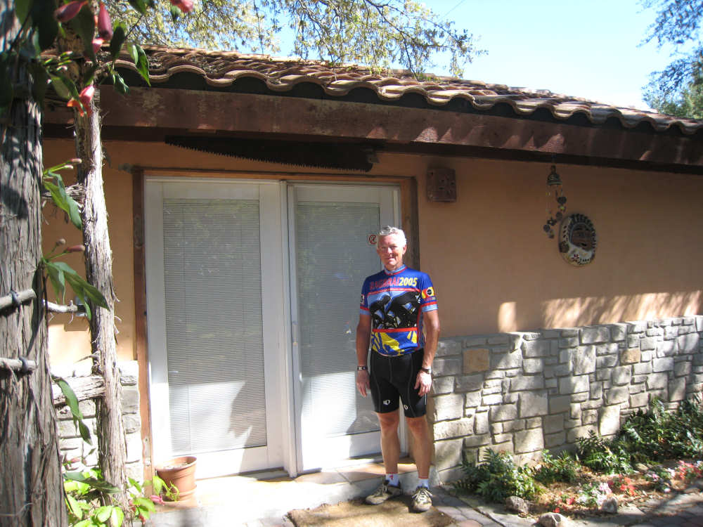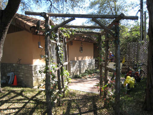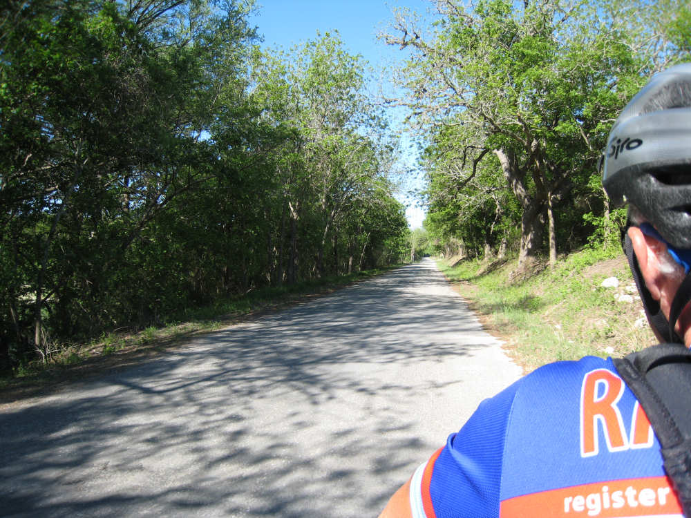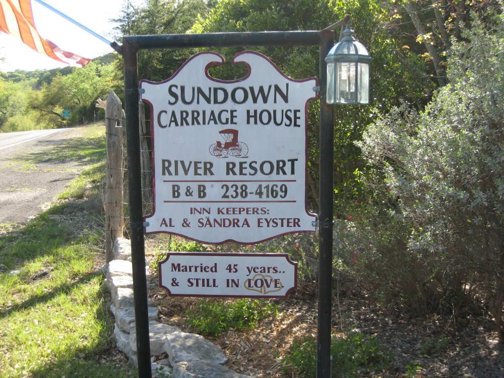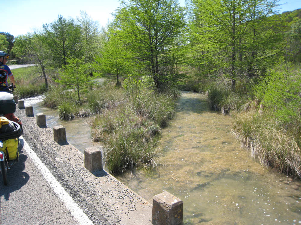 Sunday, April 13, 2008 It was very cold when we got up this morning which made it very hard to get going. The tent was very wet from condensation, too. Luckily, we didn't have far to go for breakfast, just a mile down the road into downtown Comfort. We sat next to 2 guys who were dressed in fancy cowboy wear, which we didn't think was too unusual, but when we got to talking with them it turned out that their "hobby" as they called it was to travel around to shows and do wild west action shows. The older gent was a 3-time world champion and 4-time national champion in the Single Action Shooting Society markmanship contest. He had an alias or show name of Ed Sieker, Texas Ranger; Mike's show name was Ranger Star. They were both very pleasant to talk with. We started down State Road 27, a nice, smooth road with a good shoulder - a nice, easy way to start the day. Pat kept noting that we could take this road all the way to Ingram, a good 2/3 of our day's route, but we turned off onto the more scenic (read: narrower, bumpier, more complicated) Adventure Cycling route. It was pretty: we went down to the Guadalupe River - a beautiful, clean, spring-fed river that started somewhere in this area and went down to the Gulf Coast. We went along the river most of the day, crossing it several times. There were several dams along it, so the water level changed from one place to another but it was fairly high for the most part. There were several spots with canoe & tubing rental places, and we saw several families and kids enjoying the river - canoeing, fishing, wading, and so on. The roads were narrow and tree-lined with little traffic, but the bumpiness really detracted from our enjoyment of them. We went through 4 towns today - Center Point, Kerrville, Ingram, and Hunt - all of them tiny except for Kerrville, the Kerr County county seat. Center Point had a few historic buildings. Kerrville was not very impressive except for a few lovely buildings, churches, and the court house. We stopped at a McDonalds there to use the bathroom, but realizing it was lunch-time, we had some lunch as well. There was an amazing mural inside that I got a picture of. We decided to pick up something for dinner in Ingram since we heard there was nowhere to buy food after that. We stopped at a small food market and got a small jar of peanut butter, some crackers, and some tuna fish lunch packages, but it didn't seem much like dinner. A local policeman happened to come into the store at that point and we asked him if there was a place that made sandwiches to go; he directed us to a little place called Spirit Wind Java where we got excellent chicken and roast beef sandwiches. So we made out all right for dinner and we still have the peanut butter and tuna fish for tomorrow, when we won't be going through any towns at all (that should be interesting). After little Ingram, which had started right where Kerrville left off, it was only about 6 miles to tiny Hunt. It was clearly an area with some money, though; the houses along SR 39 were all quite grand. There was still a lot of pretty hill country scenery around, though, and still the same bumpy road surface. The road surface slows us down considerably besides being pretty tiresome to ride on. We stopped at The Hunt Store in Hunt (one of 3 or 4 buildings in town) to get a cold soda and found another touring bike parked outside. Inside the store, we found Zig Sondelski from Utah, who was traveling the same Adventure Cycling route eastward. We traded stories about the route, the hills, the bumpy Texas roads, and so on. Five and a half miles later we arrived at the Sundown Carriage House Bed & Breakfast, which we had decided to splurge on so we wouldn't have to spend 3 consecutive nights in a tent. It is a lovely place, run by a very hospitable couple, Al & Sandra, who have been very helpful and accommodating. The house fronts onto a very lovely stretch of the Guadalupe River. The only drawback was that we didn't have a cellphone or internet connection, so we won't be able to update our website until tomorrow at least - sorry, fans! A couple of comments about yesterday's post. The stone we thought might be limestone seems, instead, to be sandstone and is very prevalent in this area. Also, I didn't explain very well the significance of the flood gauges by the dry creek beds. Apparently, the creek beds and ditches dry up in the dry seasons but can fill with water very quickly in the torrential rains that often come through here. It rains so hard that the ground can't absorb it and the low-lying roads often become badly flooded. We felt very lucky to have come during a dry spell. |