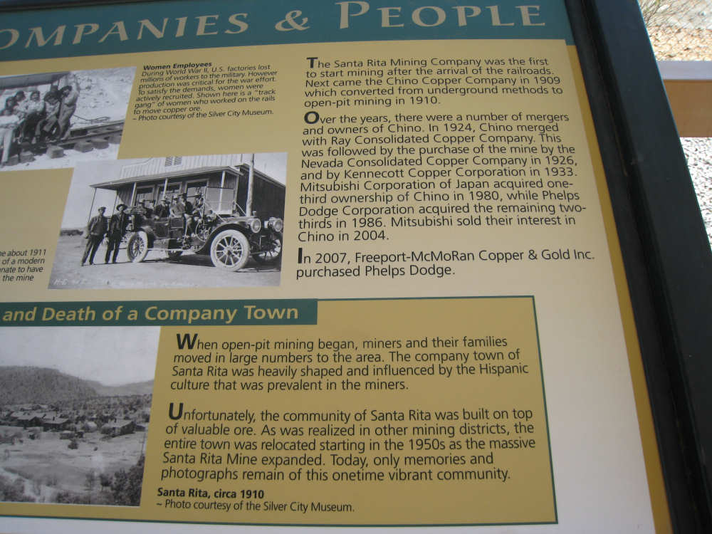 Monday, April 28, 2008 We started the day later than usual by having breakfast at the Black Range Lodge with Pete Fust, one of the owners, Tom, the resident housekeeper and cook, Debbie and Chris, the couple who sang at the concert in Hillsboro the day before and stayed overnight at the Lodge, and Ian and Taran, the father and son who were biking from Vancouver, Canada to Houston, TX. Unfortunately, Pete's wife, Catherine Wanek, did not join us for breakfast so we don't have a picture of her. They were a very enjoyable couple who made our stay very, very pleasant and comfortable. We highly recommend the lodge to anyone traveling in the area (www.blackrangelodge.com). Pete and Catherine are also experts on strawbale house construction, and Debbie, Chris, Ian, and Taran were all staying over that day for a hands-on workshop. There were a number of strawbale buildings on the premises, as well as an earthen bread oven shaped like a phoenix. After a scrumptious breakfast, we headed for the hills again, leaving at 8:40. The climb up to the Emory Pass (6280 feet elevation) was an 8-mile long climb of about 5-6% grade nearly the whole way. We had a couple of little 'rest areas' where the grade dropped to about 2-3%. It was a long climb, but again the scenery was gorgeous and it was well worth the effort. The pictures don't do it justice, unfortunately. The view from the Pass was amazing. We could see the little stretch of road that was Kingston (where we stayed last night) very clearly, then further back and to the right was the town of Hillsboro that we had been through yesterday (it's just barely discernible in the photo). And way in the back were the Caballo Mountains - we could even see a bit of the Caballo Lake beneath them. So nearly all of yesterday's journey lay there at our feet! Coming down from the pass was a little harrowing. We had to brake almost continuously and stopped every few miles to let the disk brake cool down. It was as pretty as the other side of the mountain, with one valley that contained enormous boulders. The drop was longer than the climb, with one stretch of a couple of miles where we were actually going up again. We reached the bottom near the town of San Lorenzo, where the Adventure Cycling route split into two options. One went further north and covered an area called the Gila Cliff Dwellings, where there were preserved pueblos built centuries ago in the natural caves overlooking the Gila River. This route was much more challenging and we opted for the easier one going straight west to Silver City. After 25 miles going up and down the Emory Pass, the remaining 25 miles of 'rolling' 2-5% grades to Silver City were plenty challenging for us. We got to our destination about 5:20, having done almost 48 miles in a little over 6 hours of bike time, an even worse average than yesterday's low. We were lucky in that the winds were very calm today and the day was warm and sunny but not too hot. There was one special attraction on the stretch between San Lorenzo and Silver City. We passed by the Santa Rita Copper Mine, a mine that Pat's parents went by on a trip out west many years ago. Walter was fascinated by the mine, whereas Eileen couldn't see what was so interesting about a big hole in the ground. The same scenario played out today - we saw three couples there, with the 3 men hanging on the fence animatedly talking about the mine, and the 3 wives hanging by the cars chatting about other things. It turned out they used to live in Santa Rita and had come back to see all the changes since they had lived there. As you can read in the history below, the entire town of Santa Rita was relocated over 50 years ago when the copper mine went into full operation. The other point of interest today was that we hit our 3,000 mile mark - one third of our total trip. We had our 3,000 mile picture taken at the motel in Silver City, since there wasn't anyone around when we actually reached it. We will be camping out tomorrow night - there's not much civilization between here and Safford, AZ, about 120 miles west. We will very likely not have cell phone or internet access, so the web page won't be posted until evening of the next day. |