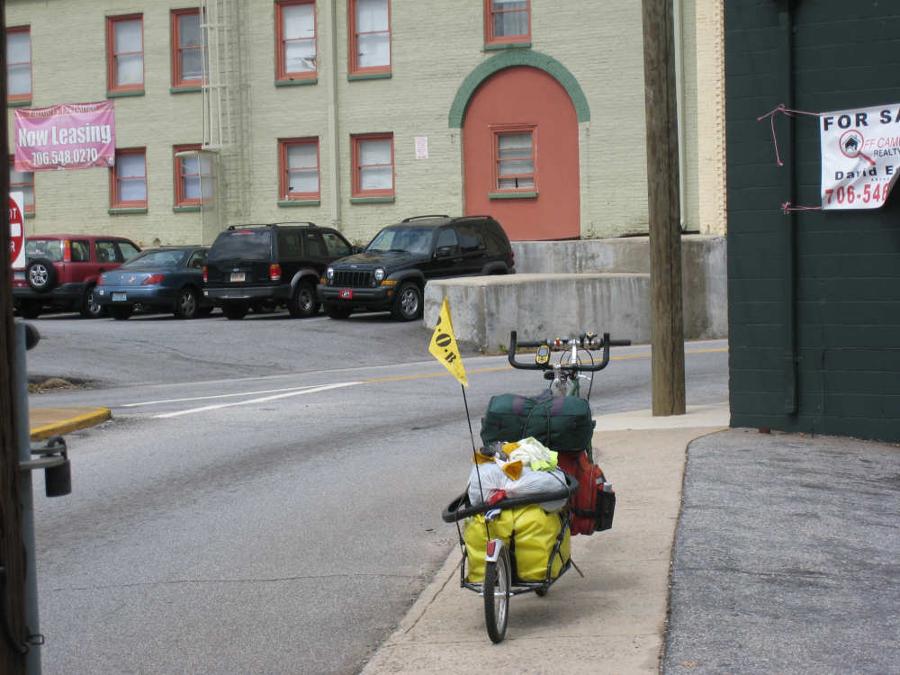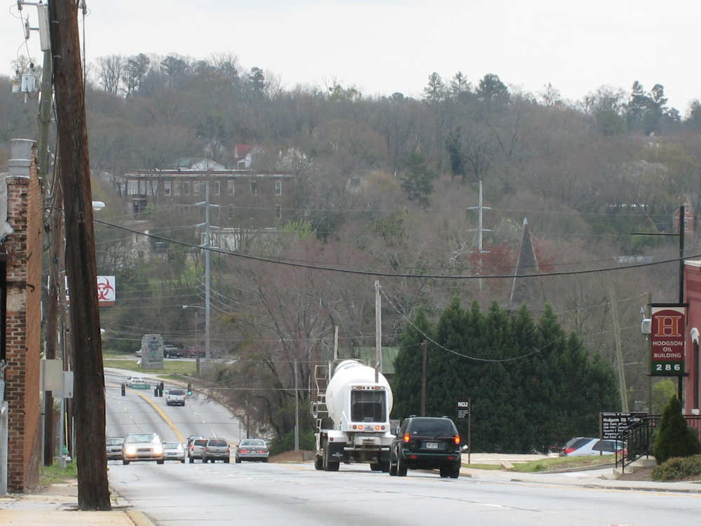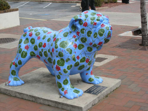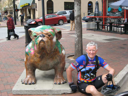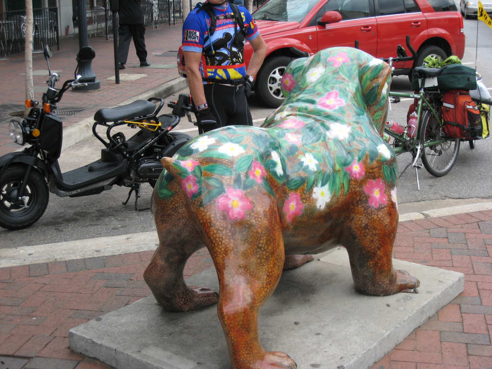 Tuesday, March 18, 2008 We had as many as 4 faithful readers (and the rest of you are either too nice or hadn't read it yet) point out that our "hawks" were really vultures. The actual names suggested were: vultures, buzzards, turkey vultures, and black vultures, with black vultures being the likely winner. Good thing we have you folks keeping us honest - I tend to use "hawk" to indicate any bird that floats on the breeze with its wings outstretched. You must admit, it sounds better than "vulture". Today's prize goes to the person who can identify the food named in the first picture below. After tempting us for miles with little signs promising these mystery items and boiled peanuts, the market that should have had them turned out to be closed. Very disappointing! This morning started out with heavy clouds but 54 degrees. We had breakfast early and headed out at 7:45. Our route was easy - we would be on Hwy. 78 or 78 Business all day. We started out through what was billed as "Historic Washington"; we didn't expect much of it, but it turned out to be a lovely section of town with several stately mansions, and several bed-and-breakfasts. It was a little like Cape May, NJ (for those familiar with that town), except the houses were southern-plantation style instead of Victorian-era. Unfortunately, we don't have any pictures of them as we were anxious to get underway and didn't want to stop. We later went through Lexington, GA's historic area but it was disappointing except for a magnificent court house. Today's scenery was similar to the past few days, but more populated. We saw several large farms, many with cattle, including a few Angus farms. The usual pine woods filled in the gaps between farms. There were also a few more towns and places to stop than we've been used to. The traffic was still fairly light most of the time, until we entered the Athens area when it got horrendous. The clouds cleared up briefly but more, lighter clouds soon replaced them. It only got up to about 58-60 degrees and felt fairly humid. The white blossoms on the pear trees are slowly giving way to green leaves, and the dogwood trees are just beginning to bud. We also saw what I think was a red sugar maple (pictured below; let me know if I got that wrong, too!). The highlight today was our destination, Athens, and the University of Georgia there. It dawned on me, as we passed a sign, that we were in Athens-Clarke County, one of my former employer's pension clients, so I had to take that picture (hope you're reading this, Craig!). The University had some lovely buildings and a very nice student-oriented main street with quaint shops and several eating (and drinking) places. They are obviously very proud of their football team; there were references to Bulldogs (or "Dawgs") everywhere, and there were several bulldog statues artistically painted around the campus area. The hills and the traffic had not been bad all day but they were both awful in Athens. The streets were narrow, the traffic was very heavy, and the last 5 miles to our motel had several major hills. Pat & I were both getting pretty cranky by the time we got to our motel. We had decided to pick a motel on the far end of town so that we evened up today's and tomorrow's mileage (at least we don't have to do those hills first thing in the morning), so we ended up at 50.3 miles in 4 and 3/4 hours, arriving at our motel at 2:30, very tired. |