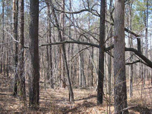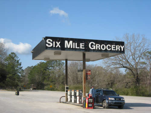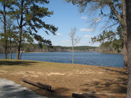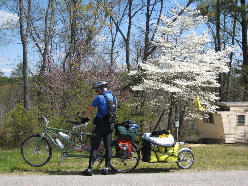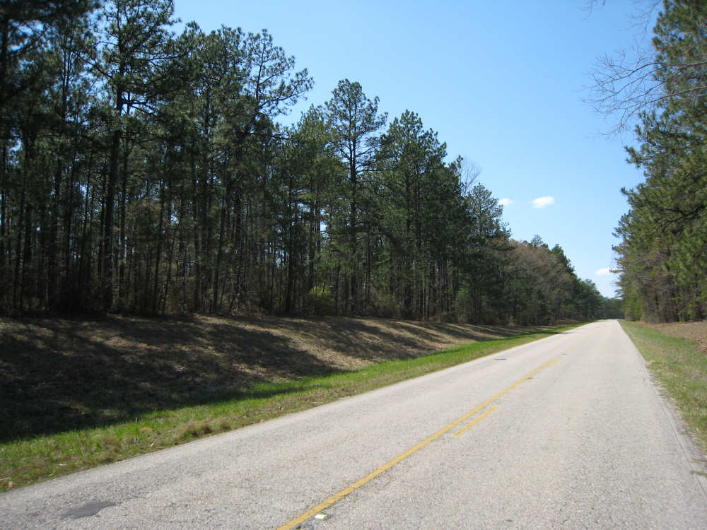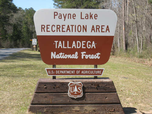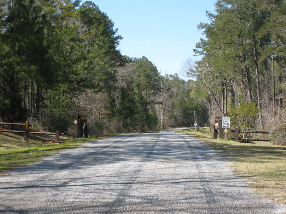 Monday, March 24, 2008 This morning started with a little adventure. We had only gone about a mile from the hotel when we noticed the traffic was all backed up. Turned out they were stopped by a freight train that was inching forward, stopping, going backward, stopping, and so on, completely blocking the intersection. We stopped behind a school bus to ponder our choices - some of the bratty boys in the back seat leaned out to chat and ask if they could borrow our bike. We decided to try a detour which, fortuitously, took us right past the Heart of Dixie Railroad Museum. So we stopped to take pictures of all the neat train cars they had on display there. Then we turned the corner and got by the end of the train and were on our way. It was chillier this morning so we were bundled up more than we have been in a while. Route 25 outside of Calera was very industrial with 2 limestone plants across the road from each other (all the trees near them looked ghostly, all dusted white), a steel plant, some logging operations, and others. There were lots of trucks going by as a result, and of course it was our usual 2-lane, no-shoulder country road. Plus it was a bit hillier and windier than it was yesterday, so all in all, not nearly as pleasant. Besides all the industrial buildings, there were a few large farms, all with very well-kept, grand-looking houses, neat fences and nice plantings - very little forest. As we got farther from Calera, the houses got less grand. We knew there would be only one large-ish town we'd go through today, Centreville, about 28 miles out. Although we had a continental breakfast at the hotel, we were feeling hungry when we saw a sign for a grocery store called Six Mile (turns out, the nearby town was called Six Mile too, but we forgot to ask what it was 6 miles from). The folks in the store were very nice and we chatted with them about Payne Lake, our destination for the night, and restaurants in Centreville. They recommended the 'Twix and Tween' restaurant and we ended up stopping there for lunch - had a great, inexpensive buffet. Figuring that we wouldn't have any restaurants at dinner time, we asked them to make us some sandwiches to take with us, and they were delicious, too. After Centreville, the traffic lightened up somewhat and the scenery became more like what we've been used to - a mix of houses in various states of repair, many shabby, some in good shape, with forest in between. We then got into the Talladega National Forest again and didn't see any more houses. There were still a lot of trucks, mostly logging trucks, and a few cars. The road got a lot hillier here and in worse shape, I guess because of all the truck traffic, but it wasn't too bad. We finally saw the sign for Payne Lake and turned in. The lake was beautiful, in the middle of the forest, all quiet and peaceful. We came to an information station but no one was around, so we studied the maps and made our way around to where we thought we were supposed to be. No one was anywhere in sight, which we thought was odd, but given the time of year we decided it wasn't too strange. We stopped at a site overlooking the lake and Pat went off to try to find the ranger while I set up the tent. Pat found out that we were actually on the wrong side of the lake, that other folks were on the opposite side where there was electricity and bathrooms, but we decided it wasn't worth moving at that point. Our Verizon connection didn't work anyway, so we couldn't update the site. We had our sandwiches, chips and apples for dinner, got all the work done on the website, except copying it to the web server, and went to bed. We had reached the campsite at 54.5 miles, but Pat put another 4 miles on it looking around. |