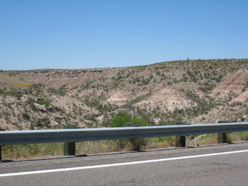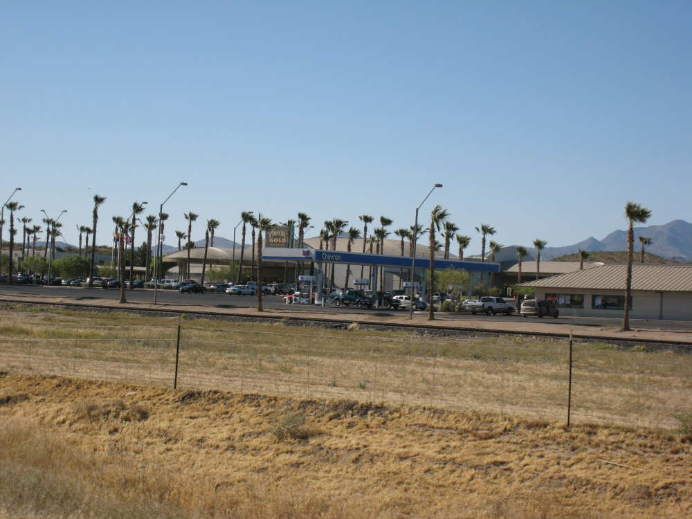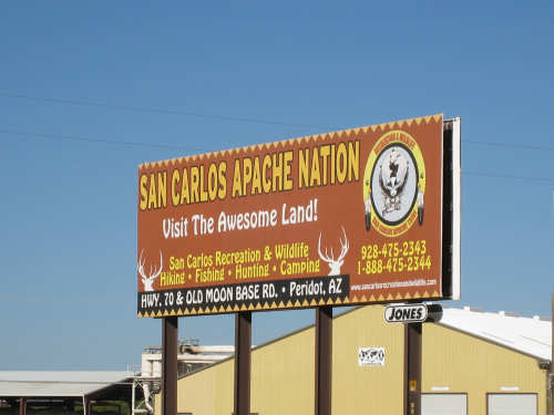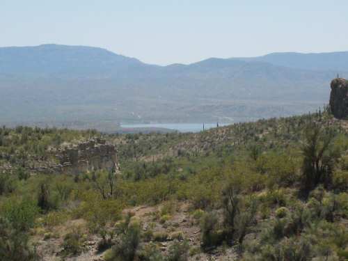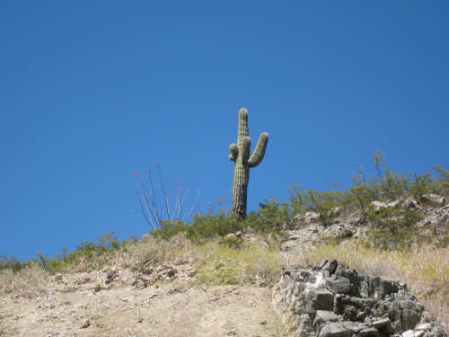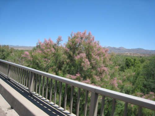 Friday, May 02, 2008 The Arizona wind gave us a break today. After 2 days (luckily, one of them was our rest day) of gale-force intensity, the winds were fairly calm today. We had been worried that our 77.5-mile day with 2 long climbs would have taken forever; as it was, it only took 11 hours. We hereby thank all the powers that were responsible for the reprieve. May they continue to be so kind. We also had an easy day navigation-wise - we were on US 70 all day. All in all, it was a good road, smooth, wide shoulder most of the day and not too much traffic. There was an alternate route that would have taken us on a rougher road with more climbs and would have had us camping around the lovely San Carlos Lake. As it was, we did see a glimpse of the lake from our road and we get to sleep in a motel bed tonight. We were pretty happy with our choice. We left Safford at 6:30 this morning and passed through the towns of Thatcher and Pima in rapid succession. All 3 were lovely towns with lots of stores and industry. We then passed several farms, most of which had hay growing in the field at various stages of production from just-plowed to ready-to-harvest. We saw a couple of fields being irrigated and fertilized. Both used a company called Fertizona, whose plant we had passed just outside of Pima. The Gila River ran along beside us for a good part of the day, between the farm fields and the mountains behind them. Several "washes", as they were called, ran from the Gila towards and under the highway, but nearly all of them were dry. The landscape was primarily mountains in the distance, canyon along the Gila River, and fields or scrubby, semi-arid shrubs and plants next to the road. We reached our first watering hole after 22 miles in Fort Thomas. The store was another one of these all-purpose stores, a combination gas station-restroom-grocery-hardware-pawn shop. The woman who ran the store was well acquainted with the Adventure Cycling groups that came through regularly and we had a pleasant chat with her. Soon after Fort Thomas, we entered the San Carlos Apache Reservation where we would be for nearly all the rest of the day. The reservation starts just before the town of Bylas which had an Apache Market - a new-looking grocery store staffed by Native Americans. We stopped for sodas mostly to support the store. We received friendly greetings and wishes for a safe trip. There were no other places to stop until the town of Peridot, some 25 miles later. Peridot was just before the first of our 2 long climbs and we saw the road rising up ahead of us as we stopped to refuel. We had several other friendly comments and inquiries about our trip there. Someone who saw us taking a picture of a nearby mountain told us it was called the Triplets (because of its 3 peaks) and said there was a road we could take up to it, but we had to pass on that. As we started up the hill out of Peridot, we passed a parked pickup truck with 4 young kids in the back who laughed delightedly at our bike and waved enthusiastically. Several cars who passed us beeped and flashed V-signs or waved as they went by. We didn't see many houses or farm animals, mostly very rough terrain with the usual desert plants and a few cute little lizards that darted around the rocks near the road. We saw warning signs about cattle every 5 miles for 20 miles, but didn't see a single cow. We did see a rabbit once, and several small birds, lots of pretty wildflowers, and lots of saguaro cacti - a couple of hillsides were covered with them! Near the end of the reservation there was an Apache Gold Casino and Resort - a big spread with several buildings, an RV park and a Best Western motel, surrounded by lots of tall palm trees. About 4 miles later, at the end of our second climb, we reached the town of Globe, our destination for the night. The elevation at Safford had been 2,920 feet; Globe's was 3,544 feet, only 500 feet higher but we had put in a total climb of 3,500 feet with all the ups and downs along the way. We arrived in Globe at 5:30, doing 77.5 miles in a little over 8 hours of bike time, a fairly respectable average, we thought, given the circumstances. |
