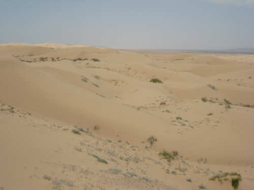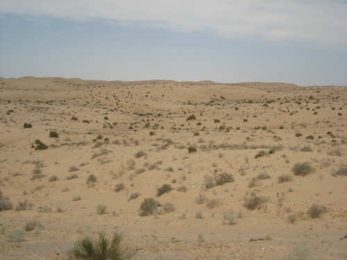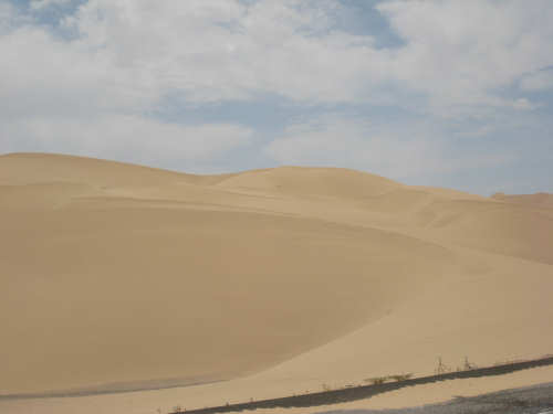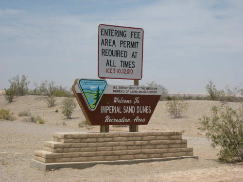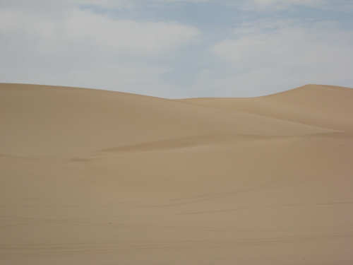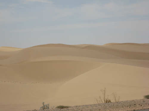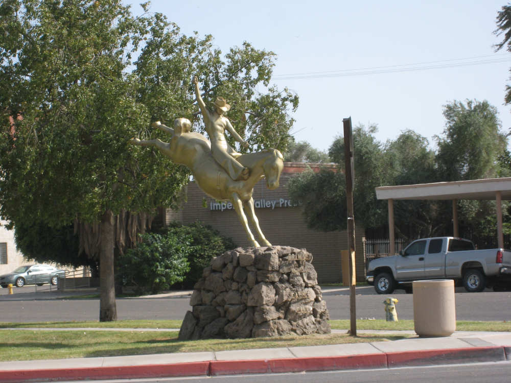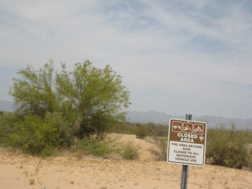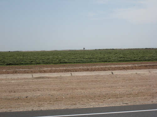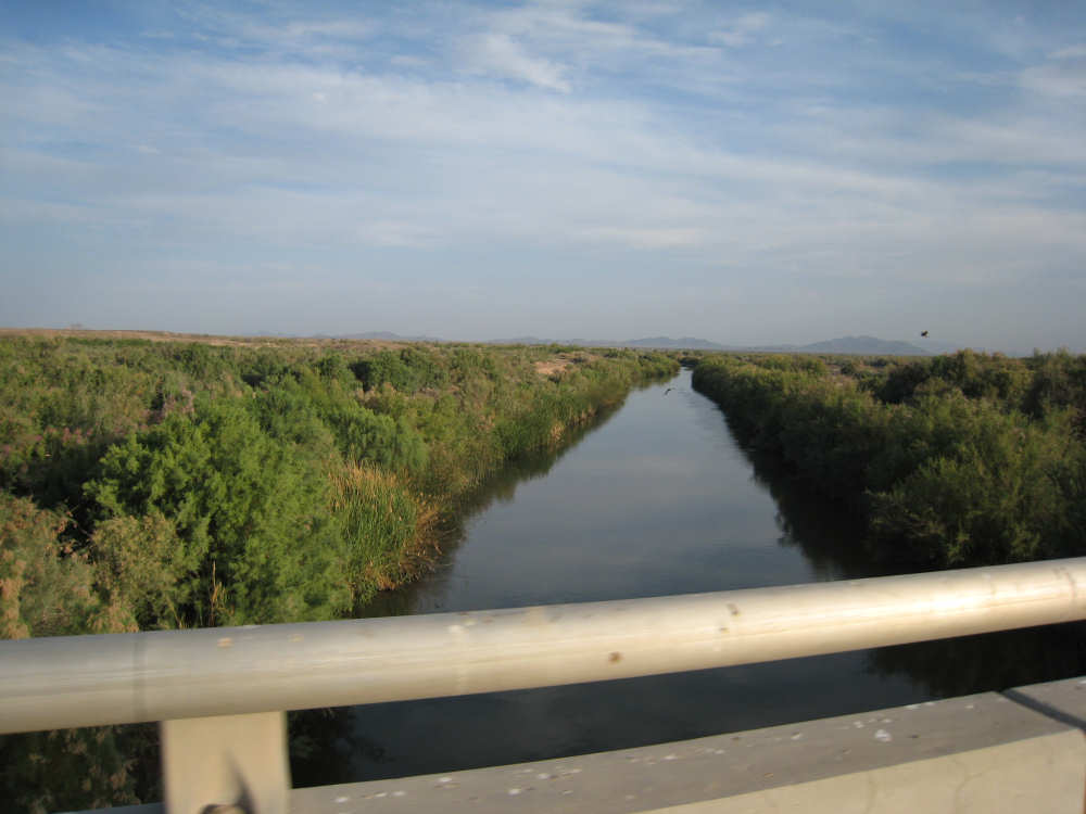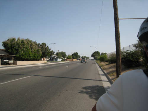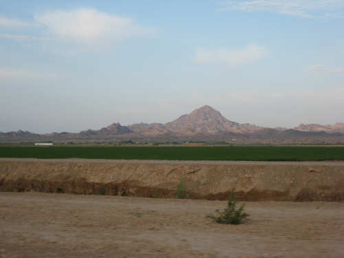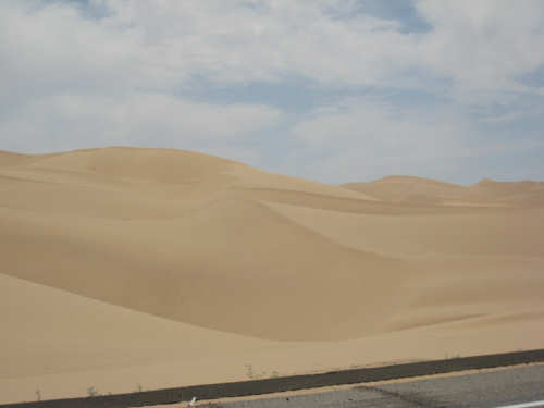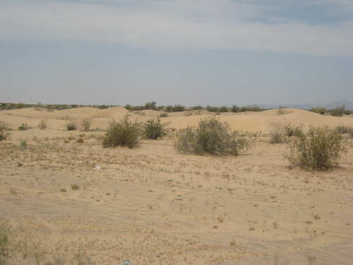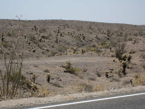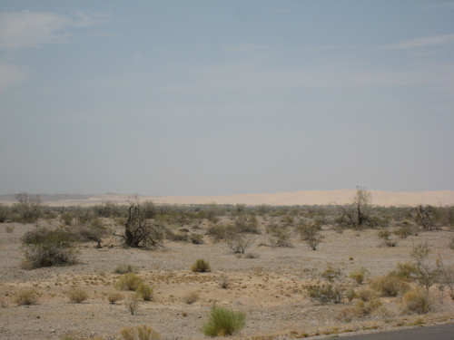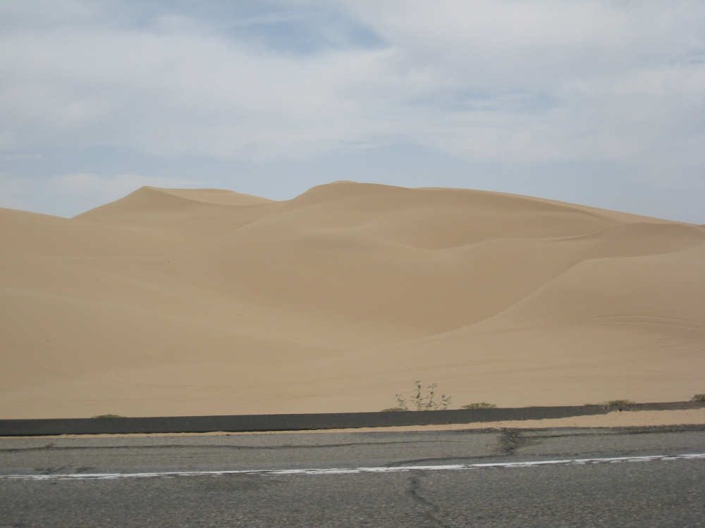 Friday, May 09, 2008 Big day today. We hadn't decided last night whether to stop at Brawley today (67 miles) or go all the way to El Centro; we thought we'd wait and see how the day went and decide when we got to Brawley. We started at 6:20 this morning to get as much of the cooler morning temperature as we could and to make sure we didn't end too late, even if we went to El Centro. Our nearby restaurant didn't open until 8 so we had 2 of the sandwiches we had bought for the day and a couple of little carrot cakes for the energy. We left before most of the town was up, but we passed a group of kids waiting for the school bus to take them to school in Blythe, 20 miles away. A parent waiting with his kids told us this and he looked concerned when we told him we were going down Rt. 78 to Brawley - he told us to be careful, that the road was treacherous. We only knew it was a difficult road, but his warning was a good reminder that we needed to be extra cautious. We started out pretty easily. We passed the Colorado River at the Palo Verde County Park. The Cibolla National Wildlife Refuge also extended to our left around that area, but we didn't see much of that. We went along the Colorado River for several miles but didn't see it again after the park area. To our right was the impressive Palo Verde Peak and the Palo Verde Mountains that it was a part of. We passed the Palo Verde Outfall twice; this was a wash from these mountains. There was a wide area called the Milpitas Wash which was covered with dark gravel. It looked like it had been carefully smoothed out - hard to tell if it was natural or not. There were signs in this area, and later ones similar to it, stating that motorized vehicles were restricted to designated areas, presumably to protect the fragile desert ecosystem here. The terrain was rugged, mountainous, and sparsely covered with the usual desert plants. The road was mostly uphill but with a rollercoaster set of dips and rises. The shoulders became quite narrow and the sight-lines were short because of all the dips. It was fairly slow-going and we were glad we were hitting this stretch while we were fresh. After about 30 miles, we finally started to go downhill more than up, so we picked up some speed. When we went by the Chocolate Mountains, so called for their deep brown color, we also entered an area designated the Naval Reservation Aerial Gunnery Range. We saw big piles of dirt and big dump trucks going up and down one of the big piles, dumping more dirt. We were confused as to why a gunnery range would need to have these big piles of dirt, but later realized that there was also a large mine in this area. We weren't sure what the relationship was between the two, though. Shortly after we passed the gunnery range and mine, we entered the town of Glamis, which was nearly deserted (no pun intended). It turns out their sole purpose was to support the dune buggy enthusiasts who flock to that area for the winter season, which had recently ended. We got some drinks at the convenience store in town and ate two more of our sandwich supply. We had come 40 miles at that point in about 5-1/2 hours, which given all the hills, seemed pretty good. Then the best part started - the sand dunes. We had been a little nervous about this area because the wind was a bit stronger today, so we were concerned that there might be a sandstorm. But we didn't have any trouble. The sand dunes were spectacular. Just like many of the mountains we'd seen, they had varied and interesting shapes, little valleys where a few desert shrubs grew, sharp peaks and rounded hills - we just couldn't stop taking pictures. The most interesting dunes were to the left (south side) of the road, The north side was a protected area where no vehicles were allowed. It was interesting in that there was a lot more vegetation on that side, even though it was just as sandy. The dunes went on for about 7 miles. They slowly flattened out and became less barren, until finally the terrain looked a lot like it had before the dune area. Shortly after that, we entered the Imperial Valley, a lush agricultural area that is below sea level! Here we passed huge crop fields, mostly growing hay it seemed but also other crops, an orange grove, a palm tree nursery, and a large cattle feedlot. We entered the town of Brawley, pretty hot and tired at this point. It was about 3:30 and 93 degrees and we had come about 67 miles. Brawley was packed with cars too, so it was not exactly relaxing. We stopped at a Mexican restaurant to rest, cool off, get something to eat and decide whether to chug on or find the nearest motel. We were greatly refreshed by our meal and large Cokes and decided it was still plenty early to go another 15 miles. We almost regretted the decision pretty quickly, though, because the wind had picked up a lot at this point and we were battling it nearly every inch of the way to El Centro. Luckily, the road was still good and had a decent shoulder; the traffic was still fairly heavy, so it still felt pretty hectic. We were very glad to see the motel we were aiming for, and it turned out to be a very comfortable one. We ended up at 82 miles in 8-1/4 hours of bike time; a perfect 10 mph average. Tomorrow, we go from sea level to 4000 feet in about 20-25 miles. It will be about half the length, but probably take just as long. |