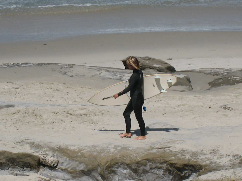 It's a beautiful day here in La Jolla - the May Gray blew away early this morning and it's been bright and sunny ever since. We may stay here forever. It's just too beautiful and relaxing to leave. We went for a walk along the ocean this morning and saw a number of other people enjoying the weather, the ocean, and the beauty of this place in general. People were jogging, walking dogs, sitting on benches watching the waves, playing on the beach, and surfing. We watched one surfer come off the beach and walk into his home across the street! What a life! We've heard that work here follows the surf - when the surf's up, work stops and people hit the beach. We saw a group of guys doing landscape work (THAT is a thriving business here) take a break and walk across the street to watch the ocean. It is very seductive. Like I said, we may have to stay here forever.