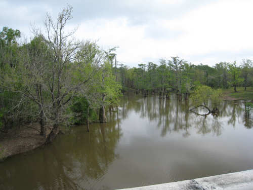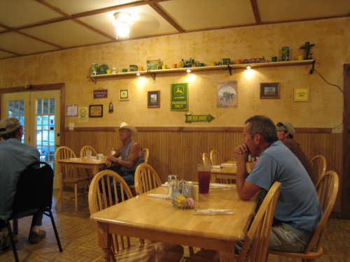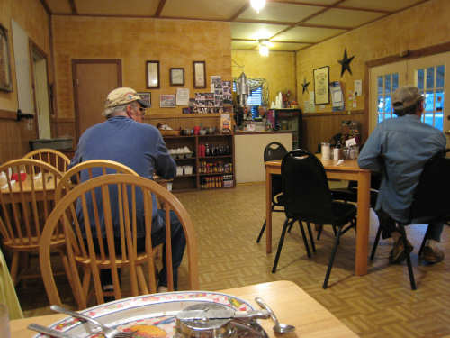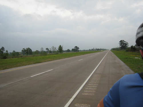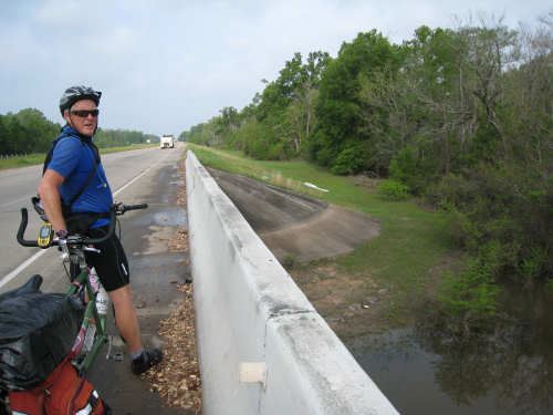 Friday, April 04, 2008 Rough day. We had 80 miles to go and knew that about half of them would be on rough rough roads, so we started early with a good pancake breakfast at a cafe down the road from our motel. The cafe was a neat place and the regulars were all sat around talking about cows, hay, farm equipment, and stuff like that. As you can see, most of them were not all that young, but they were actively engaged in their work. They were a friendly group and when the owner/cook came out to talk to us about our trip, they all took an interest. They warned us about the weather coming up and wished us well on our travels. It was drizzling a little when we started out but had pretty much stopped by the time we finished breakfast (7:30), so we strapped our rain jackets to the trailer and headed off. It felt nice and cool. We knew we had 40 miles on good road - Hwy. 96, a wide, smooth road with a good shoulder, so we breezed along trying to make the best of our time on the easy part. It got a little windier after the first 20-25 miles which slowed us down a bit, but we made really good time before we hit the tricky part. The problem was basically that Winnie, our destination, was easy to get to if you were in a car and could go on the interstate. If not, there was no easy way to do it. So, the Street Atlas had given us a detailed set of back roads to go on. The first road we turned down wasn't bad, but it soon deteriorated to a rough surface. However, we really got discouraged when the road we were supposed to continue on turned out to be a dead end. We tried a few alternative roads but none of them went anywhere. We finally asked some guys doing concrete work at a new house there and they confirmed that we had to go back to our turn-off and go a little further south to pick up another road. Since we had already come about 5 miles from the main road, we realized that we had just added about 10 miles to an already long day. We stopped at a gas station when we got back to the main road to verify our new directions and got a lot of great help from the customers there. They gave us detailed directions on the quickest way to Winnie from there. One lady even handed us a map of Texas to help us find our way. So we set off on our new trail. The wind had picked up a lot by then and we had a hard time against the strong head winds. A lot of the road was Hwy. 90, a rough surface, heavy traffic, no-shoulder road, which also made the afternoon pretty unpleasant. It still hadn't rained, though, so at least that was in our favor. We stopped again at a gas station when we had about 20 miles to go and the guys there told us about another short-cut. We're not sure it was really any shorter, but it got us off Hwy. 90 sooner, so that was a plus. The winds were still strong, and we could see some very, very dark clouds north of us, but we were hoping we had missed the rain since we were heading south-west. In fact, as we headed south, it seemed we were just skirting the rain clouds, but then the road turned west and we went right into the rain, about 15 miles from Winnie. After about 5 miles of getting drenched, we turned south again, the rain lightened up and the wind was actually at our back for once! We sprinted down the last 10 miles and finally got to our motel at 5:45, after 91 miles, and 7 and 3/4 hours of bike time. We took a warm shower, threw all our wet clothes in the washer and headed out to dinner. With all that weather and navigation to deal with, we didn't get many pictures in, but here they are. |
