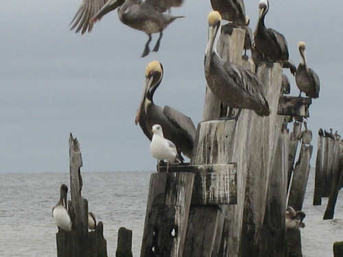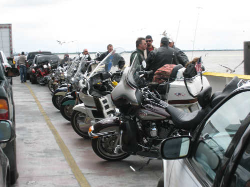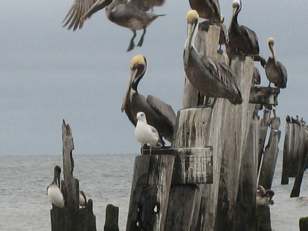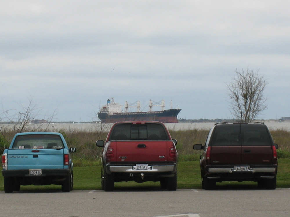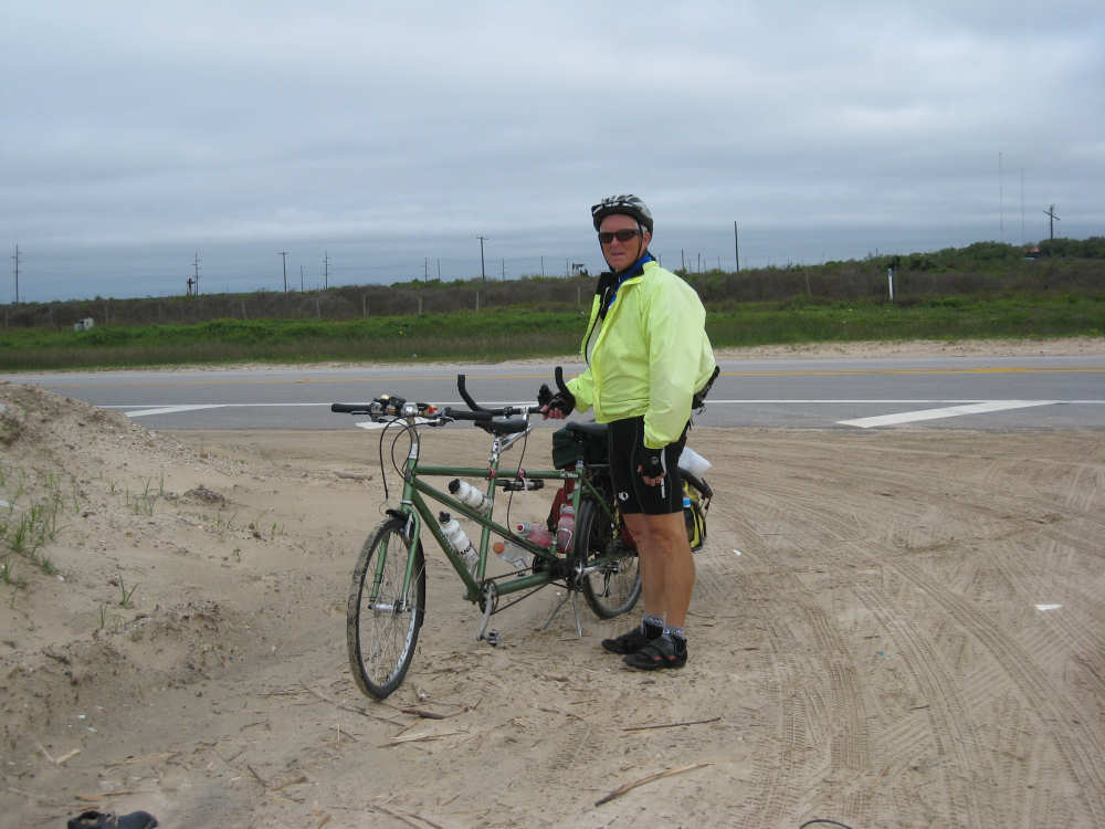 Saturday, April 05, 2008 Today was a much easier and more interesting day. The weather was dry but overcast and chilly when we left at 7:30 this morning and stayed that way until we got to Galveston. The road was smooth and simple for the most part and we even had a tail wind a lot of the day. The scenery was enjoyable - mostly large, grassy fields with some cattle and horses and lots of wildflowers. There were large swaths of pink primroses, red Indian Paintbrushes, purple Lyre Leaf Sages, blue Four o'clocks, white daisies and spider lilies, and various yellow flowers. We also went by lots of honeysuckle, inhaling its heady scent. We went over a bridge to the area called High Island which had an interesting marker giving some of its history. This area is a major migratory bird sanctuary and is visited by many birders each year. We were now on the Bolivar Peninsula, and finally saw the Gulf Coast; we stopped for a minute by the first beach we came to. There were some campers on the beach (not an official campsite, but apparently not an uncommon occurrence). There were also several large pelicans roosting on some wooden pilings in the water. They let us come fairly close so we kept inching up on them, taking pictures as we went. Some of them flew off as we approached, but many stayed, seemingly unconcerned. We continued down Route 87, passing more large fields and wildflowers, and went through a few small communities with houses up on stilts. Clearly, the water often rose a lot higher than it was at the moment. We stopped for lunch at a place in Crystal Beach with an interesting shop across the street. A local artisan had many of his woodcarvings on display, mostly cut out of trunks of palm trees. It was still chilly, overcast and damp-feeling and we were getting antsy to get to the ferry when it finally came into view. There was not a long line when we got there, and we were directed to a spot out of traffic to wait for the ferry to arrive. By the time the boat came, a full boat-load of cars had lined up. We went on last and parked at the back over to one side. The ride was uneventful but interesting; there were various boats in the harbor and in the channel, from sailboats to tankers. There was a group of motorcyclists from Louisiana who were headed to Houston for a big bikers' barbeque picnic. There were swarms of sea gulls that followed the boat; one boy was feeding them by throwing bread crumbs in the air - the gulls were good at catching them! We also saw another black bird, which turned out to be a grackle, that we'd seen a lot both yesterday and today. When we landed in Galveston, the clouds were beginning to break up and the afternoon became quite sunny and warm. We had a very pleasant ride through Galveston with its large stuccoed houses, lots of palm trees and other lush plants, interesting shops, and fancy motels and condos. We rode along the beach for a long time and enjoyed watching the people strolling along the beach and the concrete boardwalk, and the waves rolling up onto the beach. We continued on another 10 miles past the end of town into Jamaica Beach where we were to camp at the Jamaica Beach RV Park, a lovely campground with great facilities - a pool, hot tub, club house, bathrooms, showers, and laundry. We arrived by about 4 pm, set up our tent, had some dinner and worked on our website and tomorrow's route until it was time for bed. Tomorrow we'll be in Houston, at Sarah's house, visiting with her and her husband Steve, and the grandkids, Amanda and Rand. |