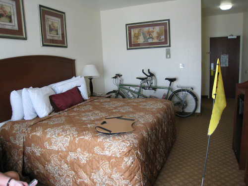 Thursday, April 10, 2008 We sort of wimped out again today. We were going to follow the Adventure Cycling route to Austin, which included going through a couple of state parks and other scenic spots. But when we looked at the route last night, it looked so complicated, long (71 miles), and hilly, it made us feel tired just looking at it. Besides which, we were camping out, and the weather predicted thunderstorms over night and the next morning, and gusty winds all day, so we figured we'd have to pack in the rain, we'd get a late start, and we'd have to pick out this complicated route in the rain. Then we realized that we could get to Austin by just going on SR 71, the road we ended on yesterday - simple, less hilly, and shorter by 11 miles! OK, less scenic and less interesting too, but that didn't seem enough to tip the scales at the time. So, SR 71 it was. It turned out the weather wasn't that bad - it was windy all night but didn't rain at all. It was cool and humid when we packed, it only drizzled some for a while when we were on the road, and the wind wasn't bad at all. But I think we still made out fine, the road was scenic enough with all the wildflowers along the sides and in the median, and it was definitely easier. The traffic was bad in a couple of spots - by the town of Bastrop and at the end when we got into Austin. The only time we didn't have a wide shoulder was in Austin, where there was 3 lanes of fast-moving traffic with almost no shoulder. But the drivers were respectful of us and we got through fine. We passed through the town of La Grange (where we spent the night) and found it to have a very nice-looking downtown. It also seemed to have its priorities straight - one of the side roads had been built around a gorgeous old tree rather than cutting it down! La Grange, and in fact, the RV Park we stayed at, is the stopover town for the big MS 150 mile tour that runs between Houston and Austin every year. It's scheduled for this Saturday and Sunday, and we saw lines of Port-a-Potties at a number of places along SR 71, in preparation for the crowds. It's a huge event, about 13,000 riders; we were glad we timed our visit just ahead of it. We went over the Colorado River 3 more times today - it seems to curve around a great deal. At one crossing, we saw hundreds of small birds zooming around and chattering away cheerily. The roadside was quite lovely most of the time; we had blankets of Indian Paintbrush and Evening Primrose, some white flowers, and scatterings of Blue Bonnets and several other pretty flowers. There were lots of trees, including some pecan trees apparently - pecans seem to be a major crop here - some cattle ranches, other huge fields with crops just starting, and a few towns here and there. Bastrop was the most significant town we saw before Austin, and we stopped there for lunch at a Mediterranean restaurant. We came into Austin at 60 miles in less than 5-1/2 hours. Even though we left the campsite at 8 am, later than usual and without having had breakfast yet, we arrived at our motel at 4:20. The motel was the poshest (and most expensive) we've stayed at yet, so we had to take a couple of pictures of that too. P.S. I've updated yesterday's wildflower photos with names, if you want to check back. |