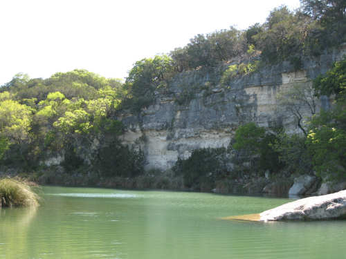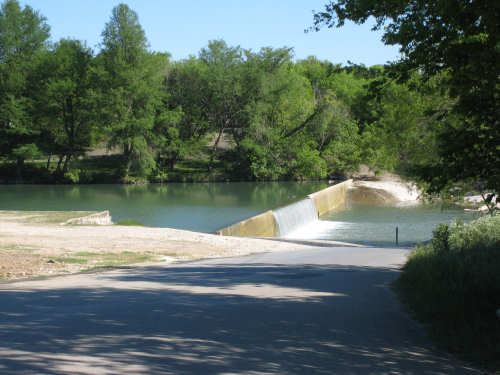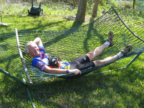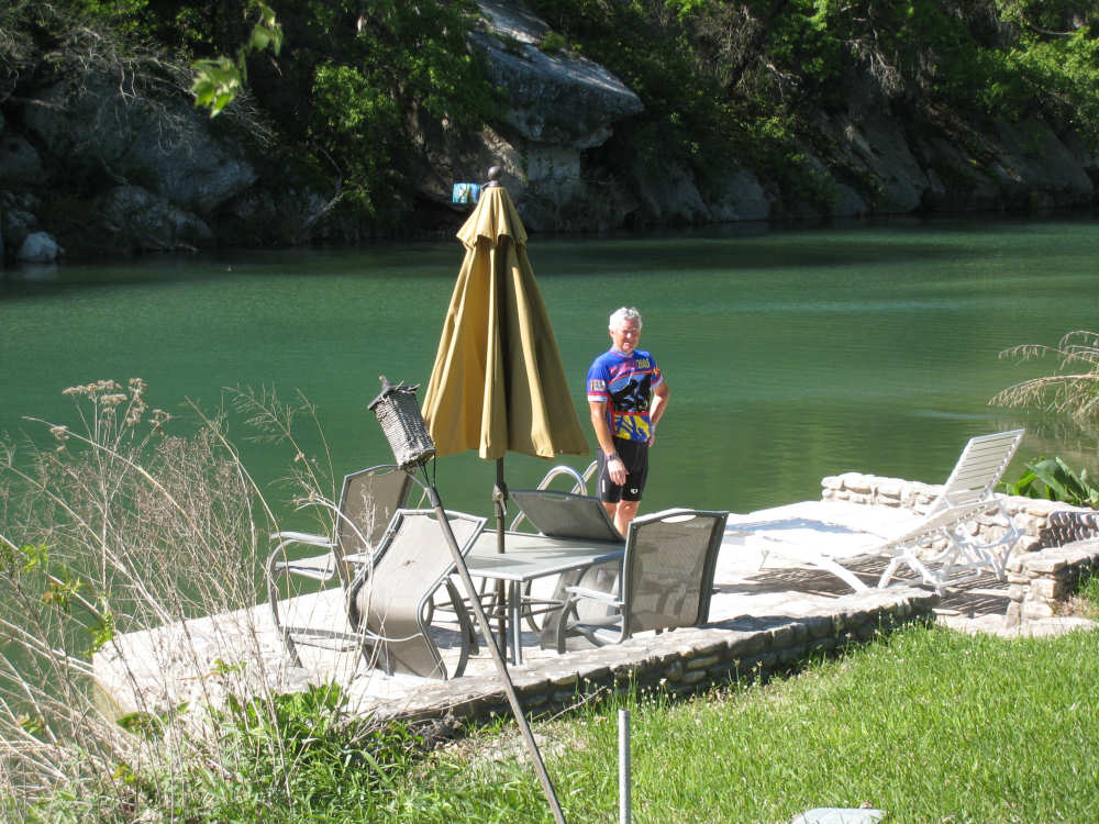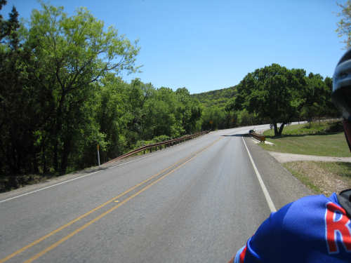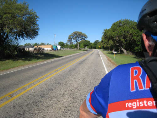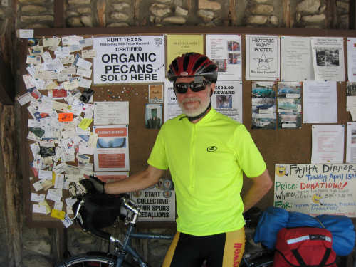 Sunday, April 13, 2008 It was very cold when we got up this morning which made it very hard to get going. The tent was very wet from condensation, too. Luckily, we didn't have far to go for breakfast, just a mile down the road into downtown Comfort. We sat next to 2 guys who were dressed in fancy cowboy wear, which we didn't think was too unusual, but when we got to talking with them it turned out that their "hobby" as they called it was to travel around to shows and do wild west action shows. The older gent was a 3-time world champion and 4-time national champion in the Single Action Shooting Society markmanship contest. He had an alias or show name of Ed Sieker, Texas Ranger; Mike's show name was Ranger Star. They were both very pleasant to talk with. We started down State Road 27, a nice, smooth road with a good shoulder - a nice, easy way to start the day. Pat kept noting that we could take this road all the way to Ingram, a good 2/3 of our day's route, but we turned off onto the more scenic (read: narrower, bumpier, more complicated) Adventure Cycling route. It was pretty: we went down to the Guadalupe River - a beautiful, clean, spring-fed river that started somewhere in this area and went down to the Gulf Coast. We went along the river most of the day, crossing it several times. There were several dams along it, so the water level changed from one place to another but it was fairly high for the most part. There were several spots with canoe & tubing rental places, and we saw several families and kids enjoying the river - canoeing, fishing, wading, and so on. The roads were narrow and tree-lined with little traffic, but the bumpiness really detracted from our enjoyment of them. We went through 4 towns today - Center Point, Kerrville, Ingram, and Hunt - all of them tiny except for Kerrville, the Kerr County county seat. Center Point had a few historic buildings. Kerrville was not very impressive except for a few lovely buildings, churches, and the court house. We stopped at a McDonalds there to use the bathroom, but realizing it was lunch-time, we had some lunch as well. There was an amazing mural inside that I got a picture of. We decided to pick up something for dinner in Ingram since we heard there was nowhere to buy food after that. We stopped at a small food market and got a small jar of peanut butter, some crackers, and some tuna fish lunch packages, but it didn't seem much like dinner. A local policeman happened to come into the store at that point and we asked him if there was a place that made sandwiches to go; he directed us to a little place called Spirit Wind Java where we got excellent chicken and roast beef sandwiches. So we made out all right for dinner and we still have the peanut butter and tuna fish for tomorrow, when we won't be going through any towns at all (that should be interesting). After little Ingram, which had started right where Kerrville left off, it was only about 6 miles to tiny Hunt. It was clearly an area with some money, though; the houses along SR 39 were all quite grand. There was still a lot of pretty hill country scenery around, though, and still the same bumpy road surface. The road surface slows us down considerably besides being pretty tiresome to ride on. We stopped at The Hunt Store in Hunt (one of 3 or 4 buildings in town) to get a cold soda and found another touring bike parked outside. Inside the store, we found Zig Sondelski from Utah, who was traveling the same Adventure Cycling route eastward. We traded stories about the route, the hills, the bumpy Texas roads, and so on. Five and a half miles later we arrived at the Sundown Carriage House Bed & Breakfast, which we had decided to splurge on so we wouldn't have to spend 3 consecutive nights in a tent. It is a lovely place, run by a very hospitable couple, Al & Sandra, who have been very helpful and accommodating. The house fronts onto a very lovely stretch of the Guadalupe River. The only drawback was that we didn't have a cellphone or internet connection, so we won't be able to update our website until tomorrow at least - sorry, fans! A couple of comments about yesterday's post. The stone we thought might be limestone seems, instead, to be sandstone and is very prevalent in this area. Also, I didn't explain very well the significance of the flood gauges by the dry creek beds. Apparently, the creek beds and ditches dry up in the dry seasons but can fill with water very quickly in the torrential rains that often come through here. It rains so hard that the ground can't absorb it and the low-lying roads often become badly flooded. We felt very lucky to have come during a dry spell. |