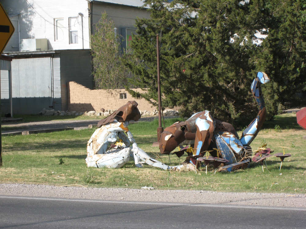 Friday, April 25, 2008 We slipped into New Mexico today. We didn't get a Welcome to New Mexico sign, unfortunately; we saw a New Mexico State Line sign but we didn't go into New Mexico at that point. We skirted the edge of the state for a while and turned into it further north, but there was no clear indication of exactly when that happened. We hate when that happens - takes all the excitement out of entering a new state. But in any case, we're here in our 13th state, and so far it's been beautiful. We started early this morning and had breakfast at a McDonald's a mile up the road since nothing else was open at that time. We headed out from breakfast at 6:40, proceeding north through El Paso. It quickly became apparent that the north end was the ritzier side of town - large homes (some nestled on the mountain side), walled-in subdivisions, high-end shopping centers. Our road was called Country Club Drive for one stretch, then it veered to the right following the New Mexico border and the grand houses slowly changed to more modest homes and finally farm fields. Many of the modest homes were lovely as well, though, most of them having a Southwest look of stuccoed walls and protruding beams. As we continued on into New Mexico, the Southwestern look intensified; several houses had lush gardens in front, an unusual number had several varieties of roses as well as other more native flowering plants. The farm fields were usually large, but not nearly on the scale of the Texas farms. There were still many pecan tree groves but they went on for acres instead of miles. We saw another group of glossy ibis in one of the more heavily flooded groves of pecan trees; a drier grove had flocks of doves pecking around in it. Another major crop seemed to be onions; we saw several large fields of them at various stages of growth. Other than that, all we saw growing was hay and alfalfa, with a couple of solitary cotton plants, seemingly left over from some earlier planting. We crossed over the Rio Grande twice - it meanders along the border between Texas and New Mexico. We also passed by several irrigation ditches. They all seem to be bounded by much wider berms here than they were in Texas. The berms were tamped down on top and are obviously driven over regularly. We also saw a couple of cases where the pumps by the ditches were spewing water into them - the water looked refreshingly clear and cold. We passed through a few small towns today - Chamberino, La Mesa, San Miguel, and La Mesilla, which was right outside of Las Cruces. Chamberino and La Mesa didn't have much to offer, except for the ice cream we got at a grocery store in La Mesa. San Miguel was very pretty and had a historic Catholic Church in it. La Mesilla was even prettier, with several pretty stuccoed buildings in it, a median strip through town that had lovely plants and stones in it, and a lively air to it. We had lunch in a restaurant called Los Mariachis that had great Mexican food and beautiful Mexican serapes, musical instruments, and cute ornaments decorating it inside. The waitress also gave us a tip of a cheap but very nice motel nearby where we ended up spending the night. The real excitement today was that we got another flat, but in the trailer tire this time - first time we've ever had to change that tire. It got a big nail stuck in it which made a very discernible hole, so we decided to patch it instead of replacing it. When we pumped the tire back up, it was still leaking though. Grumbling about the patch not doing its job, we took the tube out again and noticed that the nail had gone clear through the tube and punctured the other side! So we stuck a patch on that hole, too, and this time the tire pumped up just fine. We had a short, easy day today - 45.4 miles in about 4.5 hours of bike time. It was a very slow ascent most of the day and our usual gusty head wind ( although we noticed the pecan trees did a great job of blocking the wind, which we really appreciated). We arrived at our motel at 2:20, shortly after our scrumptious lunch in La Mesilla. Tomorrow will be another short day, with more climb, though. We're trying to take it a little easy, working up to our big climb up to Emory Pass in a couple more days. |