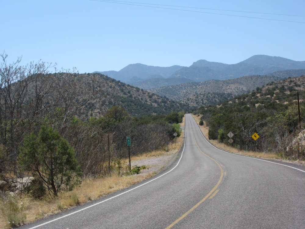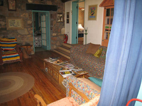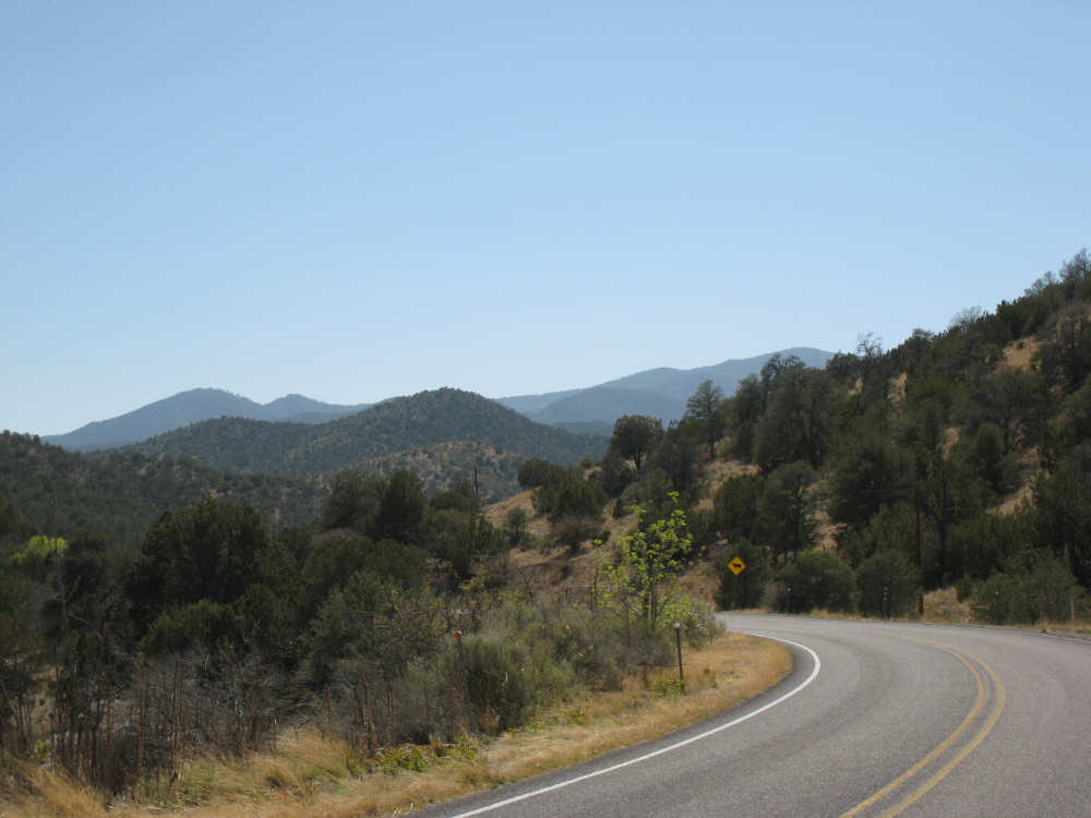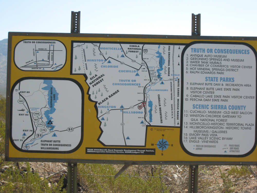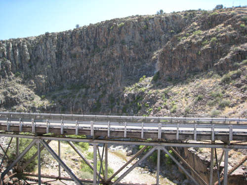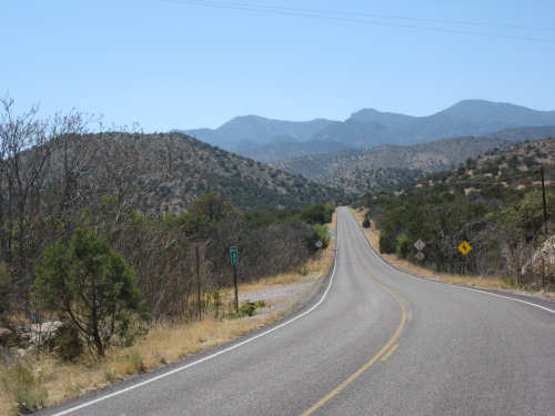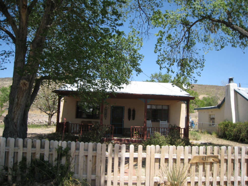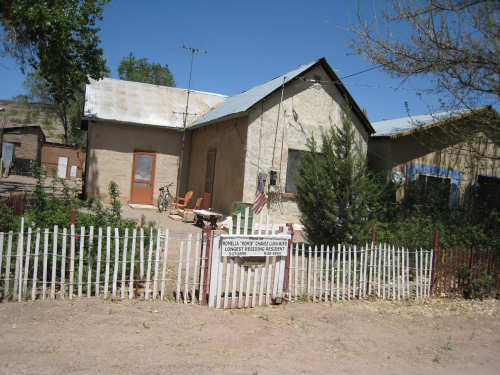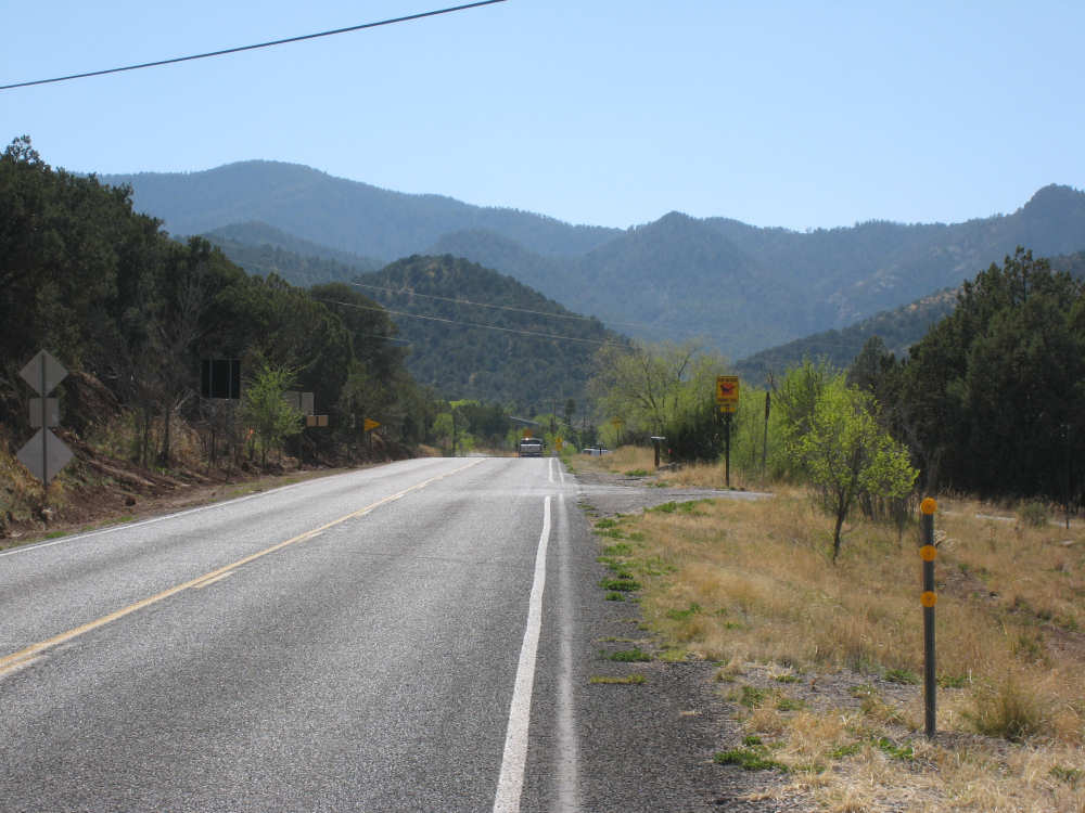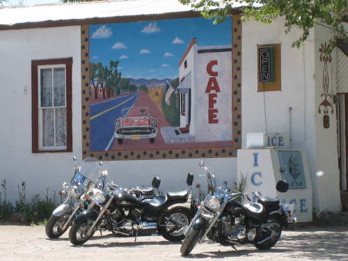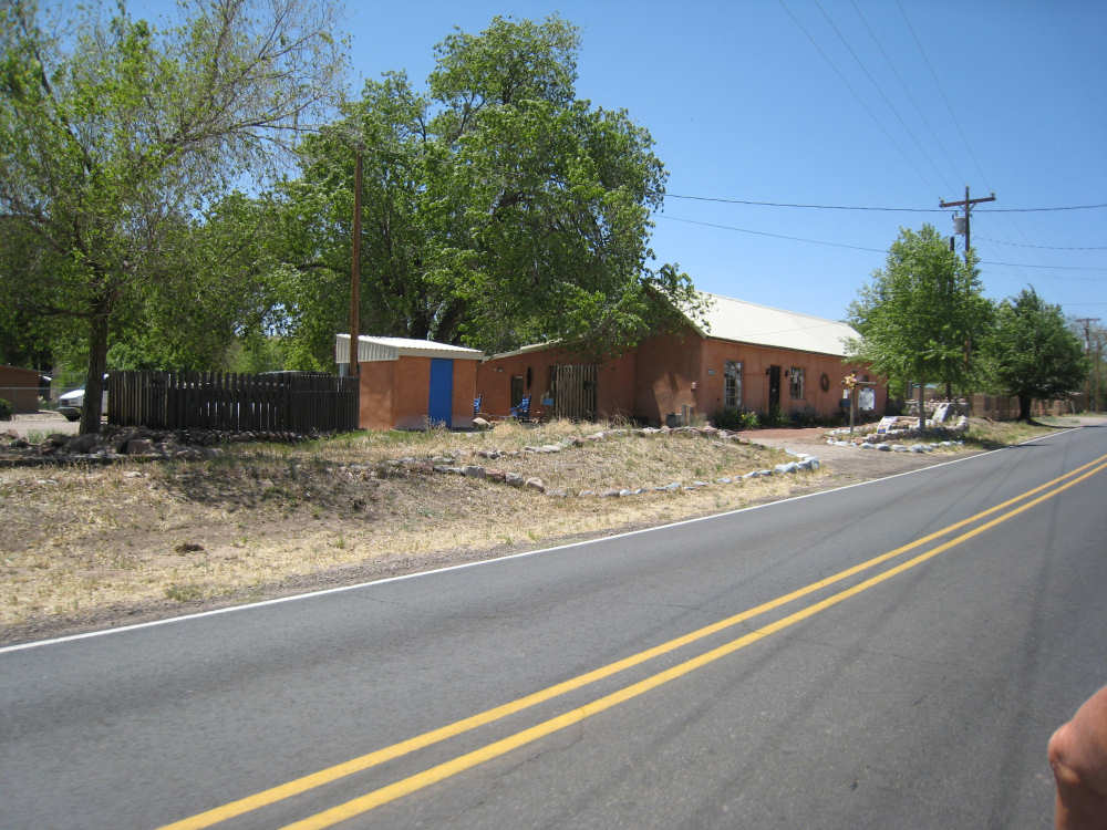 Sunday, April 27, 2008 I am madly in love with New Mexico. I hope today's pictures do it justice - it is incredibly beautiful. We left Hatch this morning at 6:40 after a so-so breakfast at a food mart (it's Sunday and nothing else opened until 8 am). We were dismayed by the wind which was blowing fiercely from the direction we would be heading. Maybe it'll die down when the sun comes up, we thought, but no, it was a good, stiff head wind all morning. It was chilly, too - 48 degrees by the first thermometer we saw, but the wind made it feel colder. We had 25 miles of relatively flat ground to cover before we hit the hills. We thought it would be the easy part of the day, but it turned out to be the hardest. We were amazed at all the birds that were out this morning, despite the wind. We saw several large flocks of them, and heard several more chattering in the trees and bushes we passed. It was one of the nicer things about the morning. We went through a few small towns, about 5-10 miles apart - Salem, Garfield, Derry, and Arrey. They were all quite small and had nothing open and not much to see, except for Arrey. As we went through Arrey, we noticed one building with a lot of cars in front which turned out to be a cafe. We went inside to warm up and have a little snack - it was about 10 am and the place was packed! We just had coffee (me), orange juice (Pat) and a couple of sweet rolls, but it was just what we needed to keep going after 17 discouraging miles. A number of folks in the restaurant sympathized with our having to deal with the gale that morning. After 25 miles, we turned west onto Hwy. 152 and the going was a bit easier. We had a side or tail wind for a while, and the wind eventually died down to almost nothing. We certainly couldn't have coped with the hills we had to climb today if we had to deal with that wind in our face all day. We did see several interesting things along the way to our turn onto 152. First of all, we saw where all the chile peppers Hatch was selling came from. We passed several chile farms, none of them had any visible plants in the ground, but it must have been early in the season. Many fields were neatly furrowed and probably planted. We also saw a field with hundreds of strange little igloos. It turned out that they were little calf sheds, many of them with calves standing outside eating from buckets. Just before our turn, we came to the Caballo Lake State Park, with a huge reservoir and just crammed with RV parks, boat storage units, and vacation homes. Our first sight of the reservoir was at the end of a very dry Percha Creek, which we would see later in the day. Our next stretch, on Rt. 152 between Caballo Lake and Hillsboro, was less hilly than we expected, with a few notable exceptions. The landscape was mostly dry scrub brush, similar to what we'd seen in Texas, with some rounded hills, and steeper hills on the horizon. We made better progress now that the wind wasn't blowing straight at us. It was very pretty and was a nice, peaceful ride. We saw our first jack-rabbit, hopping off in the brush; they're supposed to be plentiful in these parts. As we approached Hillsboro, we had a long climb that was fairly steep and curvy - very pretty - and then a nice descent into town. Hillsboro was a very interesting town with some very old houses and some very pretty houses. There were a number of little shops and cafes in the center and we had a delicious lunch at a place called the Barbershop Cafe (maybe the building used to be a barbershop?). They also sold many beautiful artifacts from local artists and craftspeople. We headed out of Hillsboro about 2:30, happily stuffed, with just 9 miles to go to our final destination in Kingston. This is when the scenery went from beautiful to absolutely gorgeous. It was quite hilly and the road wound up, down, and around stunning canyons, valleys, and gorges. The views were spectacular. We passed the Percha Creek again, this time a nice little stream, soon after Hillsboro at the bottom of a canyon. It turned up several more times as it wound around the hills. Every turn we made opened up another gorgeous scene. The climb was very slow but not so steep as to be exhausting., and it gave all the more time to enjoy all the awesome sights around us. It was definitely heaven on earth. We got to our turn off of 152 and went down a tiny road lined with rustic houses. We soon came to the Black Range Lodge (named after the mountain range it was in), a lovely old lodge from the 1800's when there was a gold rush in the area. The owners of the lodge, Kathryn and Peter, are a wonderful couple who made us feel right at home. They were hosting a couple of singer/songwriters who had just put on a concert in Hillsboro (they had seen us on the road earlier), and had a few other interesting guests in the lodge as well, including a couple of other bike riders, a father and son who had biked down the California coast from Vancouver and over from San Diego. We finished the day at 51.5 miles in almost 6-1/2 hours of bike time - our slowest average to date, but one of our most enjoyable. |
