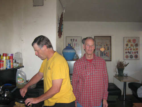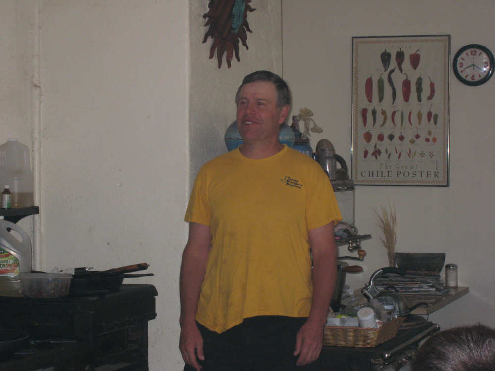 Tom, the resident housekeeper, smiles for the camera while Pete cooks up some eggs