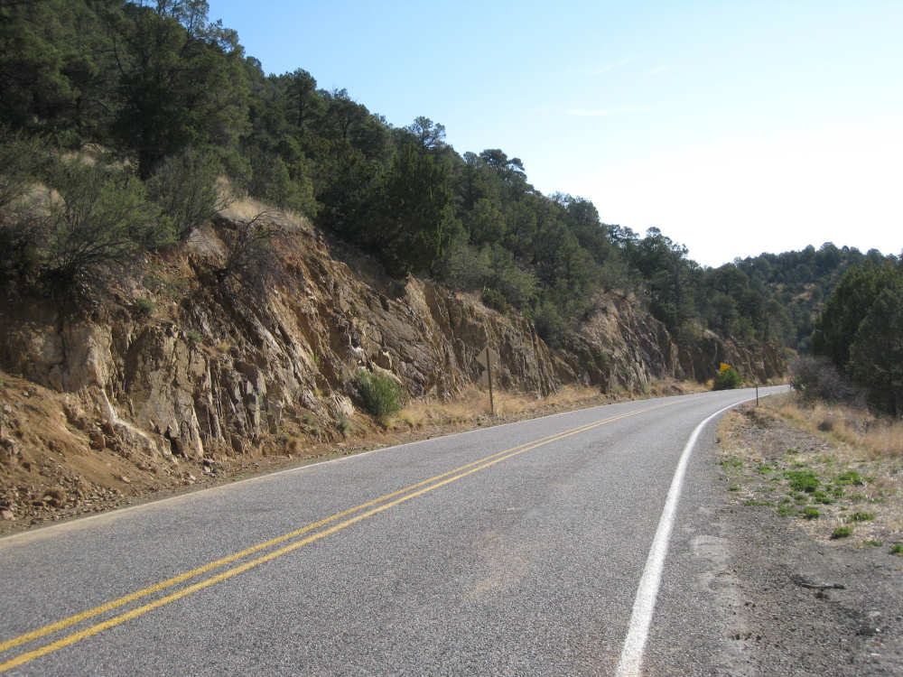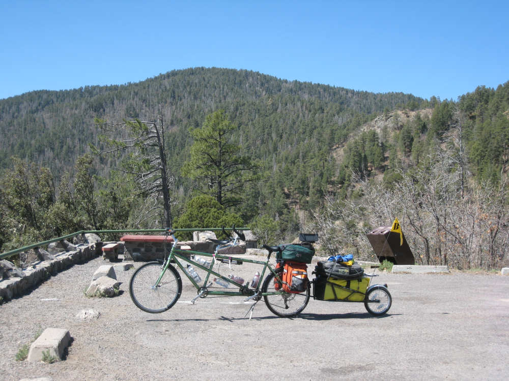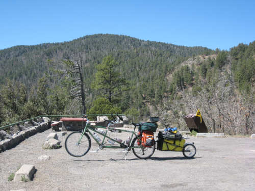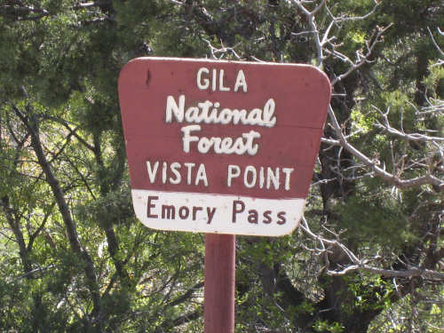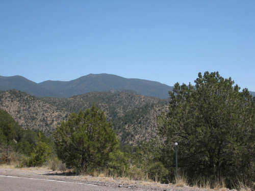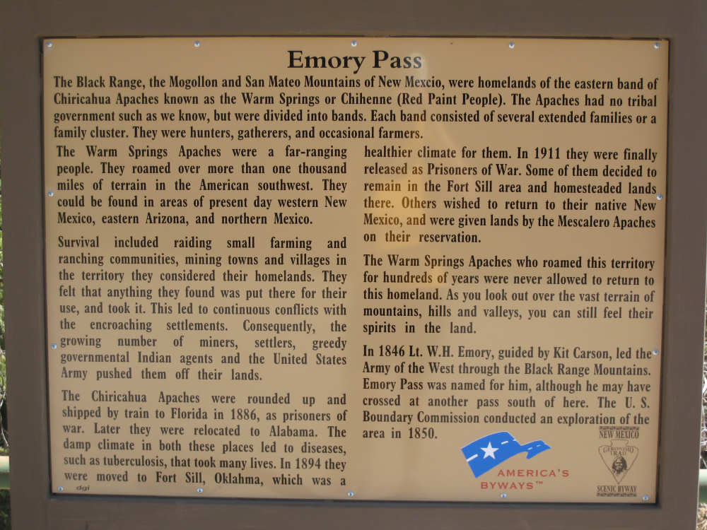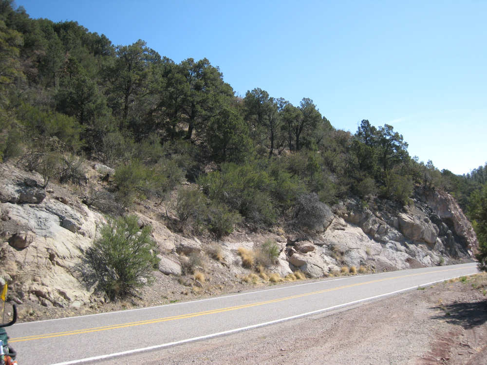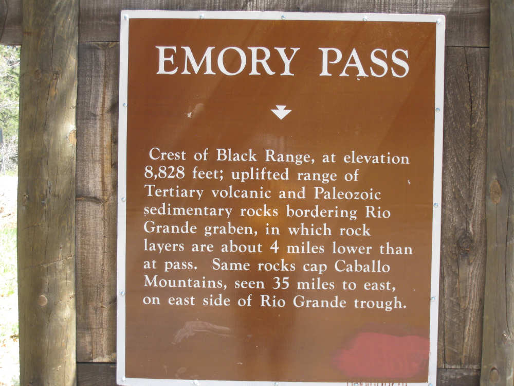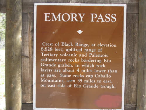 We started the day later than usual by having breakfast at the Black Range Lodge with Pete Fust, one of the owners, Tom, the resident housekeeper and cook, Debbie and Chris, the couple who sang at the concert in Hillsboro the day before and stayed overnight at the Lodge, and Ian and Taran, the father and son who were biking from Vancouver, Canada to Houston, TX. Unfortunately, Pete's wife, Catherine Wanek, did not join us for breakfast so we don't have a picture of her. They were a very enjoyable couple who made our stay very, very pleasant and comfortable. We highly recommend the lodge to anyone traveling in the area (www.blackrangelodge.com). Pete and Catherine are also experts on strawbale house construction, and Debbie, Chris, Ian, and Taran were all staying over that day for a hands-on workshop. There were a number of strawbale buildings on the premises, as well as an earthen bread oven shaped like a phoenix. After a scrumptious breakfast, we headed for the hills again, leaving at 8:40. The climb up to the Emory Pass (6280 feet elevation) was an 8-mile long climb of about 5-6% grade nearly the whole way. We had a couple of little 'rest areas' where the grade dropped to about 2-3%. It was a long climb, but again the scenery was gorgeous and it was well worth the effort. The pictures don't do it justice, unfortunately. The view from the Pass was amazing. We could see the little stretch of road that was Kingston (where we stayed last night) very clearly, then further back and to the right was the town of Hillsboro that we had been through yesterday (it's just barely discernible in the photo). And way in the back were the Caballo Mountains - we could even see a bit of the Caballo Lake beneath them. So nearly all of yesterday's journey lay there at our feet!