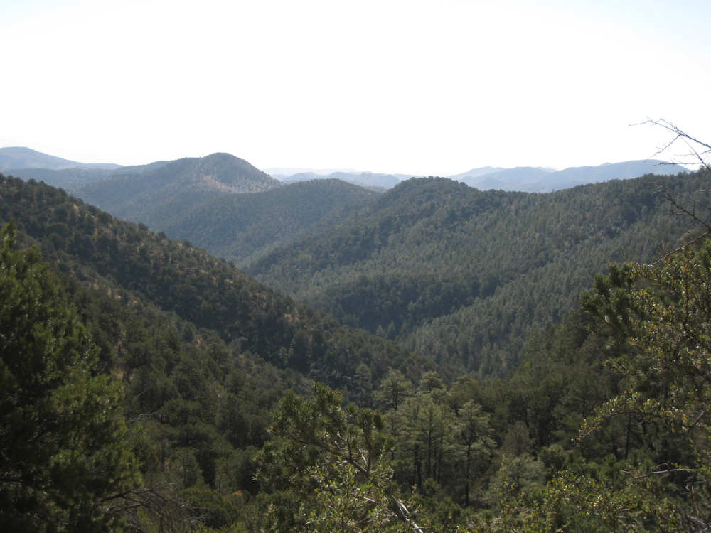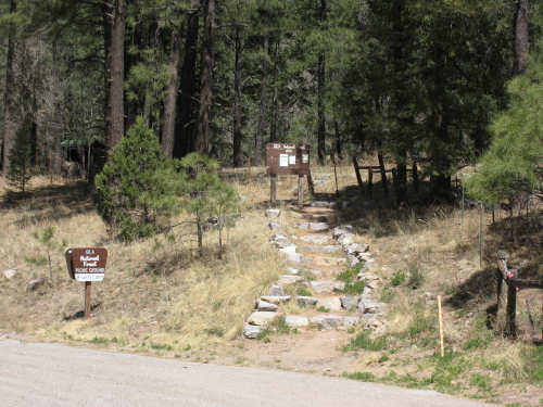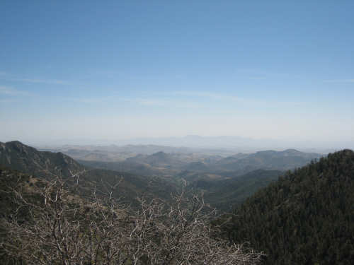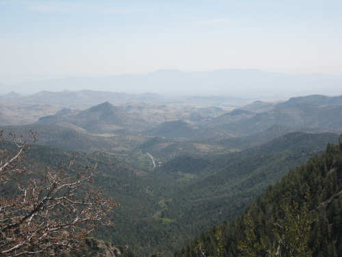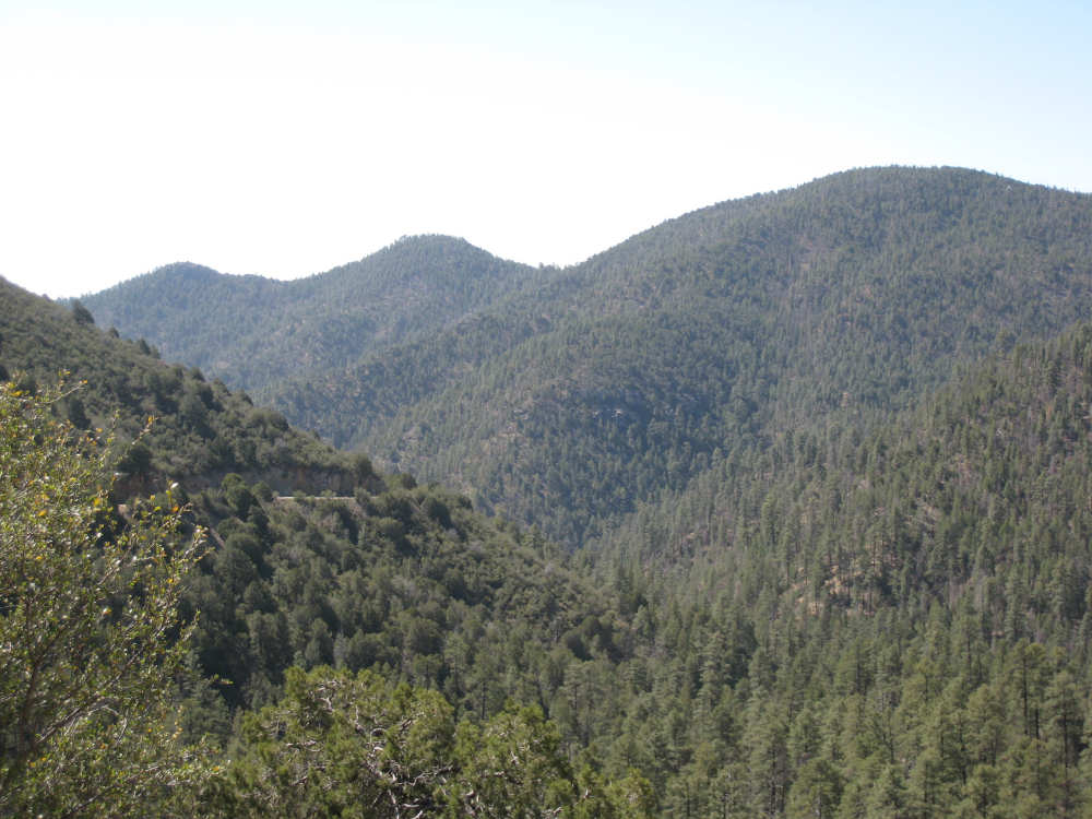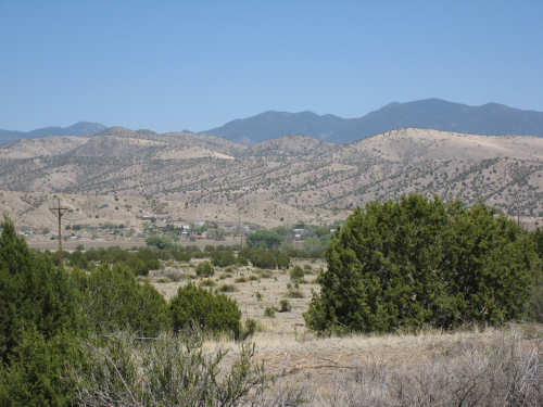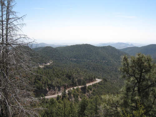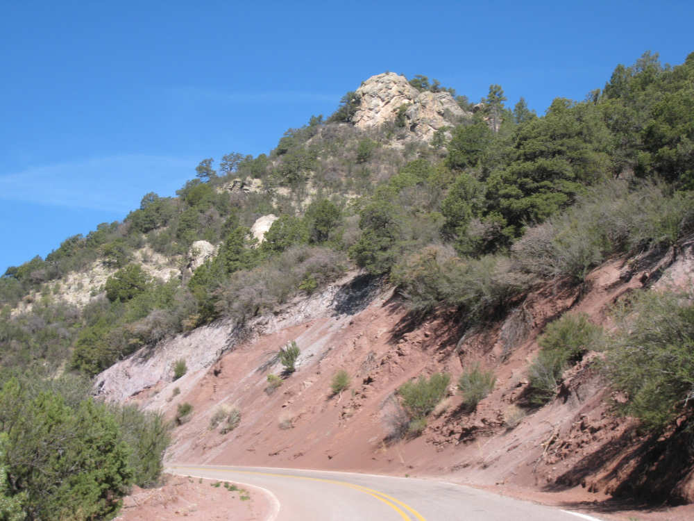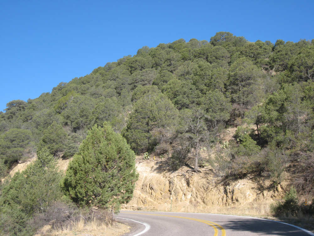 We started the day later than usual by having breakfast at the Black Range Lodge with Pete Fust, one of the owners, Tom, the resident housekeeper and cook, Debbie and Chris, the couple who sang at the concert in Hillsboro the day before and stayed overnight at the Lodge, and Ian and Taran, the father and son who were biking from Vancouver, Canada to Houston, TX. Unfortunately, Pete's wife, Catherine Wanek, did not join us for breakfast so we don't have a picture of her. They were a very enjoyable couple who made our stay very, very pleasant and comfortable. We highly recommend the lodge to anyone traveling in the area (www.blackrangelodge.com). Pete and Catherine are also experts on strawbale house construction, and Debbie, Chris, Ian, and Taran were all staying over that day for a hands-on workshop. There were a number of strawbale buildings on the premises, as well as an earthen bread oven shaped like a phoenix. After a scrumptious breakfast, we headed for the hills again, leaving at 8:40. The climb up to the Emory Pass (6280 feet elevation) was an 8-mile long climb of about 5-6% grade nearly the whole way. We had a couple of little 'rest areas' where the grade dropped to about 2-3%. It was a long climb, but again the scenery was gorgeous and it was well worth the effort. The pictures don't do it justice, unfortunately. The view from the Pass was amazing. We could see the little stretch of road that was Kingston (where we stayed last night) very clearly, then further back and to the right was the town of Hillsboro that we had been through yesterday (it's just barely discernible in the photo). And way in the back were the Caballo Mountains - we could even see a bit of the Caballo Lake beneath them. So nearly all of yesterday's journey lay there at our feet!