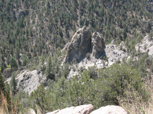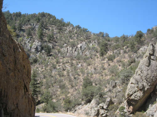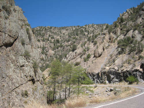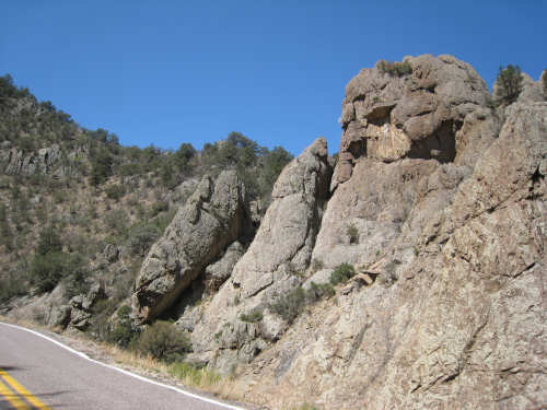 Coming down from the pass was a little harrowing. We had to brake almost continuously and stopped every few miles to let the disk brake cool down. It was as pretty as the other side of the mountain, with one valley that contained enormous boulders. The drop was longer than the climb, with one stretch of a couple of miles where we were actually going up again. We reached the bottom near the town of San Lorenzo, where the Adventure Cycling route split into two options. One went further north and covered an area called the Gila Cliff Dwellings, where there were preserved pueblos built centuries ago in the natural caves overlooking the Gila River. This route was much more challenging and we opted for the easier one going straight west to Silver City. After 25 miles going up and down the Emory Pass, the remaining 25 miles of 'rolling' 2-5% grades to Silver City were plenty challenging for us. We got to our destination about 5:20, having done almost 48 miles in a little over 6 hours of bike time, an even worse average than yesterday's low. We were lucky in that the winds were very calm today and the day was warm and sunny but not too hot.