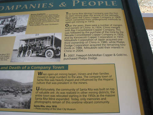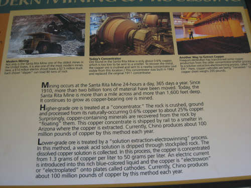 There was one special attraction on the stretch between San Lorenzo and Silver City. We passed by the Santa Rita Copper Mine, a mine that Pat's parents went by on a trip out west many years ago. Walter was fascinated by the mine, whereas Eileen couldn't see what was so interesting about a big hole in the ground. The same scenario played out today - we saw three couples there, with the 3 men hanging on the fence animatedly talking about the mine, and the 3 wives hanging by the cars chatting about other things. It turned out they used to live in Santa Rita and had come back to see all the changes since they had lived there. As you can read in the history below, the entire town of Santa Rita was relocated over 50 years ago when the copper mine went into full operation. The other point of interest today was that we hit our 3,000 mile mark - one third of our total trip. We had our 3,000 mile picture taken at the motel in Silver City, since there wasn't anyone around when we actually reached it.