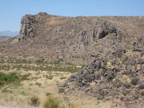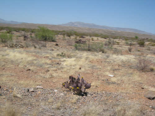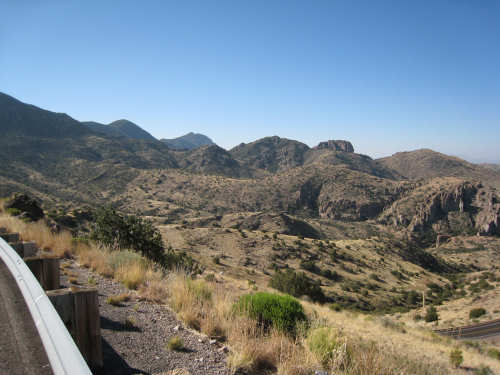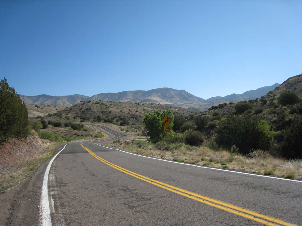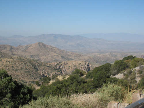Refreshed, we started out for our second climb, this time on Hwy. 191. To add to the fun, the road was under construction - they seemed to be adding 2 more lanes to it. But at least the traffic wasn't bad and the road was smooth. We crossed the Gila River very high up near the beginning of our ascent; it didn't look nearly as pretty as it had the day before. Then we started the slow grind up. The grade was about 5-6%, like the first climb today, but the wind had become a little stronger by now. Three-Way was at about 3,600 feet and the top of this pass was about 4,800 feet, over a 7- or 8-mile stretch. Very slow going. We saw a few tiny lizards darting in and out of the rocks along the road (when you're going that slowly you can see a lot you might otherwise miss!). The landscape was pretty, like New Mexico it looked surprisingly green in some areas. There was lots of cactus and yucca and other little plants and bushes. The hill sides were rolling. Later, near the top, the hills got much craggier. When we finally passed the peak, the descent was long and gentle, so we didn't have to worry about braking. We settled in for a nice, fast run into Safford, still about 27 miles away. And for a while it was, but the winds got very, very strong and slowed us down significantly. We passed the Black Hills on our right and Mount Graham, a very high peak on our left. There were also lots of flowering cacti on the last stretch into town. We joined Hwy. 70 on the last stretch into town and the traffic got a bit worse as well. It was also quite hot - about 90 degrees. All in all, by the time we reached Safford, we were worn out from fighting the wind and couldn't wait to find a motel to collapse in. We were glad we decided to make tomorrow our rest day, too. We ended up at a motel at 3:20 local time, having gone 52 miles in 5-1/4 hours of bike time.