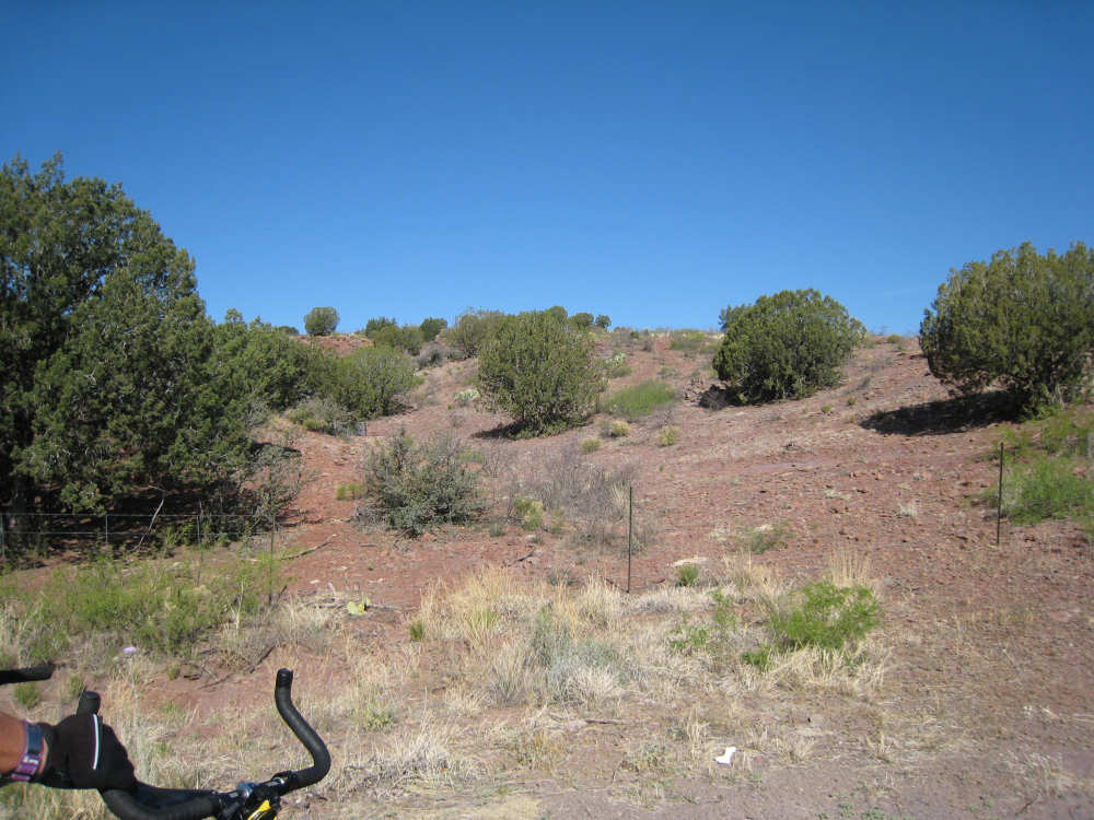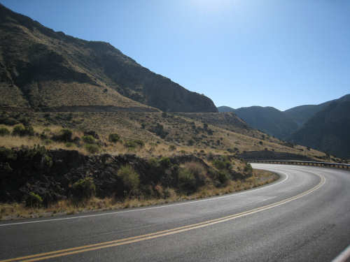 The descent from the pass was tough at first, steep and curvy - we had to brake almost continuously most of the way down. Near the end, though, the road tapered off and took the snakiest, most convoluted route down until it finally settled into a fairly straight, gently rolling road. At one point, we were actually riding along the top of a short ridge - that was really pretty. The road from there into Three-Way was a gentle, smooth descent and we made it in very good time. We found a great little general store in Three-Way - when you're the only store in town, you have to stock just about everything. I had the coffee I needed and then had a soda to quench the thirst I had built up; Pat just had a soda and we got a couple of snacks to make up for not having had pancakes for breakfast. We also got a bag of ice and gallon of water and refilled all our bottles and camel-baks. We had a nice chat with the guy that worked there while we were doing all this. He's the one who told us the name of the javelinas. He also said there was a mountain lion as well as deer and elk in the hills - we hadn't seen any of those. We noticed there was a big drive-in movie screen right behind the gas pumps; he explained the drive-in had closed 25 years ago. The store had a t-shirt for sale, advertising itself, with the cute little catch-phrase "conveniently located in the middle of nowhere" - how true!