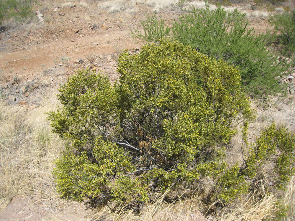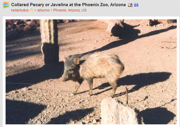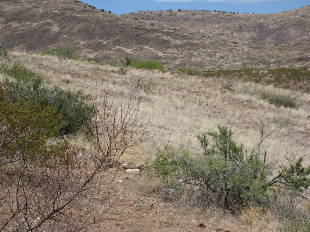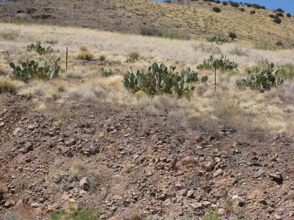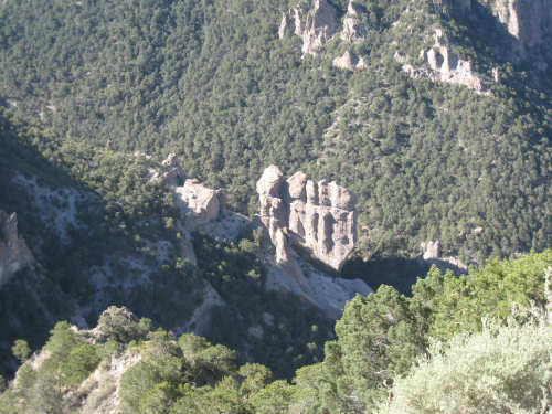 Our sojourn at the camp last night reinforced how much better we like staying in motels. True, it was peaceful and we got to see a great sky-full of stars (at least in the bit of sky we could see through all the trees). But not having any water to wash our hands off after we ate, or when we got greasy from working on the bike - that was no fun. We had plenty of food, but we had misjudged how much water we'd need, and essentially ran dry by the time we got back to civilization at the town of Three-Way, 20 miles from our campsite. Live and learn. We started out at 8 am (actually 7 am AZ time, they don't use Daylight Savings so we are now 3 hours behind the east coast!). We knew we had 2 big passes to climb in the first half of the day, but were encouraged that the second half would all be downhill or level. We started our first 4-mile-long 1,000-foot climb soon after we left camp. We were going up the Big Lue Mountains to a 6,300-foot high pass at Black Jack Canyon. Beautiful scenery on the way up and spectacular view up at the pass. The big excitement on the way up was seeing a small pack of small pigs in a field. I saw one, who quickly ducked behind some pale grass with which he blended in perfectly. We quickly stopped to see if I could get a picture and I saw another larger one scurry into a bush with a baby in tow. I managed to get a very camoflauged view of the mom. We learned later that they were javelinas, a type of pecary, so I found a picture of one on the web so you could see what they really looked like. We also saw a turn that would have taken us to Hwy. 191, the road we were to pick up in Three-Way, by way of the Black Hills Back Country By-ways, but decided to pass that up.