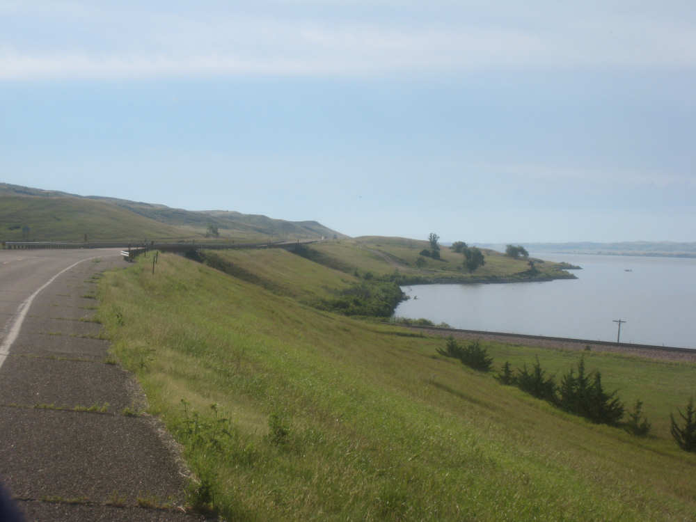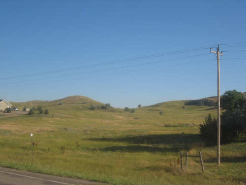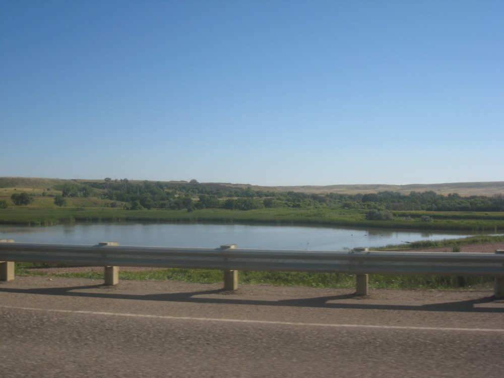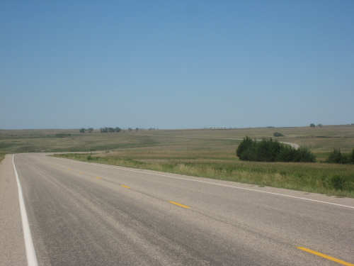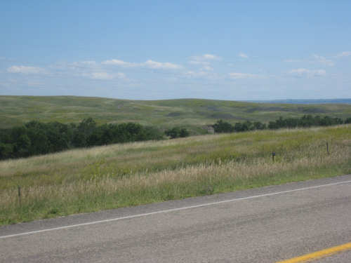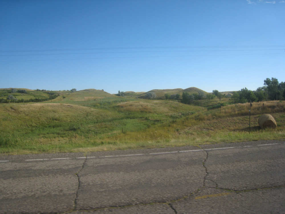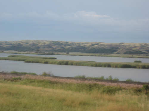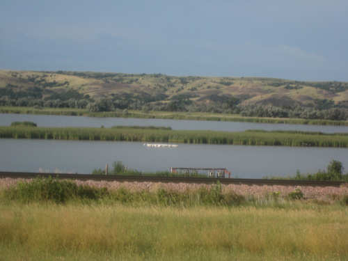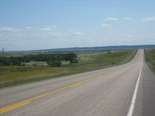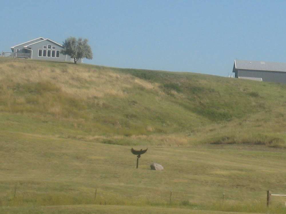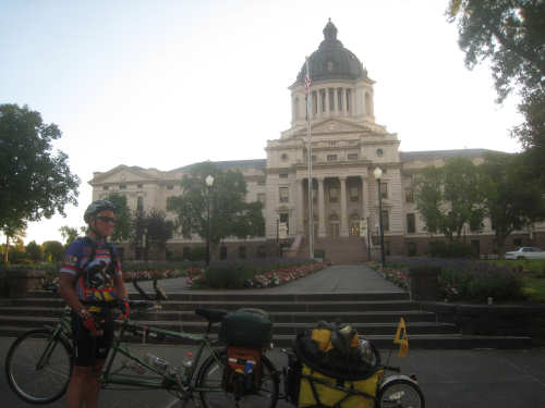 Tuesday, August 05, 2008 A very different day today than yesterday - bright & sunny with almost no wind. We were dry but we were also pretty hot. Luckily, there weren't that many hills - one steep hill and a long, fairly gradual climb, both around midday, and just the usual minor ups & downs the rest of the time. We left at 8, a little later than usual because we had to wait around for someone to show to take our 7K picture. We got it right in front of the State Capitol in Pierre, expecting there to be a lot of people around at that time, going to work and all, but it was pretty sparse. Finally, someone drove up and parked just across the street from us and graciously consented to take our picture. Then we went to breakfast and headed off. We were right along the river for the first 15 miles or so, which was a real treat. The hills along the river are very pretty and it was pleasant riding along the water. We saw a couple of historic markers along the river, both a little hard to read. One was about the Civiian Conservation Corps which provided work for over 31,000 men in South Dakota during the Depression. They worked on the Arikara Dam northeast of Pierre, a park on Farm Island in the Missouri River near Pierre, and various other projects in the area. The other plaque was about the old Fort Sully which was located near that point during 1863-1866 and then moved 36 miles upstream. The plaque looks like it's been through some wars itself. We only had one other marker today, about a fur trading post at a bend in the river just before our road veered away from it. This plaque was at the top of our steep hill where we had a lovely view of the river. We had a few interesting sights today. There were several silhouette-style statues in one area - some Indians and cowboys on horses arranged along the brow of a hill with some buffalo grazing below and an eagle landing near a rock below as well. There was also one of an Indian standing in front of his horse, looking like he was praying to the heavens. We saw a number of horses as usual, including one little family of four on a hill. We also saw lots of cattle, some very large herds spread out over a lot of land, but also one small herd that watched us intently as we approached and then started to run along with us as we went by! We'd never seen that before (some have run away from us as we approached) - maybe they thought we had come to feed them and they didn't want to miss us. We also saw one little calf all by himself on the wrong side of a fence! He was right up next to the fence, away from the road, but he started to run after us a little, too, as we went by. Maybe our trailer looks like a feed wagon to them, I don't know. As we moved away from the river, the croplands came back and we saw the usual immense fields of corn, hay, sunflowers, and other crops. We entered the Crow Creek Indian Reservation after about 40 miles and after another 5 miles or so, we came to the only store we saw today. It was a gas station/convenience store next to the Stephan Indian Mission school. We bought a bag of ice to replenish our camelbaks which were just about dry then, and a couple of sodas, and chatted with the store owners as we drank them. The remaining 15 miles of the day were mostly downhill and we finally had a little bit of breeze as well, almost a tailwind. We finally saw the Missouri again at the bottom of our descent as we approached Fort Thompson. We stayed at the Lode Star Motel, which is associated with the casino and restaurant of the same name. They are all run by Native Americans from the reservation. We were very impressed with our room, which was as nice and well-equipped as many higher-priced rooms we've been in. The food in the restaurant was good, too, although eating in a casino was not so pleasant, with all the racket from the slot machines dinging in the background! We arrived at our motel at 3:30, having done almost 62 miles in a little over 5-1/2 hours of bike time, almost as good an average as yesterday, but an extra 1-1/2 hour of elapsed time as we stopped more frequently today. |