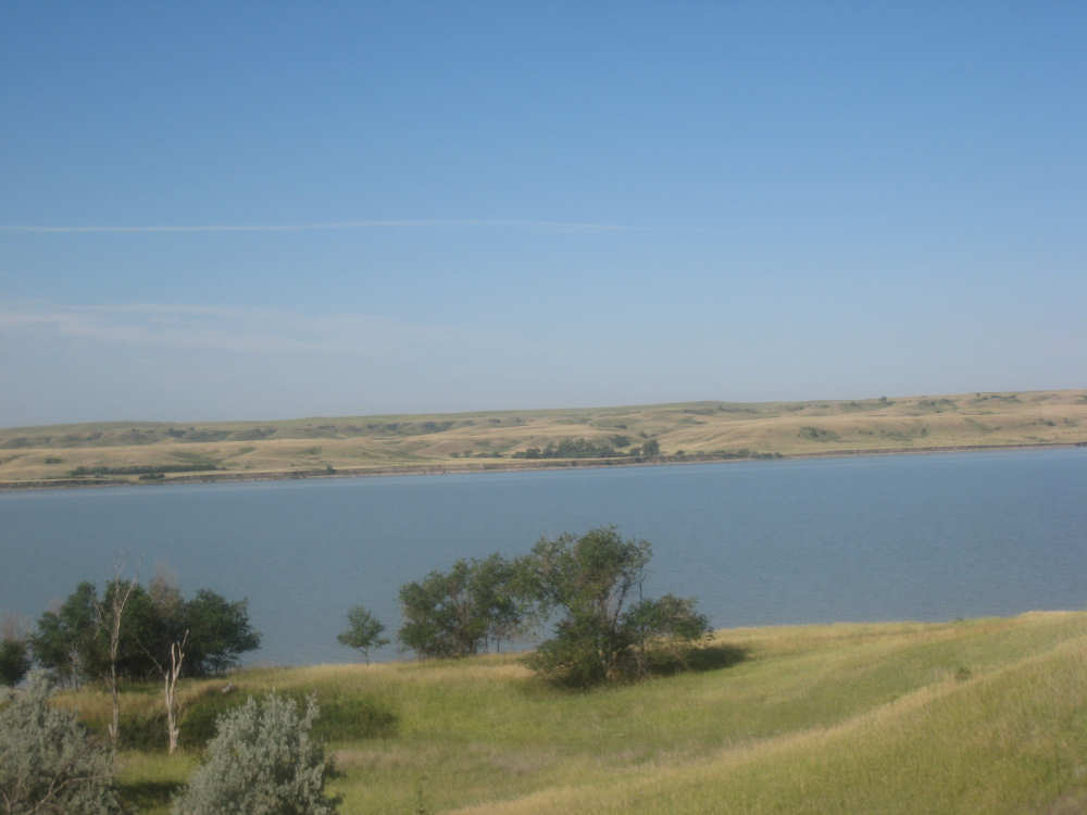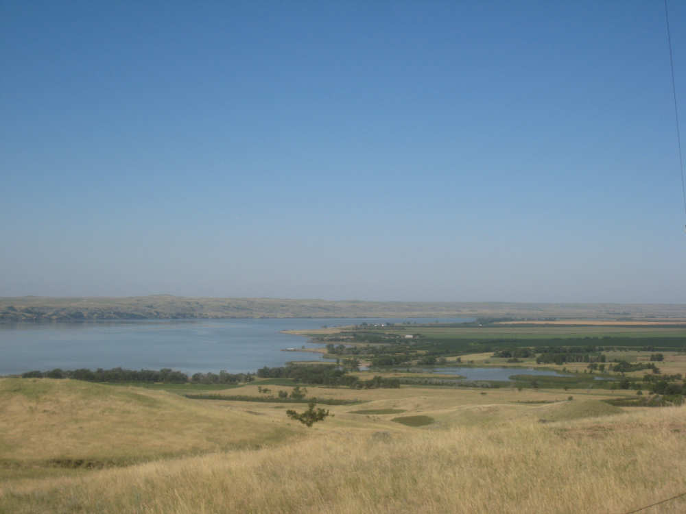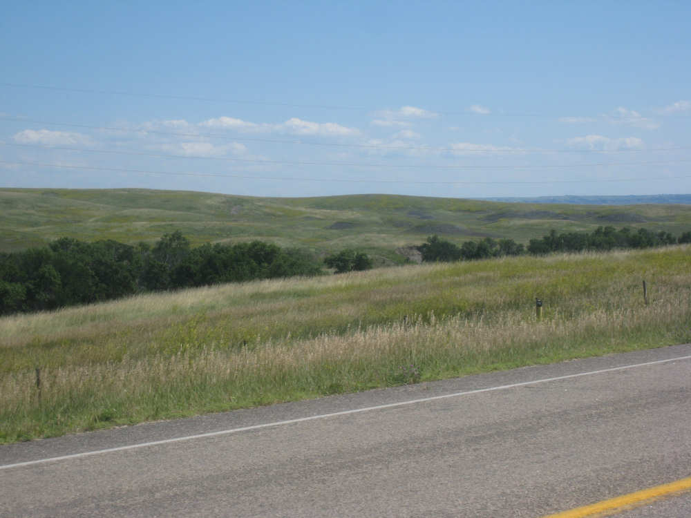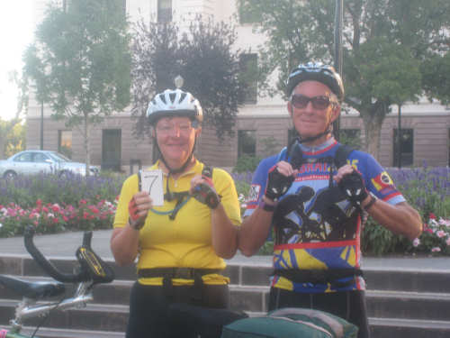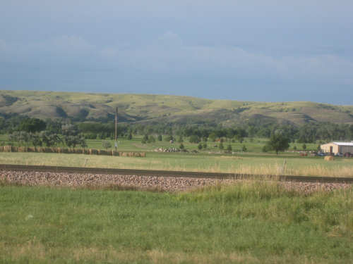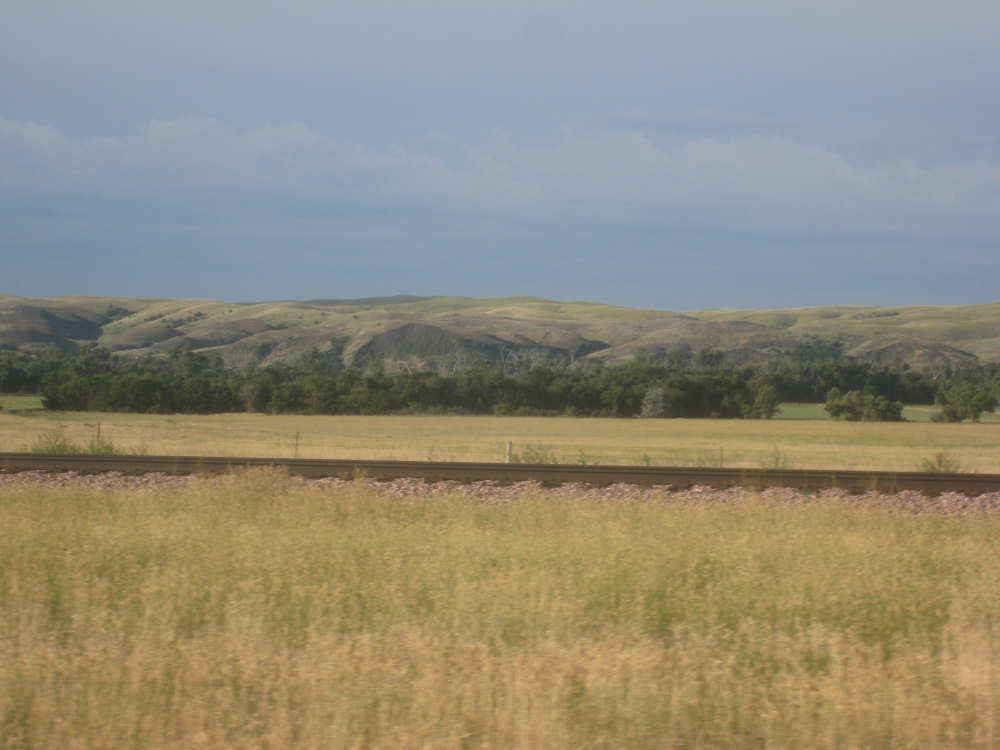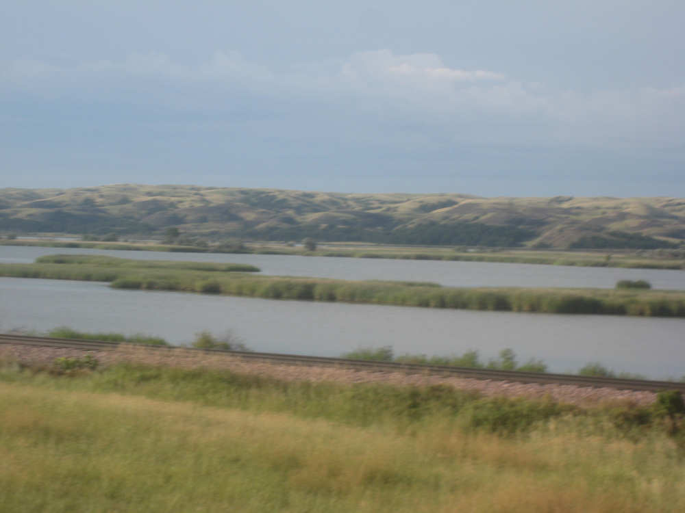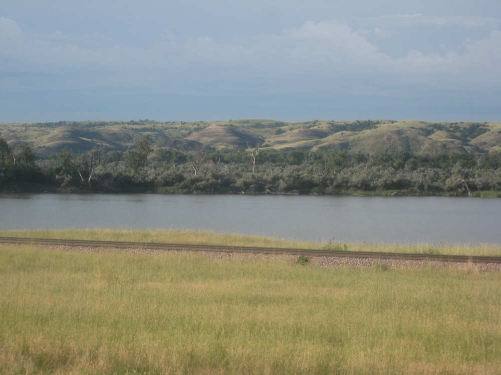 Tuesday, August 05, 2008 A very different day today than yesterday - bright & sunny with almost no wind. We were dry but we were also pretty hot. Luckily, there weren't that many hills - one steep hill and a long, fairly gradual climb, both around midday, and just the usual minor ups & downs the rest of the time. We left at 8, a little later than usual because we had to wait around for someone to show to take our 7K picture. We got it right in front of the State Capitol in Pierre, expecting there to be a lot of people around at that time, going to work and all, but it was pretty sparse. Finally, someone drove up and parked just across the street from us and graciously consented to take our picture. Then we went to breakfast and headed off. We were right along the river for the first 15 miles or so, which was a real treat. The hills along the river are very pretty and it was pleasant riding along the water. We saw a couple of historic markers along the river, both a little hard to read. One was about the Civiian Conservation Corps which provided work for over 31,000 men in South Dakota during the Depression. They worked on the Arikara Dam northeast of Pierre, a park on Farm Island in the Missouri River near Pierre, and various other projects in the area. The other plaque was about the old Fort Sully which was located near that point during 1863-1866 and then moved 36 miles upstream. The plaque looks like it's been through some wars itself. We only had one other marker today, about a fur trading post at a bend in the river just before our road veered away from it. This plaque was at the top of our steep hill where we had a lovely view of the river. We had a few interesting sights today. There were several silhouette-style statues in one area - some Indians and cowboys on horses arranged along the brow of a hill with some buffalo grazing below and an eagle landing near a rock below as well. There was also one of an Indian standing in front of his horse, looking like he was praying to the heavens. We saw a number of horses as usual, including one little family of four on a hill. We also saw lots of cattle, some very large herds spread out over a lot of land, but also one small herd that watched us intently as we approached and then started to run along with us as we went by! We'd never seen that before (some have run away from us as we approached) - maybe they thought we had come to feed them and they didn't want to miss us. We also saw one little calf all by himself on the wrong side of a fence! He was right up next to the fence, away from the road, but he started to run after us a little, too, as we went by. Maybe our trailer looks like a feed wagon to them, I don't know. As we moved away from the river, the croplands came back and we saw the usual immense fields of corn, hay, sunflowers, and other crops. We entered the Crow Creek Indian Reservation after about 40 miles and after another 5 miles or so, we came to the only store we saw today. It was a gas station/convenience store next to the Stephan Indian Mission school. We bought a bag of ice to replenish our camelbaks which were just about dry then, and a couple of sodas, and chatted with the store owners as we drank them. The remaining 15 miles of the day were mostly downhill and we finally had a little bit of breeze as well, almost a tailwind. We finally saw the Missouri again at the bottom of our descent as we approached Fort Thompson. We stayed at the Lode Star Motel, which is associated with the casino and restaurant of the same name. They are all run by Native Americans from the reservation. We were very impressed with our room, which was as nice and well-equipped as many higher-priced rooms we've been in. The food in the restaurant was good, too, although eating in a casino was not so pleasant, with all the racket from the slot machines dinging in the background! We arrived at our motel at 3:30, having done almost 62 miles in a little over 5-1/2 hours of bike time, almost as good an average as yesterday, but an extra 1-1/2 hour of elapsed time as we stopped more frequently today. |