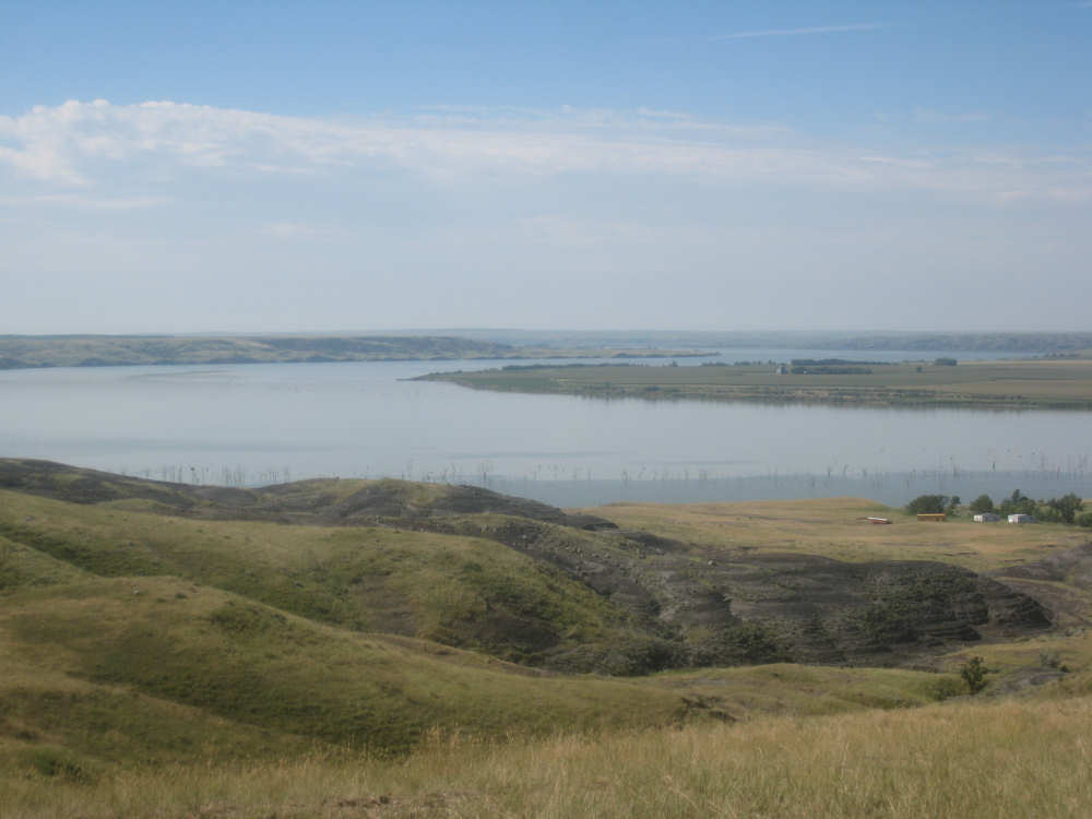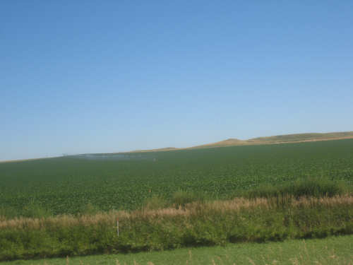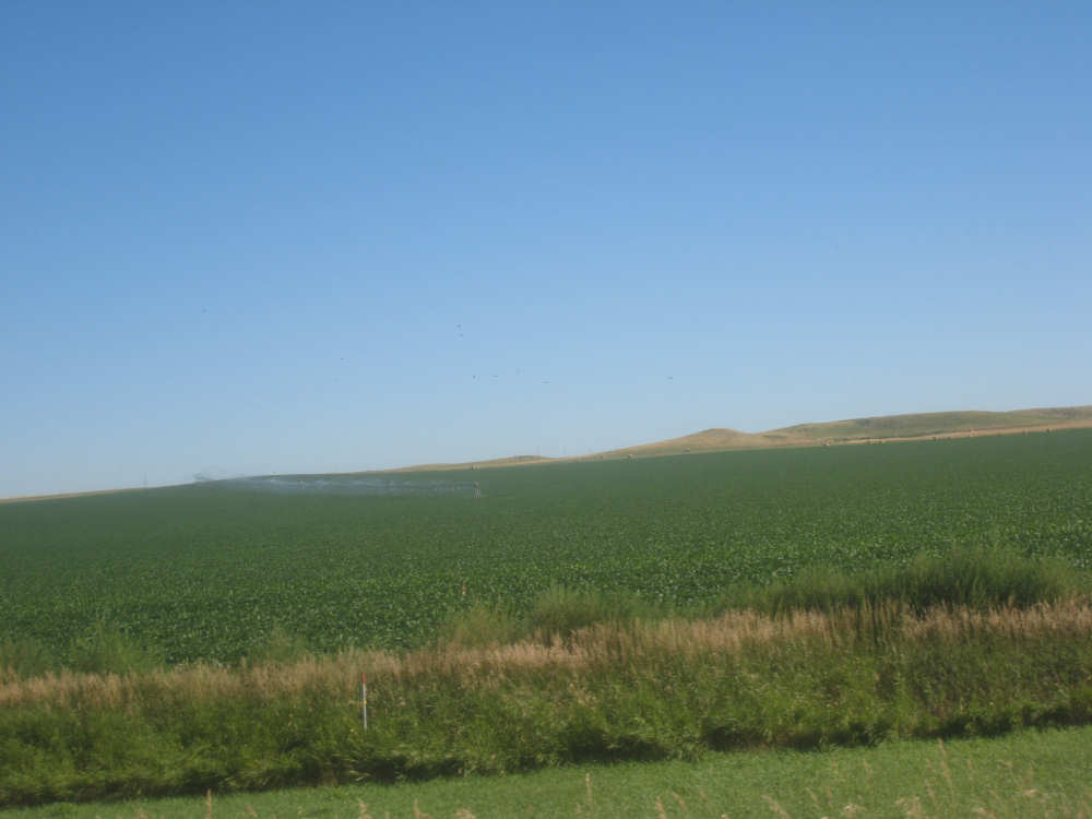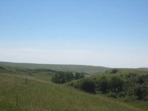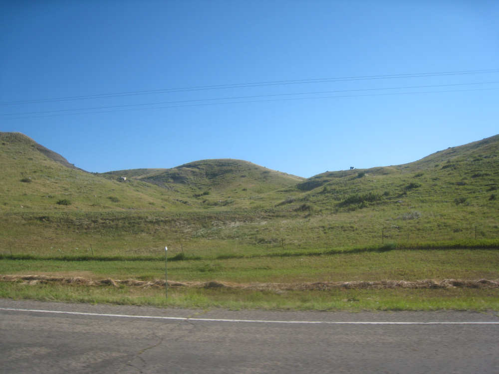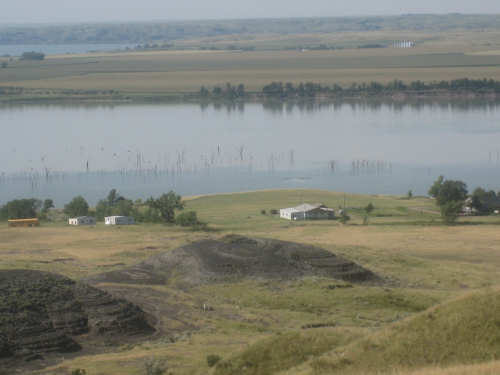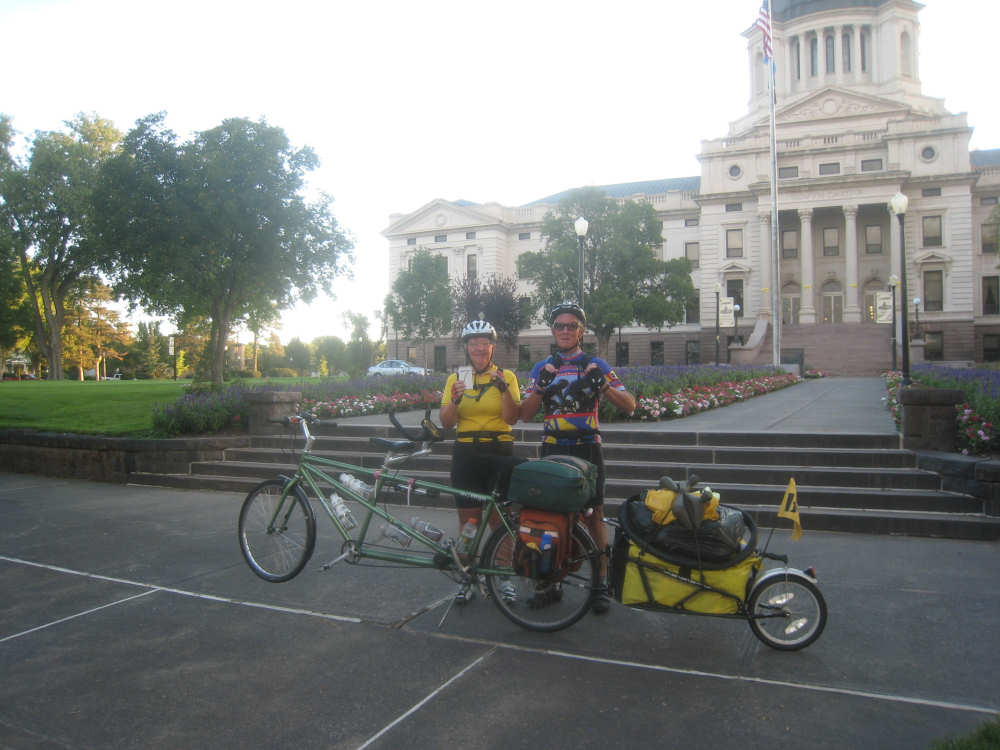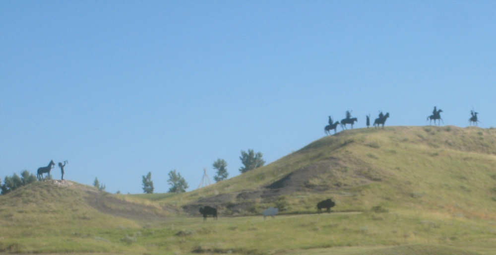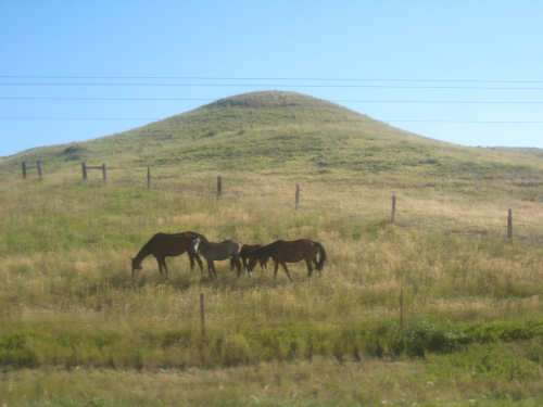 Tuesday, August 05, 2008 A very different day today than yesterday - bright & sunny with almost no wind. We were dry but we were also pretty hot. Luckily, there weren't that many hills - one steep hill and a long, fairly gradual climb, both around midday, and just the usual minor ups & downs the rest of the time. We left at 8, a little later than usual because we had to wait around for someone to show to take our 7K picture. We got it right in front of the State Capitol in Pierre, expecting there to be a lot of people around at that time, going to work and all, but it was pretty sparse. Finally, someone drove up and parked just across the street from us and graciously consented to take our picture. Then we went to breakfast and headed off. We were right along the river for the first 15 miles or so, which was a real treat. The hills along the river are very pretty and it was pleasant riding along the water. We saw a couple of historic markers along the river, both a little hard to read. One was about the Civiian Conservation Corps which provided work for over 31,000 men in South Dakota during the Depression. They worked on the Arikara Dam northeast of Pierre, a park on Farm Island in the Missouri River near Pierre, and various other projects in the area. The other plaque was about the old Fort Sully which was located near that point during 1863-1866 and then moved 36 miles upstream. The plaque looks like it's been through some wars itself. We only had one other marker today, about a fur trading post at a bend in the river just before our road veered away from it. This plaque was at the top of our steep hill where we had a lovely view of the river. We had a few interesting sights today. There were several silhouette-style statues in one area - some Indians and cowboys on horses arranged along the brow of a hill with some buffalo grazing below and an eagle landing near a rock below as well. There was also one of an Indian standing in front of his horse, looking like he was praying to the heavens. We saw a number of horses as usual, including one little family of four on a hill. We also saw lots of cattle, some very large herds spread out over a lot of land, but also one small herd that watched us intently as we approached and then started to run along with us as we went by! We'd never seen that before (some have run away from us as we approached) - maybe they thought we had come to feed them and they didn't want to miss us. We also saw one little calf all by himself on the wrong side of a fence! He was right up next to the fence, away from the road, but he started to run after us a little, too, as we went by. Maybe our trailer looks like a feed wagon to them, I don't know. As we moved away from the river, the croplands came back and we saw the usual immense fields of corn, hay, sunflowers, and other crops. We entered the Crow Creek Indian Reservation after about 40 miles and after another 5 miles or so, we came to the only store we saw today. It was a gas station/convenience store next to the Stephan Indian Mission school. We bought a bag of ice to replenish our camelbaks which were just about dry then, and a couple of sodas, and chatted with the store owners as we drank them. The remaining 15 miles of the day were mostly downhill and we finally had a little bit of breeze as well, almost a tailwind. We finally saw the Missouri again at the bottom of our descent as we approached Fort Thompson. We stayed at the Lode Star Motel, which is associated with the casino and restaurant of the same name. They are all run by Native Americans from the reservation. We were very impressed with our room, which was as nice and well-equipped as many higher-priced rooms we've been in. The food in the restaurant was good, too, although eating in a casino was not so pleasant, with all the racket from the slot machines dinging in the background! We arrived at our motel at 3:30, having done almost 62 miles in a little over 5-1/2 hours of bike time, almost as good an average as yesterday, but an extra 1-1/2 hour of elapsed time as we stopped more frequently today. |