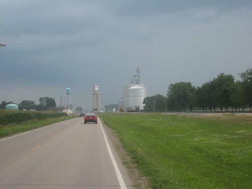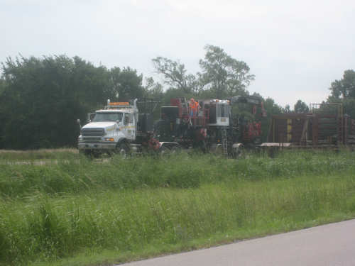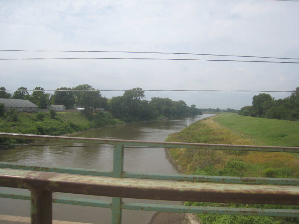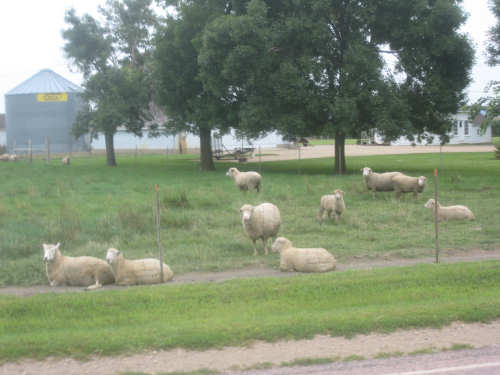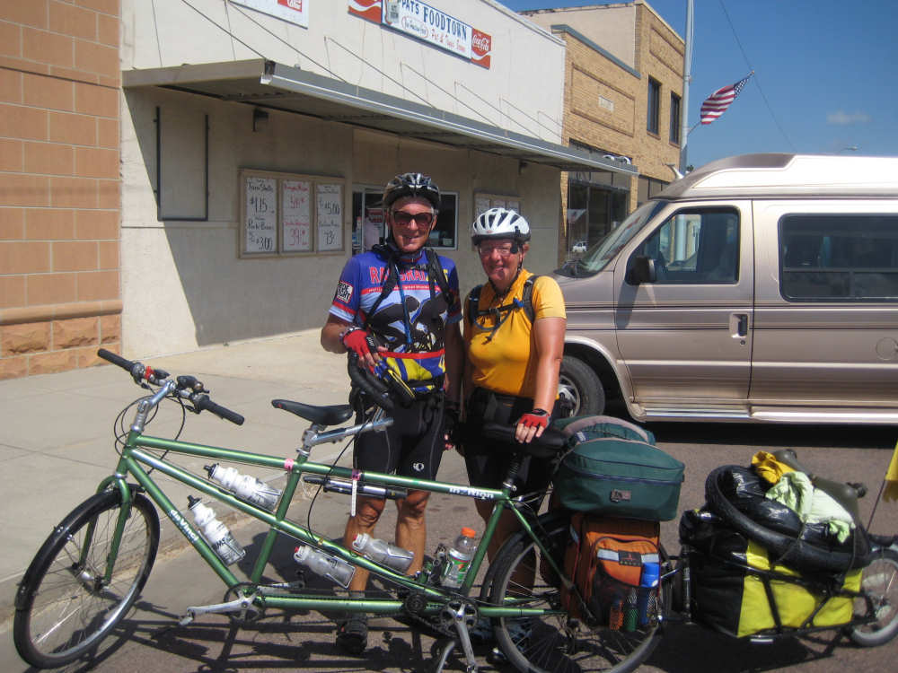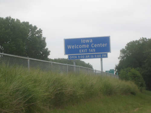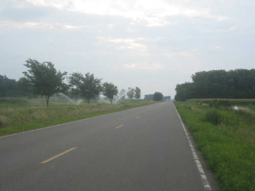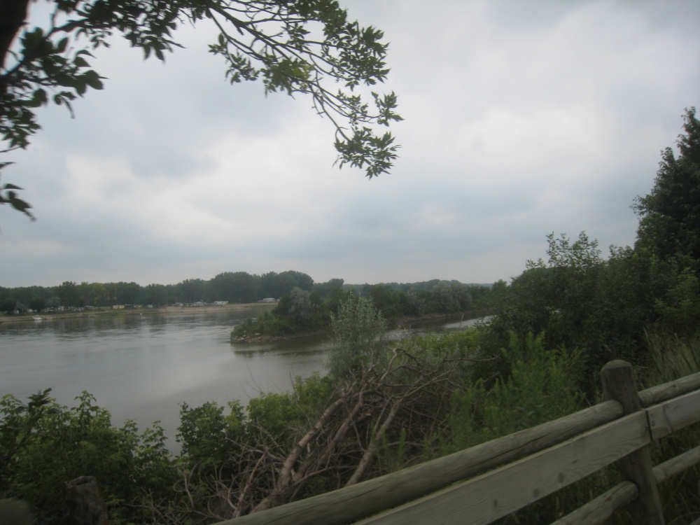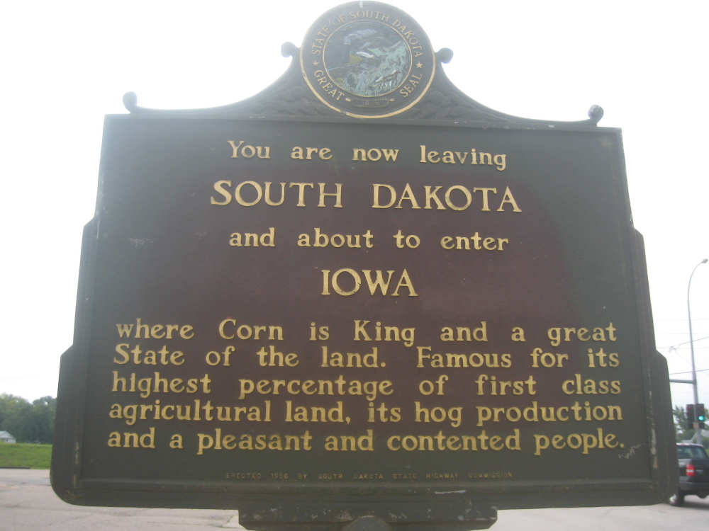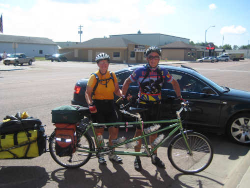 Monday, August 11, 2008 Another day of headwinds, this time already pretty strong right from the start. And today was even flatter than yesterday, so it should have been a thoroughly enjoyable ride, but instead we spent it pushing against the wind. Aggravating. We started off at 7:30 under cloudy skies, our stuff all wrapped up since we had a good chance of rain this morning. It didn't rain and it looked like it was clearing up by noon, but it got cloudy again just as we were getting close to our motel for the night. Sure enough, we made the last turn with one mile to go and we ran smack into the rain. We pulled off into a gas station to take shelter under its canopy and saw our motel right across the street! We waited for the rain to ease up and then scooted across the street just as a busload of elderly folks arrived and went into the motel too. We managed to slip in before they got organized so we got settled in pretty quickly. We had a number of interesting sights today. We found out that the University of South Dakota is in Vermillion and went by its campus on our way out this morning. Our morning road was a quiet county road down the southeastern tip of South Dakota, sandwiched in between Iowa and Nebraska. We were able to see the Nebraska hills to our right, across the Missouri River, and the Iowa hills ahead to our left, across the Big Sioux River. We went through a number of small towns, Burbank, Elk Point, Jefferson, and North Sioux City; the first ones were fairly rural but they became more urban as we got closer to Iowa. We rode next to a train track most of the morning and saw what looked like a truck pulling a train on the tracks near North Sioux City. It turned out it was being pushed by 2 train engines at the back, but its load was 2 train tracks that were each about a half-mile long! The gizmo at the front behind the truck cab was designed to grab one end of the track to unload it. Very interesting way to haul track. A short while later, we saw a familiar logo painted on a group of buildings - this was Gateway Business Park, the headquarters for Gateway Computers. We reached the Big Sioux River which we would cross into Iowa around lunch time. We stopped for lunch at a casino that promised burgers. Outside the casino was a plaque saying we were entering/leaving South Dakota (depending on which side you read). I thought it had very nice words to say about Iowa. It's a good thing we took that picture because it was the only welcome we had to Iowa, our 22nd state. No welcome sign greeted us on the bridge or after it. We first rode through a pleasant residential area of Sioux City, followed by a bike trail through Riverside Park, a nice large park along the Big Sioux and Missouri Rivers. The Big Sioux converges with the Missouri along this stretch. The bike trail and park were lovely and covered about 4 miles along the rivers. We continued on a park road open to traffic which went by an Iowa welcome center, a river museum, a Lewis & Clark Interpretive Center and a memorial to a plane that crashed nearby in 1989. It was a United Flight 232 going from Denver to Chicago when it had some mechanical failure. Apparently the pilots did an incredible job of landing the plane in almost impossible conditions, which resulted in a number of the passengers and crew surviving. After the park we climbed into a section of the Loess Hills, These hills line the Missouri Valley in Iowa and were created during glacier movements in an ice age. They are apparently composed of fine-grained loam and they cover about 200 miles from just north of Sioux City to the northwest corner of Missouri. We ran into more road construction here and detoured through another nice residential section of Sioux City before coming back down to a flat area again. We continued on a flat, straight county road all the way to Sloan, where our motel was. The road had no shoulder and a fair bit of traffic, but the Iowa drivers were immensely courteous, slowing down behind us when they couldn't pass easily. When we stopped for a break, a gentleman coming out of a side road asked if we were ok, then asked about where we were staying and gave us all sorts of information about the area for a few minutes before pulling off. We arrived at our motel at 4:15, having gone almost 62 miles in nearly 6-1/2 bike hours, a pitiful average for such a flat day. We included a couple of pictures taken by our friendly couple from Chicago whom we met in Burke, SD. As promised, they emailed us the 2 pictures they took of us on our bike, one facing the sun and the other loooking the other way. |