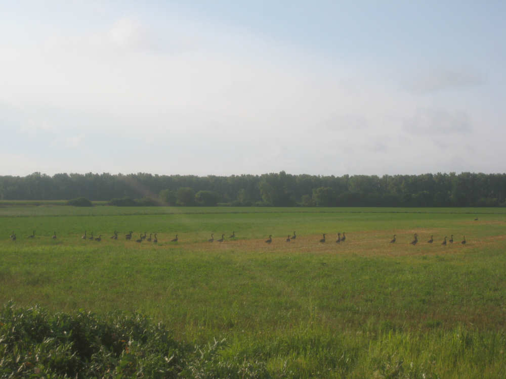 Canada Geese lined up in a field; the Missouri River is behind the trees