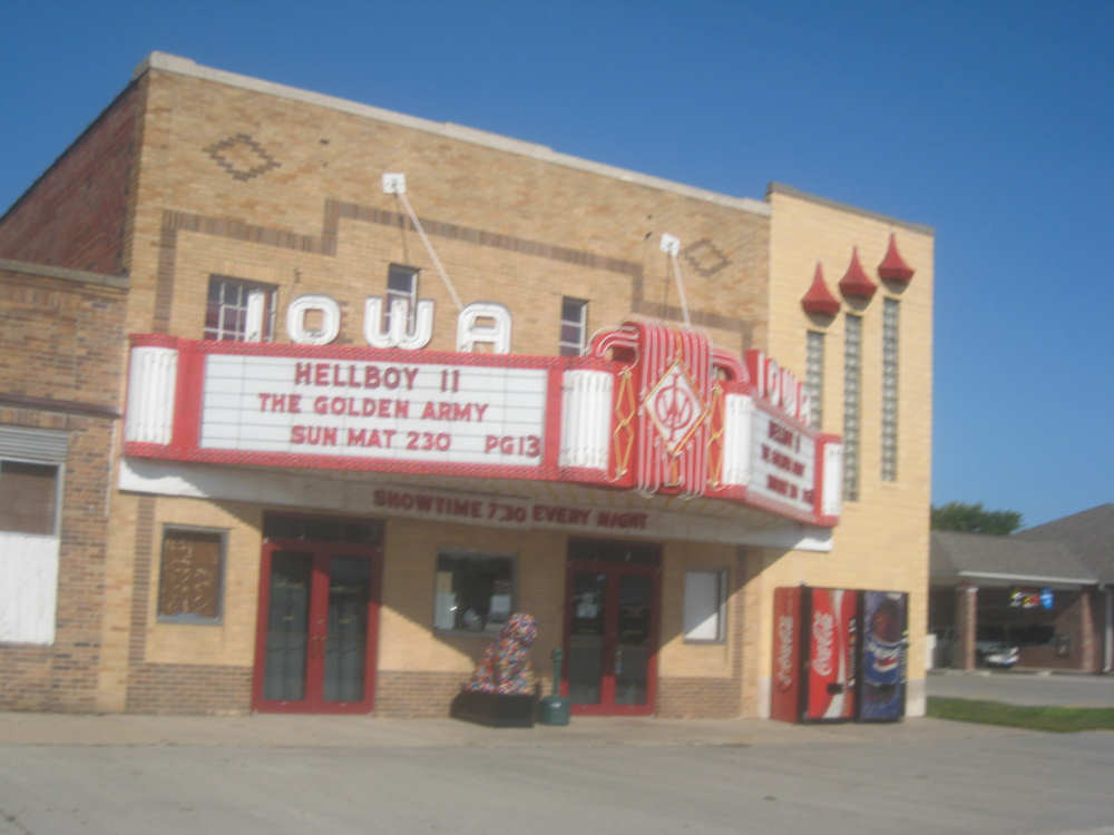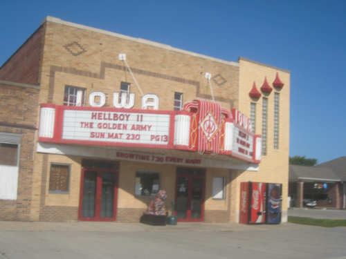 An old-time movie theater in Onawa, note the decorated dog statue in front