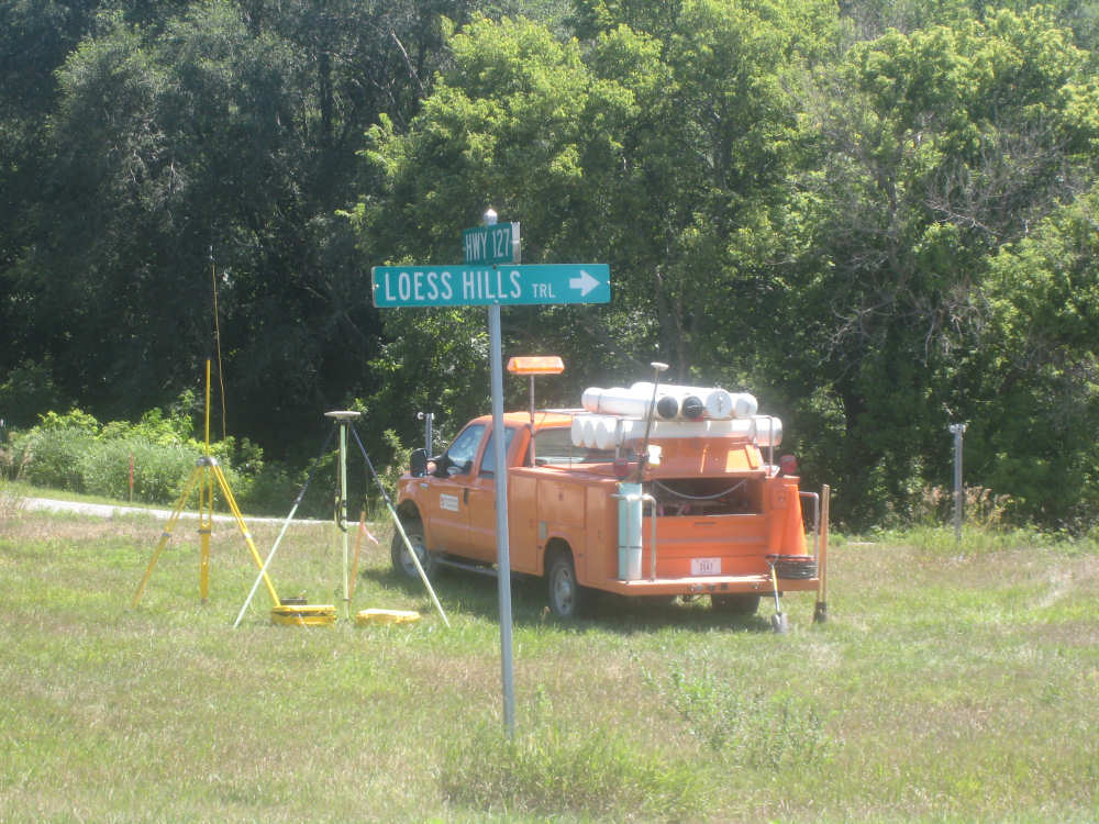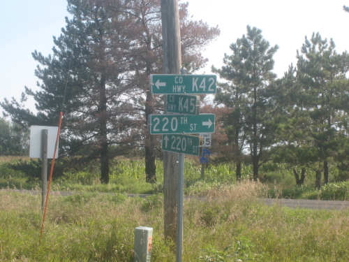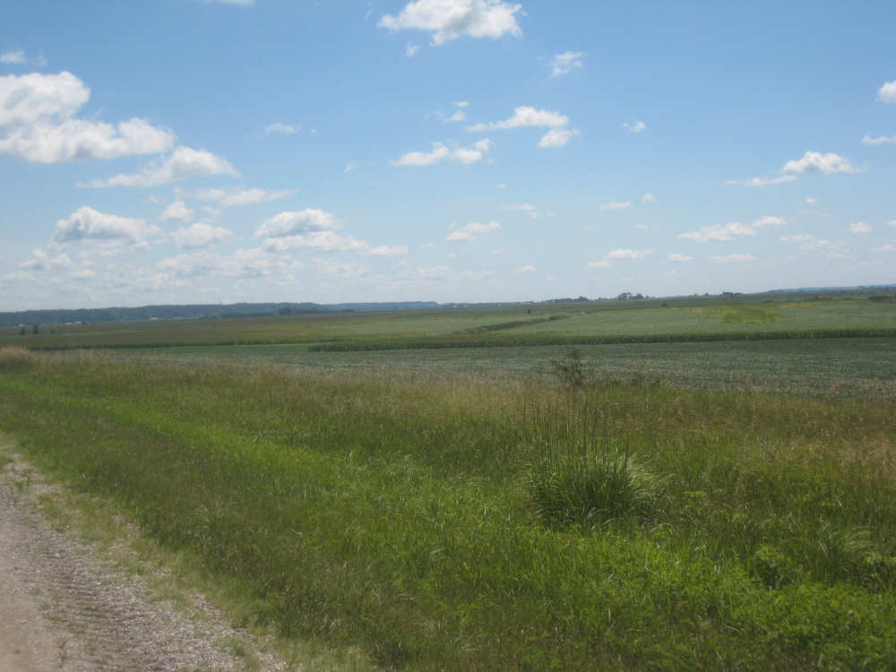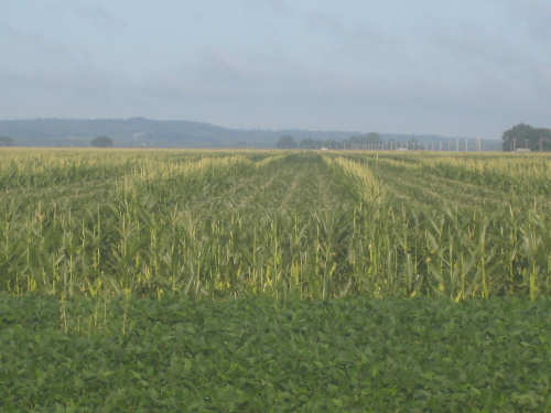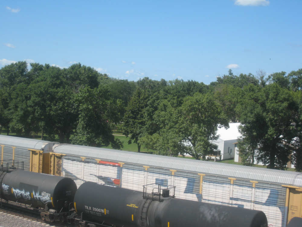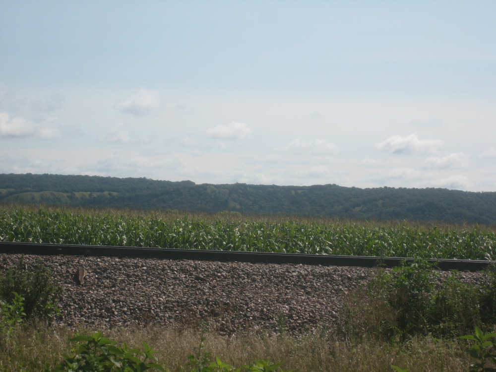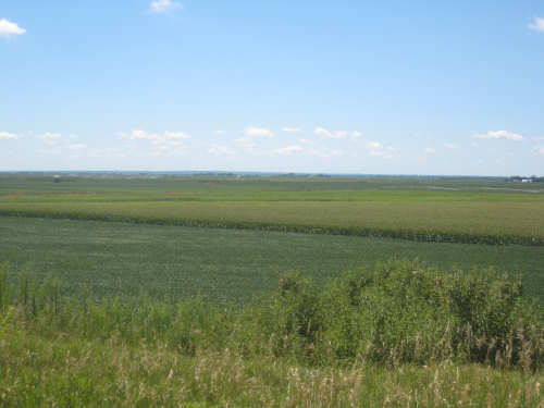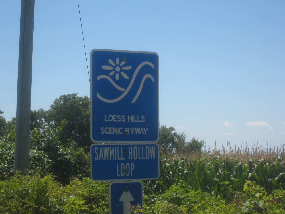 The scenery was beautiful today, too. We started out on a quiet county road, heading mostly south, a little east. We were going parallel to the Missouri River, just west of us, with I-29 slipped in between. Most of what we saw this morning were crops, mostly corn and soybeans as expected, filling nearly all the flat land around us. We noticed something about the corn that puzzled us. Many fields had one taller row of corn for every 4 shorter ones. Other fields had an empty row for every 4, and the 4 looked like their tops had been cut off. When we stopped at Onawa, our first town of the day, we asked a guy about it. He explained that the tall rows were male seed corn and the short rows female. After pollination, the male rows were cut down and dried out for use as seed. The tassels at the top of the female corn stalks were cut off since they weren't needed for pollination any more and more nutrition could go into making the corn ears if they were gone. Nice to have people explain all these tricky parts to us.