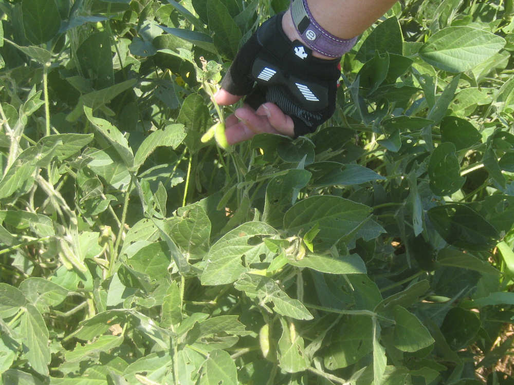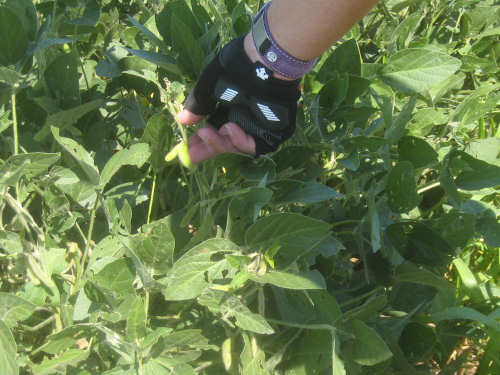 Pat investigates a soybean plant, with tiny soybean pods