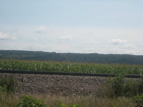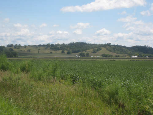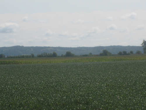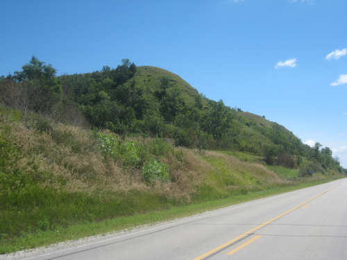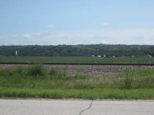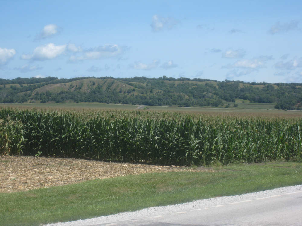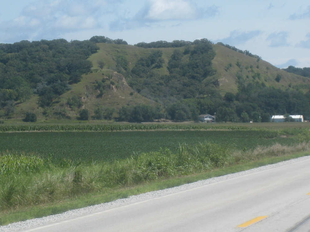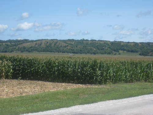 After Onawa, we had a similarly easy and pretty ride to Mondamin, the gateway to the Loess Hills. We could see the hills in the distance. getting ever closer as we approached Mondamin. We stopped in town for lunch - our two towns today were spaced just the way we like them, one a third of the way for a mid-morning break, the other two-thirds of the way, in time for lunch. Pat was wearing his Ragbrai shirt as usual and we started chatting with the waitress about Ragbrai. She mentioned that this year's Ragbrai, which went on just a couple of weeks ago, had started in Missouri Valley, the town we were headed for tonight. Most of the last 17 miles from Mondamin to Missouri Valley we passed along the feet of the Loess Hills. They are really lovely hills, green and undulating. In a couple of spots, the underlying earth was exposed - it looked very much like sand. This was the only section we had any climb at all and it was pretty mild. To our right, the valley stretched out to the river, vast and green. We cruised between the hills and the valley, enjoying the views until we turned off toward I-29 to find our motel.