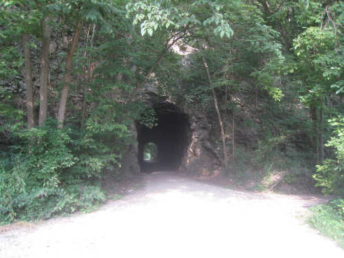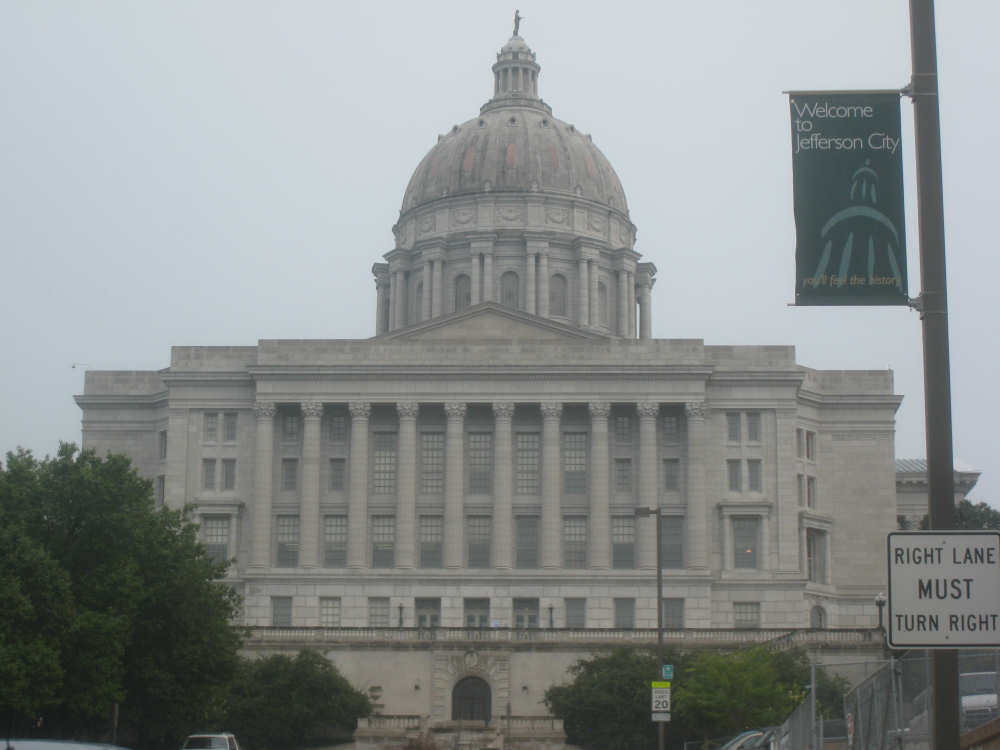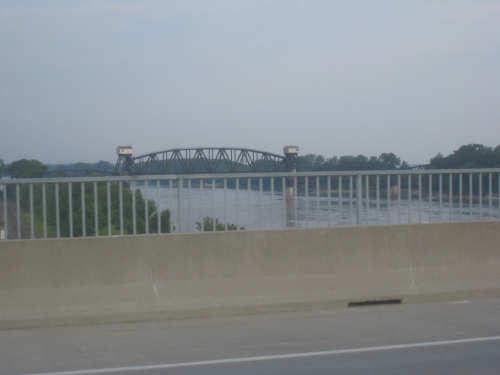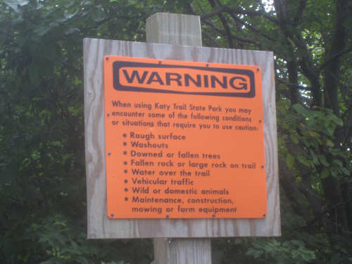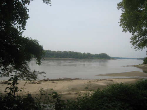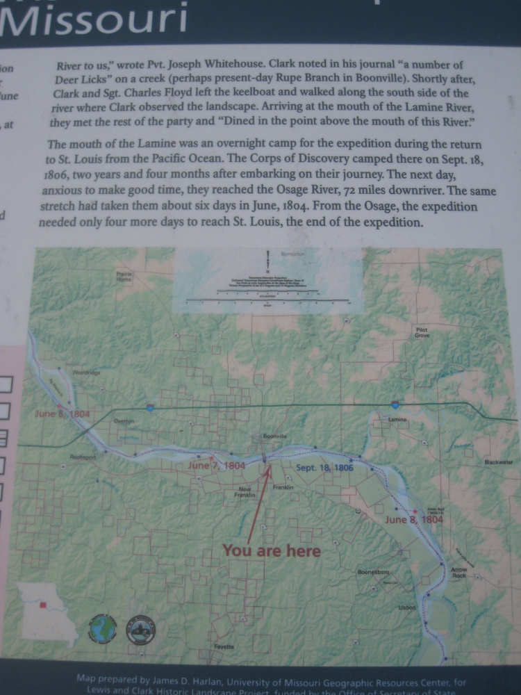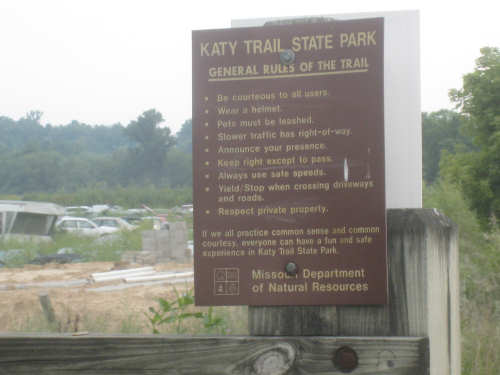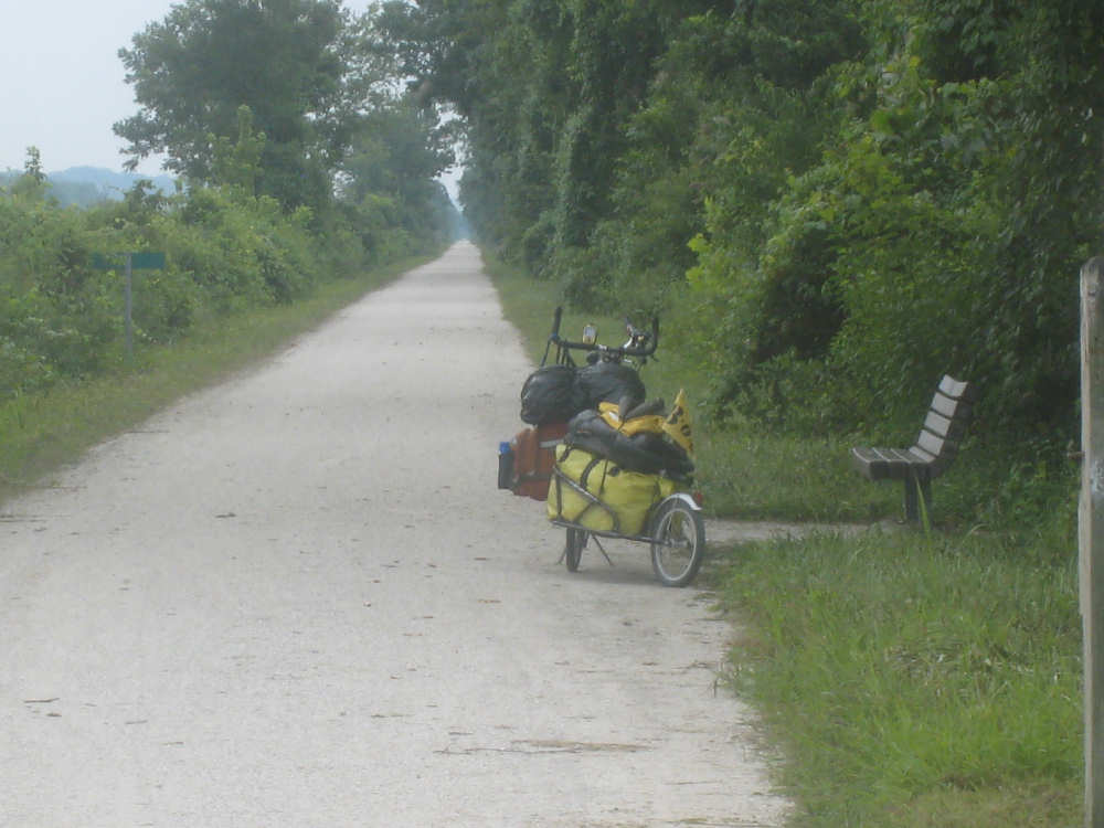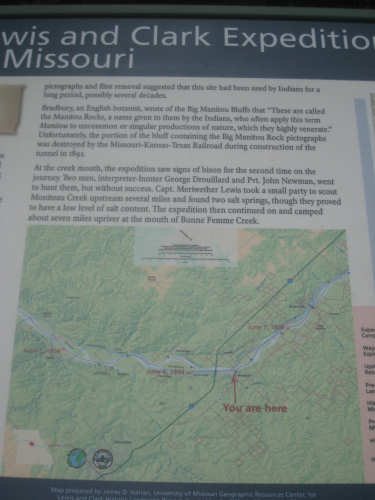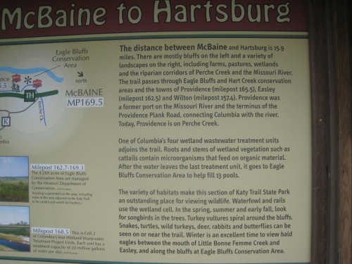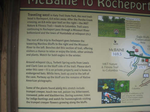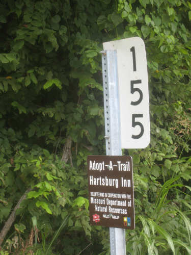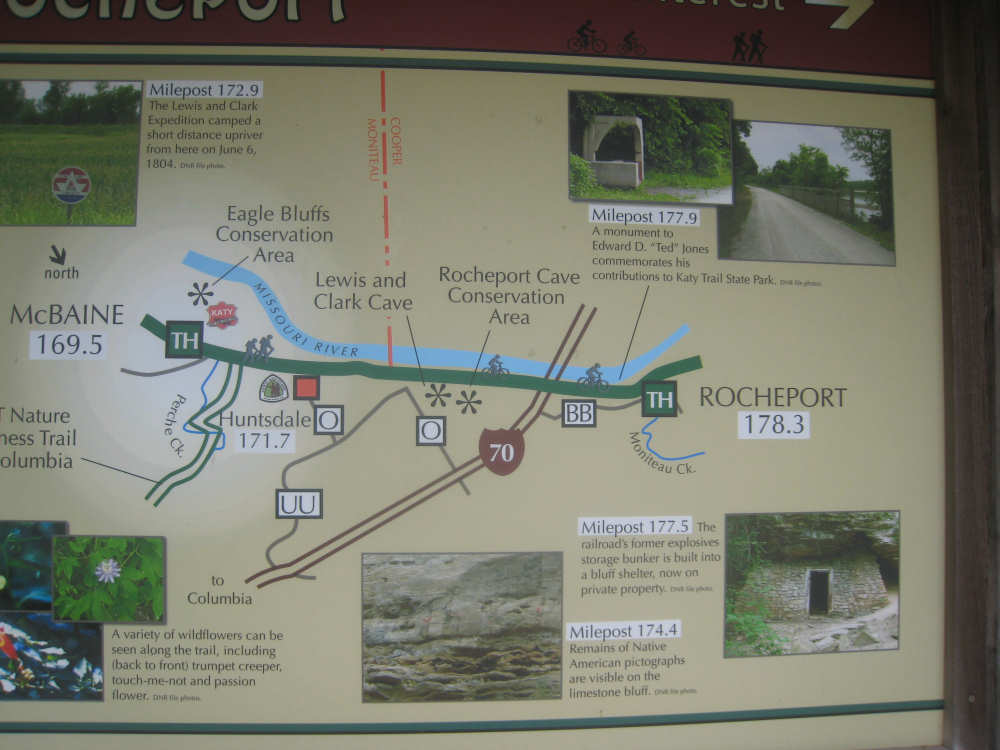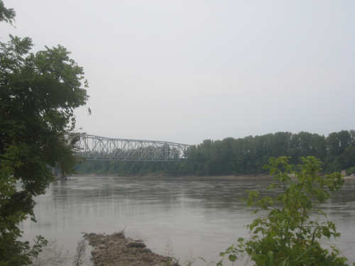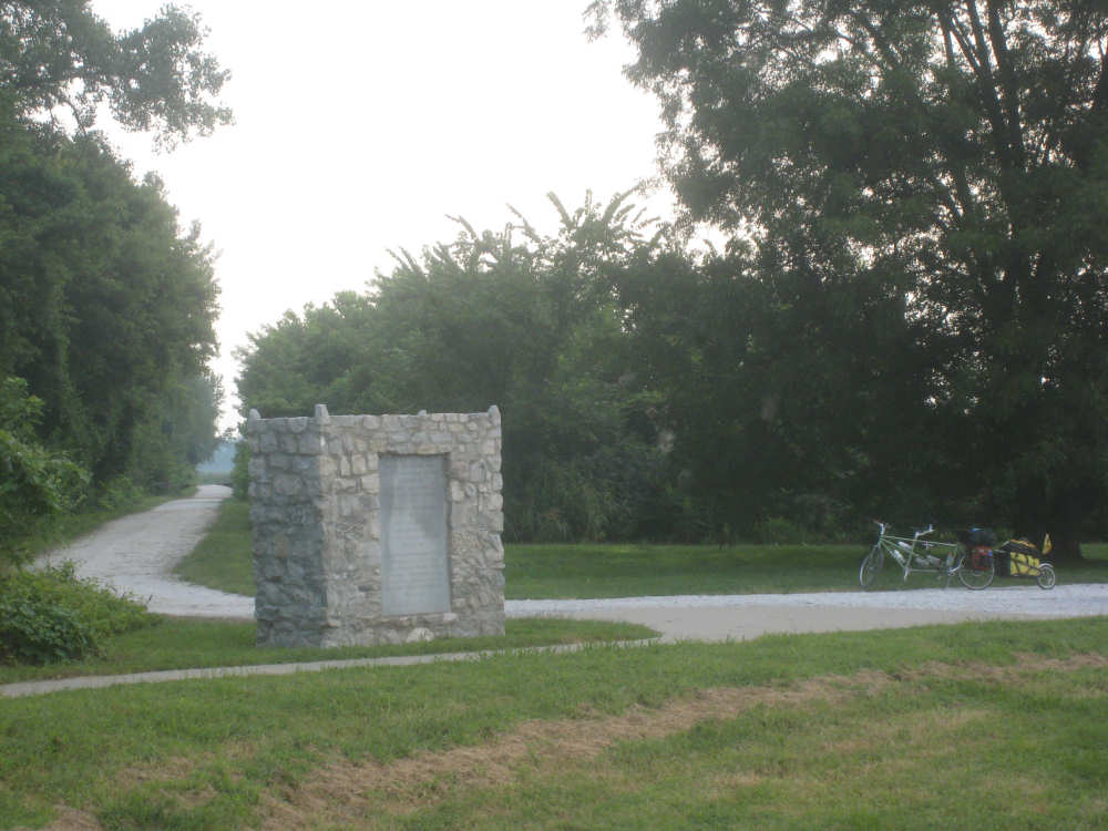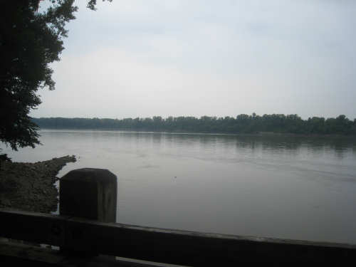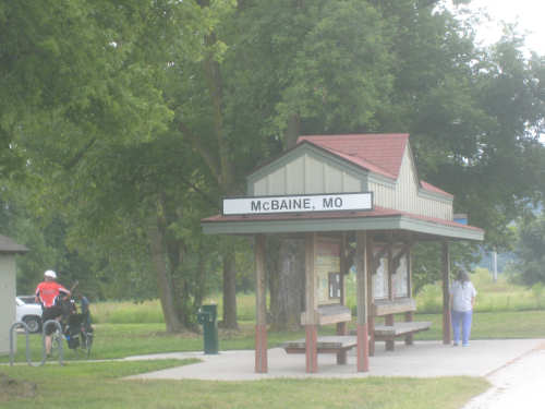 Wednesday, August 20, 2008 Well, today was hardly boring and we have a bumper crop of pictures for you. Most of them are Lewis & Clark historic markers - there were lots of them along the trail. But there were also plenty of interesting things about the Katy Trail itself. We left Boonville this morning at 7:30, having had the continental breakfast at the motel since they told us, correctly, that nothing in town opened until 10 or so. We went through rush hour traffic on narrow, no-shoulder roads for a few miles before reaching the bridge across the Missouri. Everyone was very considerate though, and we did our best to get off the road when large trucks or school buses wanted to get by (school is already in session out here!). The bridge itself, thankfully, had a wide shoulder and we turned off for the Katy Trail soon after that. The Katy Trail was easy to spot - there were tons of welcome signs and historic markers at the trailhead. The trail doesn't start there; it is about 265 miles all together and starts in Clinton, MO, more than 75 miles to the southwest. It's a rail-to-trail converted from the Missouri-Kansas-Texas (MKT, or Katy for short) railroad line that ceased operating in the mid-1980's. We picked up the trail at about mile 190 at the Franklin Trailhead, as instructed by Adventure Cycling, but noticed that we could have picked it up in Boonville 4 or 5 miles sooner. As we went across the bridge, we saw an old railroad bridge a little to our left and wondered if the trail went over that bridge. At any rate, we got on the trail and found it to be both flat and relatively smooth (for an unpaved trail); it was lots smoother than the C&O Potomac River trail we were on almost 2 years ago, and even a little smoother than the Steamboat Trace Trail we were on in Iowa. We were very impressed at how well maintained it was, especially given how long and how prone to flooding it is. There were some rough spots and it was slower-going than a paved road, but overall was not as difficult as we thought it might be. We started off with crop fields on either side of us and continued to see them intermittently through the day. The Missouri River was close by to our right, but it meandered in and out of sight. We were right next to it in a number of spots, and in others, we were next to marshy or bottomland areas that clearly got flooded by the river often. The mosquitoes were bad in those areas; they didn't bother us while we were riding, but as soon as we stopped for a rest or to take pictures, they were all over us, so we didn't stay in one place for long. To our left, there were the Missouri hills we're so fond of. Like the river, they were sometimes very close and sometimes in the distance with farms or towns between the hills and the trail. Much of the time that they were up close, they had impressive cliffs, with interesting caves and other formations. There was one short tunnel on the trail, which we went through. There were also several towns along the trail, some of them with train stops converted to information booths. Unfortunately, most of the restaurants or cafes in the towns we went through today were closed for one reason or another. We did find a good diner in McBaine where we had lunch but weren't able to stop anywhere else for a soda or snack - most disappointing. The trail has mile markers and has an Adopt-a-Trail system where donors can support the trail by "adopting" a mile of it. There were also several benches along the trail, each of them donated in memory of someone. The trail is well-used by Missourians. We saw several other bikes, some solo, some couples, and some families. There were also a few walkers; the first fellow we saw on the trail was John Hutch from Kansas City. He was standing by a small box turtle as we approached, to make sure we didn't run into it. We stopped to chat with him for a while. Most of the people we spoke to were from various towns in Missouri and were doing day trips on a part of the trail. We didn't see any other long-distance cyclists on the trail. NOAA had predicted rain this afternoon and, sure enough, it started to sprinkle when we still had about 10 miles to go on the trail. We got off the trail at the North Jefferson trailhead and had to wend our way over to Interstate 54 to get on the bridge into Jefferson City. The interstate is a divided highway with separate bridges in and out of the city. We had to get on the east-bound bridge going the wrong way; it was the only side with a shoulder that bikes were allowed on. Jefferson City is the capital of Missouri and we could see the capital dome well before we got on the interstate. As we came into the city, though, we went right by it, so we got an even better look. We really splurged tonight and stayed at the Doubletree near the Capital Building. It was very elegant and very welcoming, even to two bedraggled-looking bicyclists. They gave us 2 delicious chocolate chip cookies (Ghiardelli chocolate!), fresh from the oven, as a check-in treat. We got some laundry done and had a wonderful meal in their restaurant. Then we had to get to work sorting through all our pictures and getting the web page up. We're a little concerned about the effect the rain will have on the trail. It didn't rain much today, but it's expected to continue for the next 2-3 days, so we could have a pretty muddy path. Today, we went just under 57 miles (about 47 on the trail) in 5-3/4 bike hours, arriving at our hotel at 3:50. Tomorrow should be a little bit shorter but may be tougher because of the rain. |
