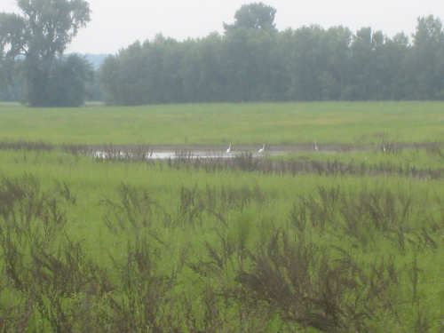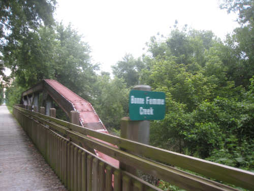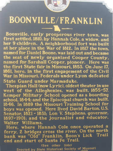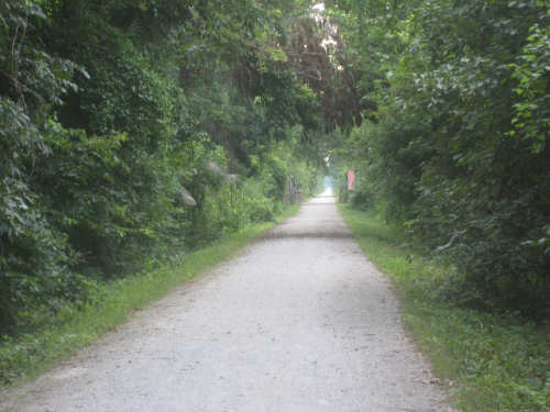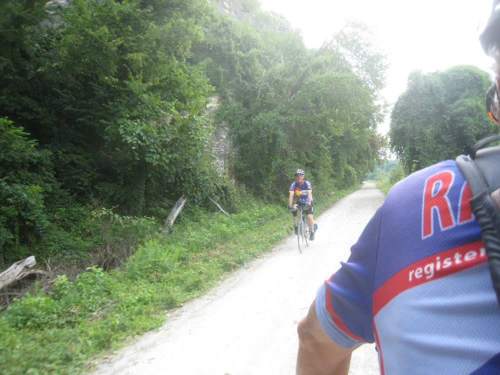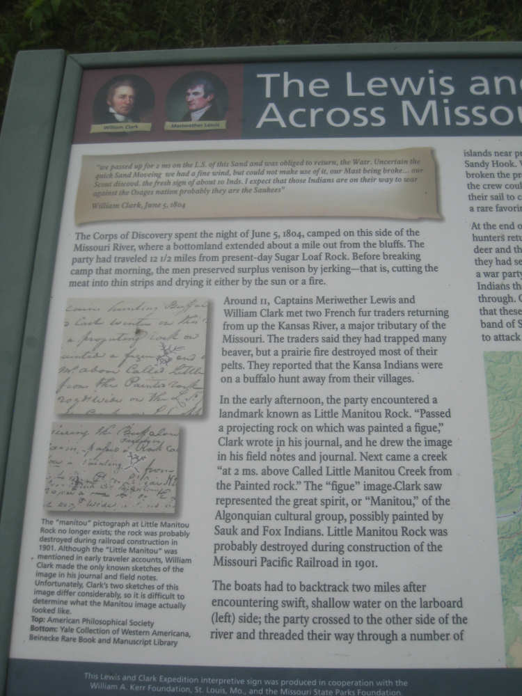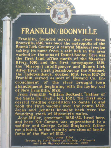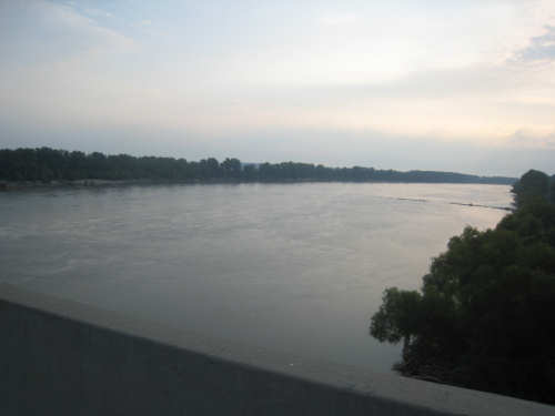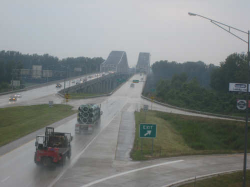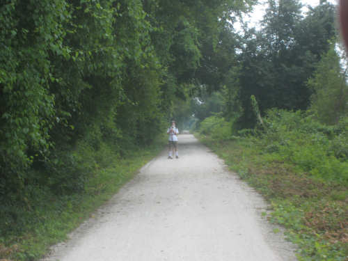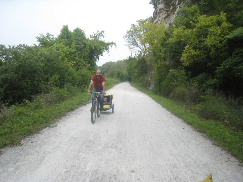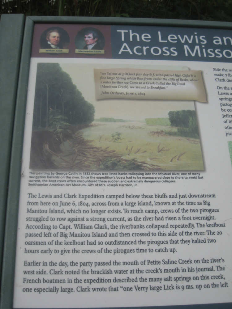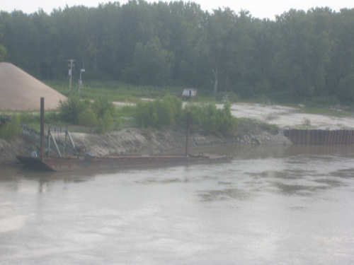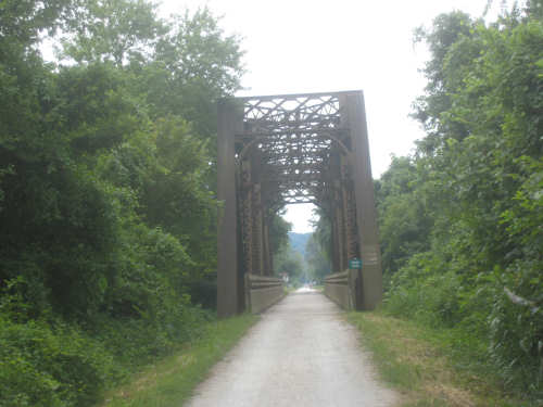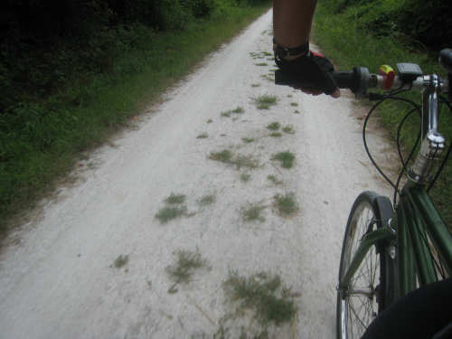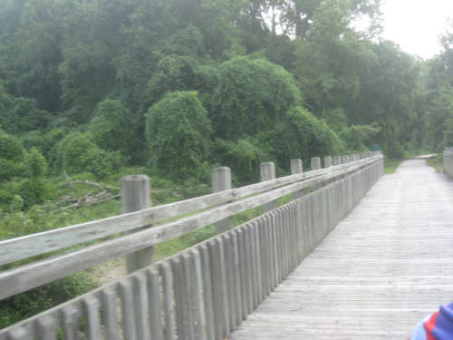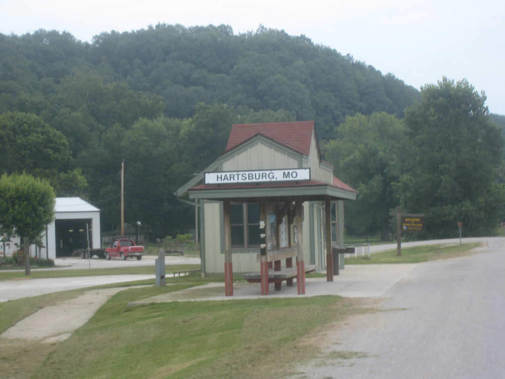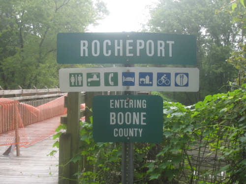 Wednesday, August 20, 2008 Well, today was hardly boring and we have a bumper crop of pictures for you. Most of them are Lewis & Clark historic markers - there were lots of them along the trail. But there were also plenty of interesting things about the Katy Trail itself. We left Boonville this morning at 7:30, having had the continental breakfast at the motel since they told us, correctly, that nothing in town opened until 10 or so. We went through rush hour traffic on narrow, no-shoulder roads for a few miles before reaching the bridge across the Missouri. Everyone was very considerate though, and we did our best to get off the road when large trucks or school buses wanted to get by (school is already in session out here!). The bridge itself, thankfully, had a wide shoulder and we turned off for the Katy Trail soon after that. The Katy Trail was easy to spot - there were tons of welcome signs and historic markers at the trailhead. The trail doesn't start there; it is about 265 miles all together and starts in Clinton, MO, more than 75 miles to the southwest. It's a rail-to-trail converted from the Missouri-Kansas-Texas (MKT, or Katy for short) railroad line that ceased operating in the mid-1980's. We picked up the trail at about mile 190 at the Franklin Trailhead, as instructed by Adventure Cycling, but noticed that we could have picked it up in Boonville 4 or 5 miles sooner. As we went across the bridge, we saw an old railroad bridge a little to our left and wondered if the trail went over that bridge. At any rate, we got on the trail and found it to be both flat and relatively smooth (for an unpaved trail); it was lots smoother than the C&O Potomac River trail we were on almost 2 years ago, and even a little smoother than the Steamboat Trace Trail we were on in Iowa. We were very impressed at how well maintained it was, especially given how long and how prone to flooding it is. There were some rough spots and it was slower-going than a paved road, but overall was not as difficult as we thought it might be. We started off with crop fields on either side of us and continued to see them intermittently through the day. The Missouri River was close by to our right, but it meandered in and out of sight. We were right next to it in a number of spots, and in others, we were next to marshy or bottomland areas that clearly got flooded by the river often. The mosquitoes were bad in those areas; they didn't bother us while we were riding, but as soon as we stopped for a rest or to take pictures, they were all over us, so we didn't stay in one place for long. To our left, there were the Missouri hills we're so fond of. Like the river, they were sometimes very close and sometimes in the distance with farms or towns between the hills and the trail. Much of the time that they were up close, they had impressive cliffs, with interesting caves and other formations. There was one short tunnel on the trail, which we went through. There were also several towns along the trail, some of them with train stops converted to information booths. Unfortunately, most of the restaurants or cafes in the towns we went through today were closed for one reason or another. We did find a good diner in McBaine where we had lunch but weren't able to stop anywhere else for a soda or snack - most disappointing. The trail has mile markers and has an Adopt-a-Trail system where donors can support the trail by "adopting" a mile of it. There were also several benches along the trail, each of them donated in memory of someone. The trail is well-used by Missourians. We saw several other bikes, some solo, some couples, and some families. There were also a few walkers; the first fellow we saw on the trail was John Hutch from Kansas City. He was standing by a small box turtle as we approached, to make sure we didn't run into it. We stopped to chat with him for a while. Most of the people we spoke to were from various towns in Missouri and were doing day trips on a part of the trail. We didn't see any other long-distance cyclists on the trail. NOAA had predicted rain this afternoon and, sure enough, it started to sprinkle when we still had about 10 miles to go on the trail. We got off the trail at the North Jefferson trailhead and had to wend our way over to Interstate 54 to get on the bridge into Jefferson City. The interstate is a divided highway with separate bridges in and out of the city. We had to get on the east-bound bridge going the wrong way; it was the only side with a shoulder that bikes were allowed on. Jefferson City is the capital of Missouri and we could see the capital dome well before we got on the interstate. As we came into the city, though, we went right by it, so we got an even better look. We really splurged tonight and stayed at the Doubletree near the Capital Building. It was very elegant and very welcoming, even to two bedraggled-looking bicyclists. They gave us 2 delicious chocolate chip cookies (Ghiardelli chocolate!), fresh from the oven, as a check-in treat. We got some laundry done and had a wonderful meal in their restaurant. Then we had to get to work sorting through all our pictures and getting the web page up. We're a little concerned about the effect the rain will have on the trail. It didn't rain much today, but it's expected to continue for the next 2-3 days, so we could have a pretty muddy path. Today, we went just under 57 miles (about 47 on the trail) in 5-3/4 bike hours, arriving at our hotel at 3:50. Tomorrow should be a little bit shorter but may be tougher because of the rain. |