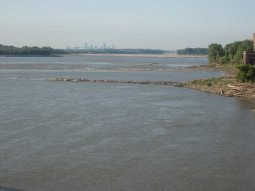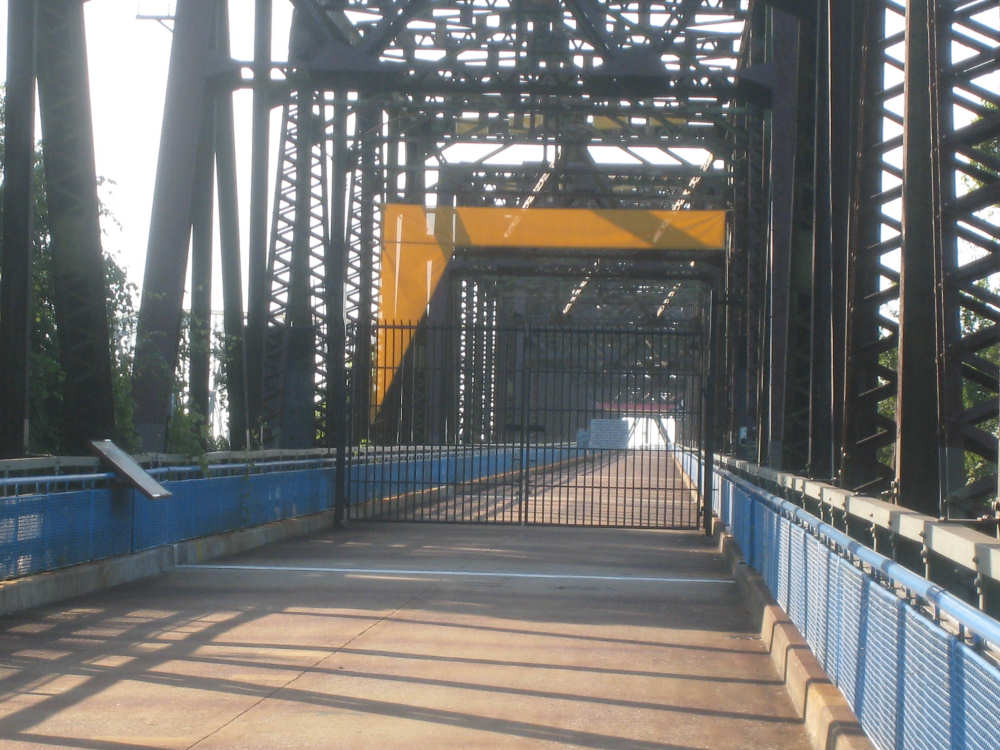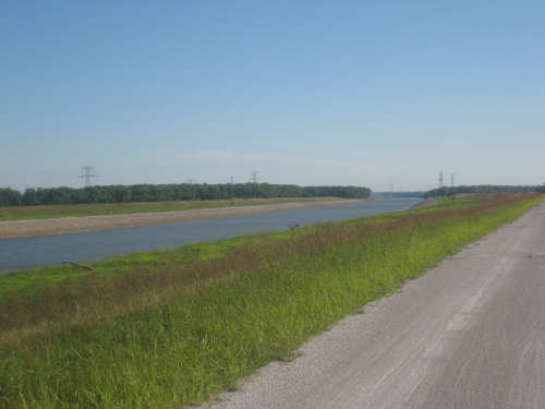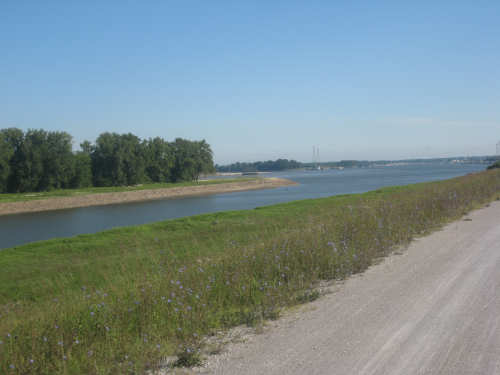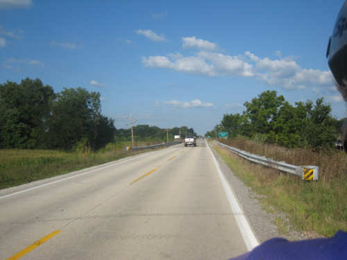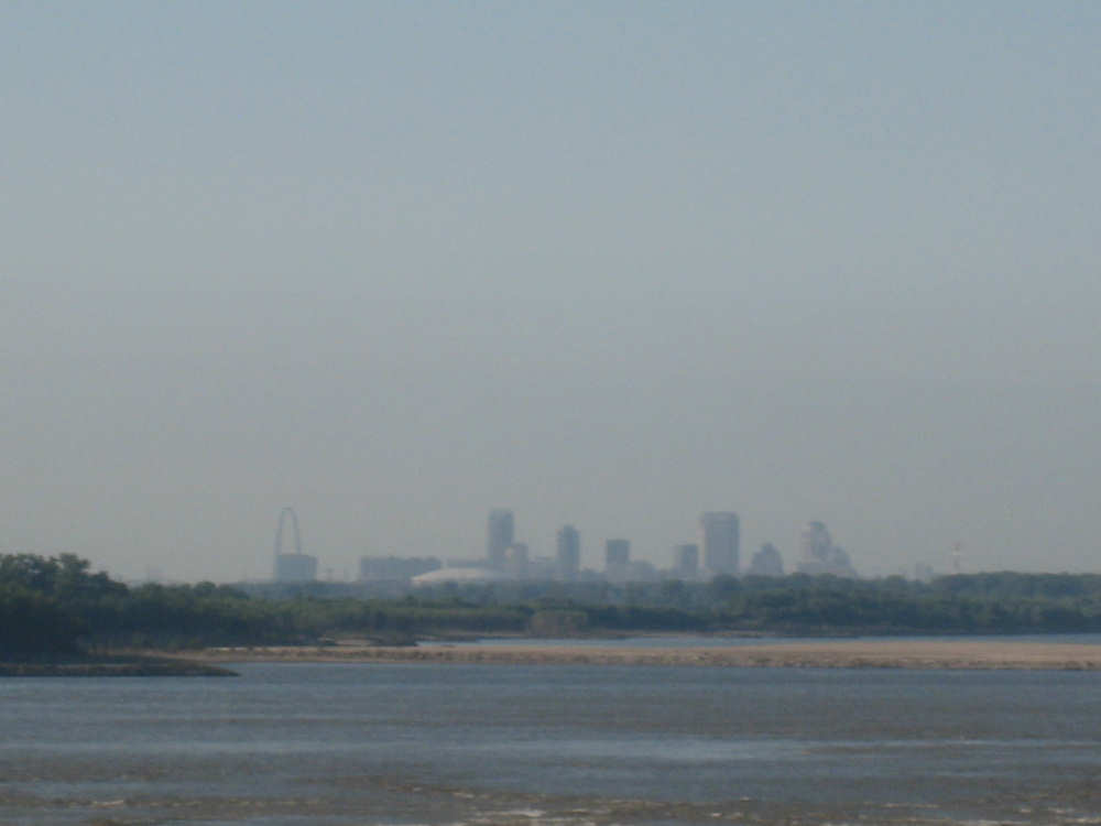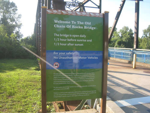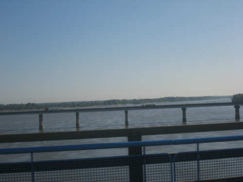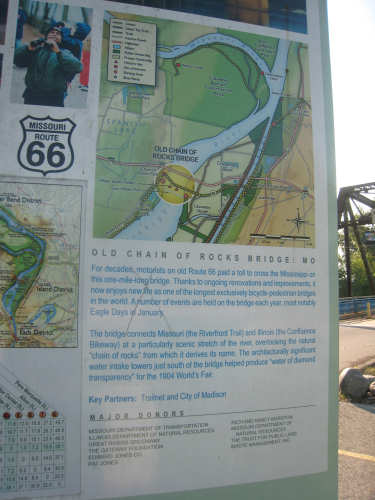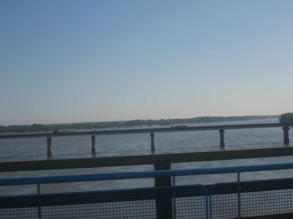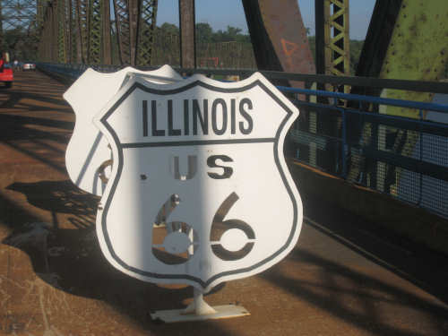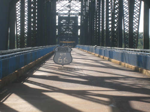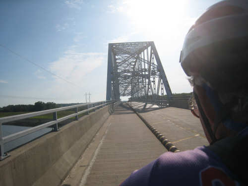 Monday, August 25, 2008 Beautiful day today - the humidity was much lower and it was a little cooler than it's been. The wind was stronger than we expected, and was a headwind, naturally, so it slowed us down some, but at least it was much less hilly than Missouri had been. We started out with a short ride to the Chain of Rocks Bridge, a pedestrian/bike bridge over the Mississippi River. We were very lucky to run into another bicyclist going there as well. This was Mike, who makes this trip every day on his way to work. He asked us about our trip as we were biking over to the bridge and then led us to its entrance. When we got to the bridge, we found out it was closed. The sign by the bridge clearly stated it was open 1/2 hour before sunrise, and it was definitely well after sunrise at that point. Mike wasn't worried, though, and convinced us that it would not be a long wait. He also said that the alternative, going on the nearby 270 bridge, was "suicidal" - lots of traffic, especially trucks, and no shoulder. There was another bridge farther north, as well, but it didn't have the charm of this bridge. The Chain of Rocks Bridge is a restored Route 66 bridge and had several relics from that era, as well as a 1929 restored fire truck. The Chain of Rocks refers to a string of rocks across the Mississippi, referred to in the Lewis & Clark journals, that blocks navigation on the river. There is a canal alongside the river that boats and barges can use to get by this natural obstruction. While we waited for someone to come unlock the gate across the bridge, Mike whiled away the time telling us about the bridge and the Route 66 mementoes, and explaining how to get on the trail at the other end of the bridge. If he hadn't been there, we wouldn't have known that we should wait and might have taken our chances on 270. Someone did finally come and open the gate and the bridge was delightful. It was especially nice that we could stop and take pictures without worrying about traffic. In the middle of the bridge, we crossed into Illinois, our 26th state! We didn't have a welcome sign, but the boundary was marked by old Route 66 signs, one from Missouri, and one from Illinois. At the end of the bridge, we were on Choteau Island and crossed the canal on another bridge, then went on a bike trail alongside the canal to get to the Lewis & Clark Park. Mike had zipped ahead by now so as not to be late for work so we were on our own now. We got to the end of the canal, where it rejoined the Mississippi, and we thought the park was just a little ways ahead so we continued along the trail. We saw what we thought was the Lewis & Clark monument, a beautiful structure that looked like one solid building when we first saw it, but turned out to be 2 towers joined together by little bridges when we saw it from the side. It was out in the middle of a field, though, apparently not complete yet, or at least not open. We soon saw from our GPS that we had gone past the access to the river where we had hoped to see the confluence of the Missouri and the Mississippi, but we hadn't seen anyway to get to the river since we left the canal. We retraced our steps until we were almost back to the canal when we saw another guy on a bike who confirmed that the only river access he knew of was at the Chain of Rocks bridge and then about 4-5 miles north of there. That was very disappointing and we went on our way, having already taken much more time than we expected there. It occurred to us later that we actually had seen the confluence right where the canal joined the Mississippi, and checking our maps tonight confirmed that. It certainly wasn't as impressive as we had imagined, but that point was the last time we saw the two mighty rivers. We passed through a few towns on the rest of today's journey, as well as several crop fields, mostly corn and soybeans, as usual. Our first town was Edwardsville, the county seat of Madison County and home of a huge Southern Illinois University campus. We passed the campus four miles before we came to the town. The town was very elegant and quaint, clearly a university town in its abundance of eating places and quirky shops. We had lunch at a nice place across from the county courthouse and administration building, both very impressive structures. Our next town was Hamel, a much smaller town, but with the distinction of being on the legendary Route 66, something they touted at every turn. We went through another small town, Alhambra, and then skirted the edge of a larger town, Greenville. Tree farms and nurseries seemed to be a thriving business along the route. We spent most of the day on two-lane roads, mostly without shoulders but in good repair. Some of the roads had a fair bit of traffic, but the Illinois drivers have been just as courteous as we've experienced in each other state, giving us a wide berth as they passed and slowing down behind us when it wasn't safe to pass. We ended the day on Rt. 40, parallel and close to I-70, which was a noisy road with a lot of trucks on it. This meant that most of the traffic was on I-70, which was a very good thing for us. It was a long day - we started at 8 this morning and arrived at our motel in Vandalia at 6. We did a little over 73 miles in 7 hours and 20 minutes, not bad considering the headwind. Our motel had a restaurant right next door, which makes life so much easier for us - and they open at 6 for breakfast! Tomorrow's another long day and we'll have another east wind, but it will also be fairly flat. |