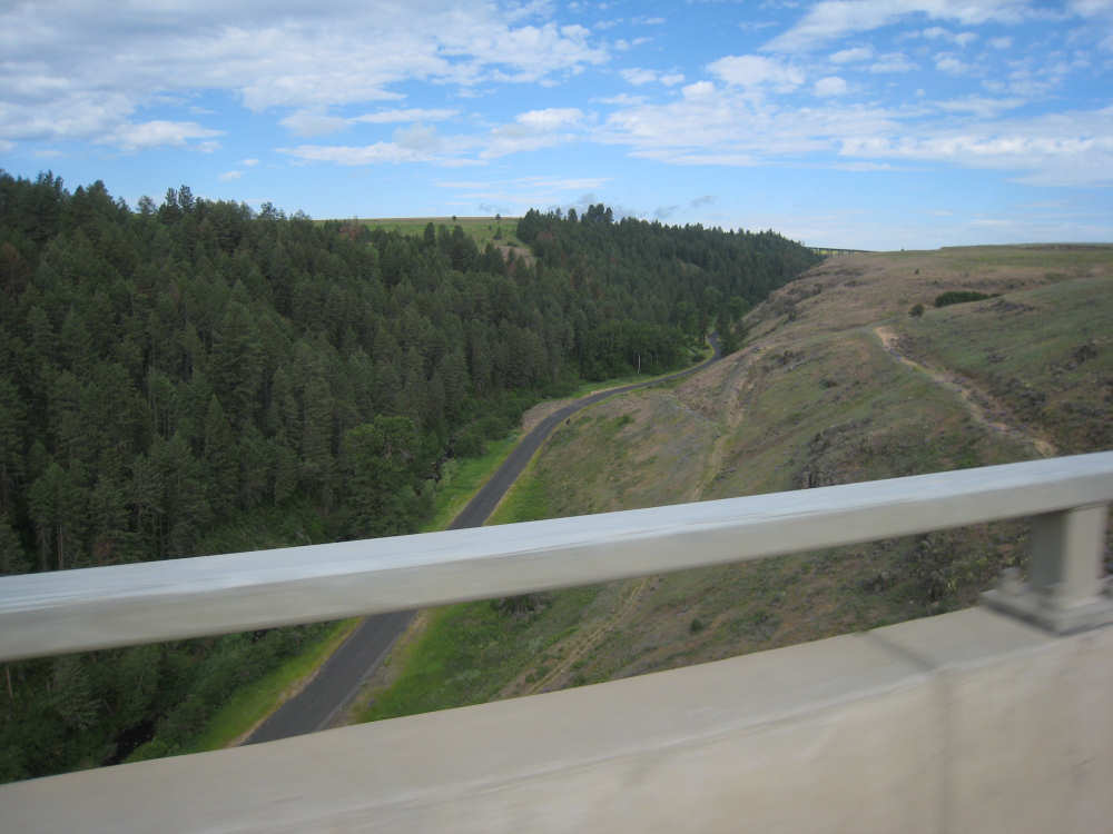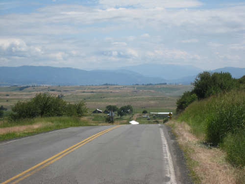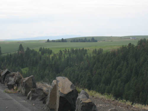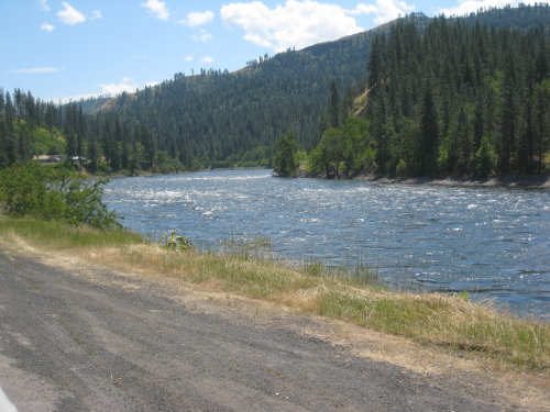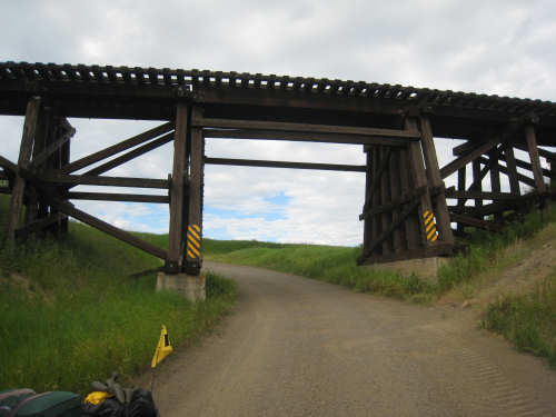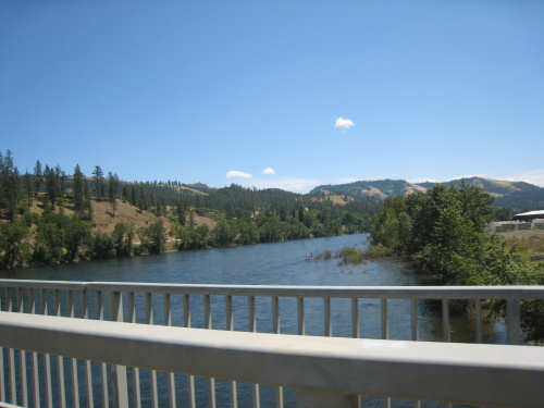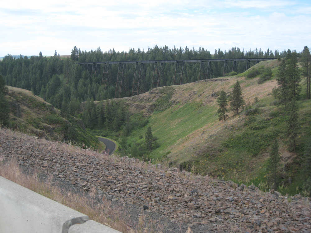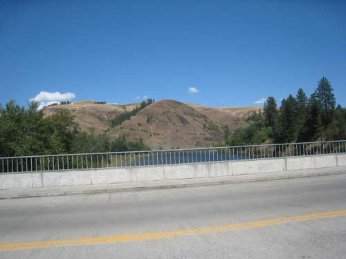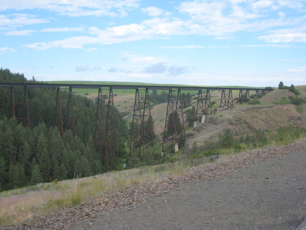 Saturday, July 05, 2008 We had a lovely night at the bed & breakfast, and a wonderful breakfast this morning. LaVina is a great story teller and has lived in the area for some 60 years, so she had all kinds of information on the history of the place and her house is full of antiques from generations of their families. Her husband's ancestors were one of the early pioneers who settled the region. She told us one story of their salvaging an old barn and transporting it to their place to use as a guest house. They didn't have any trouble until they tried to get under a railroad trestle a few miles from their house (see picture below). Luckily, a crew was there grading the road at the time and they just graded it a little deeper under the trestle so they could get through! We lingered over breakfast and finally got going around 8 am. We had a short day today with not much climb, so we figured we could be indulgent. We ended up going almost 45 miles in under 4-1/2 bike hours, arriving at our motel at 2:30, so it worked out. We left LaVina's and headed back out the hard-packed gravel road their house is on to get back to Rt. 95. The road was very straight and had a lot of rolling hills, the kind we would usually fly down and try to coast up. Given the gravel, though, we had to be very careful on the downhills and even so, we did some slipping and sliding on one of them, but we made out ok. Shortly after we went under the trestle she had told us about, after 3 miles of gravel road, we were back on 95. We continued to ride past rolling, forested hills and farm fields with green or yellow (canola) crops and beautiful vistas. The road we were on was rolling as well, nothing too steep or long, though. We continued to see many historic markers today and took pictures of most of them. We eventually turned off 95 onto a series of narrower roads with not much shoulder but also not much traffic. These roads went through farm fields mostly with some great vistas and a geological marker for a change. They also had a lot of rolling hills, most of them short enough to be fun. We were struck by what good condition nearly all the farm buildings were in, not like the run-down, falling-apart buildings on a lot of farms in the South. They usually looked brand-new and spotless. We came upon a very small town called Greencreek which was also very new and clean looking, despite the fact that it was established in 1895, according to their town welcome sign. Very impressive. By the time we reached the bottom of our last and longest hill, we were starting to get tired. We stopped to eat the oatmeal cookies LaVina had packed for us this morning and rest a bit. When we got to the top, the view was spectacular - the whole valley was laid out before us with more, bigger hills in the distance. We went downhill most of the rest of the day, with a fairly steep 8-mile stretch from that point. We went from our 4100-foot plateau at Craigmont down to about 1500 feet, mostly in those 8 miles. Towards the end, when it was less steep, we passed several large hills which may have been the Kamiah buttes, mentioned in the geological marker. Very picturesque. We reached Kamiah and stopped for lunch and then turned back on Rt. 12 and along the Clearwater River again (remember, we rode along it for several miles yesterday morning out of Lewiston). The river was as beautiful and fast-moving as it was further down-river yesterday. We passed a little beach and Pat screeched to a halt to go down to the river and test the waters. He found them pretty cool and refreshing. A group of kids with their parents were also enjoying the river nearby. We reached the town of Kooskia shortly afterwards and pulled into our motel. After a nice cool morning, it had gotten pretty hot again, so we were glad to have ended early. Tomorrow will be another long climbing day, ending in a campground. We don't expect to have cellphone or internet availability so the day's page will probably not be up until the day after. |