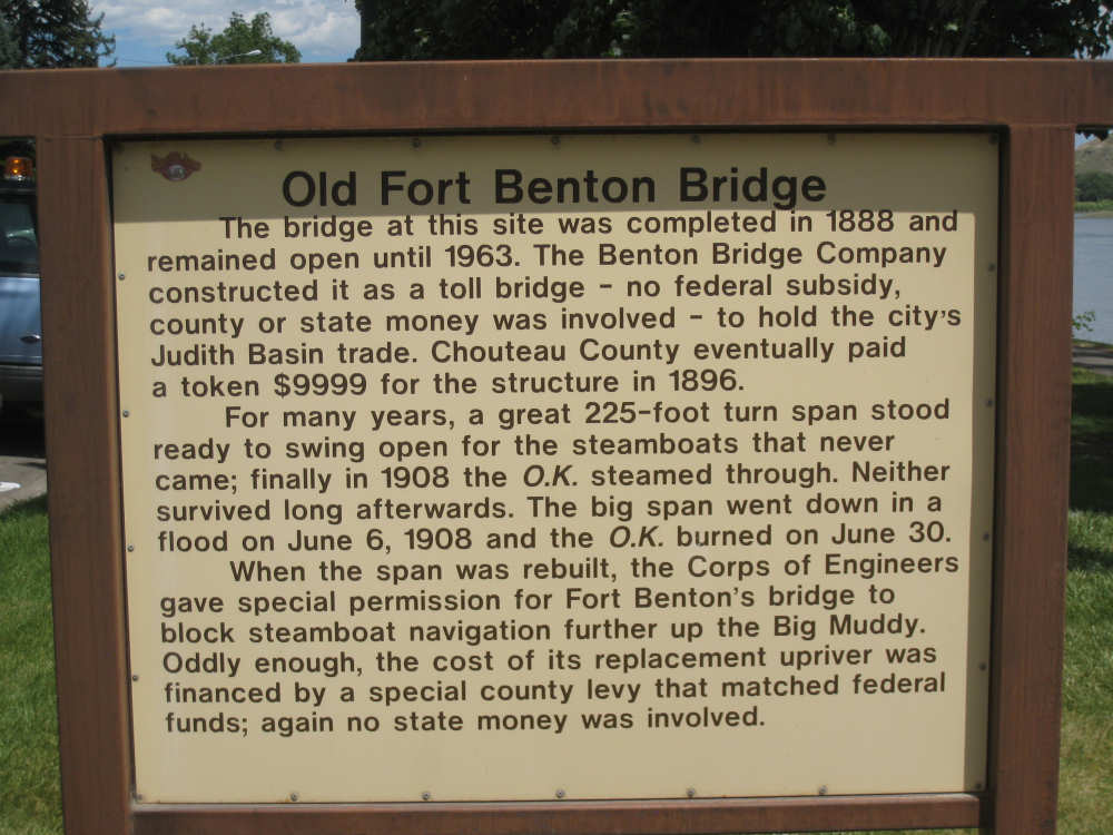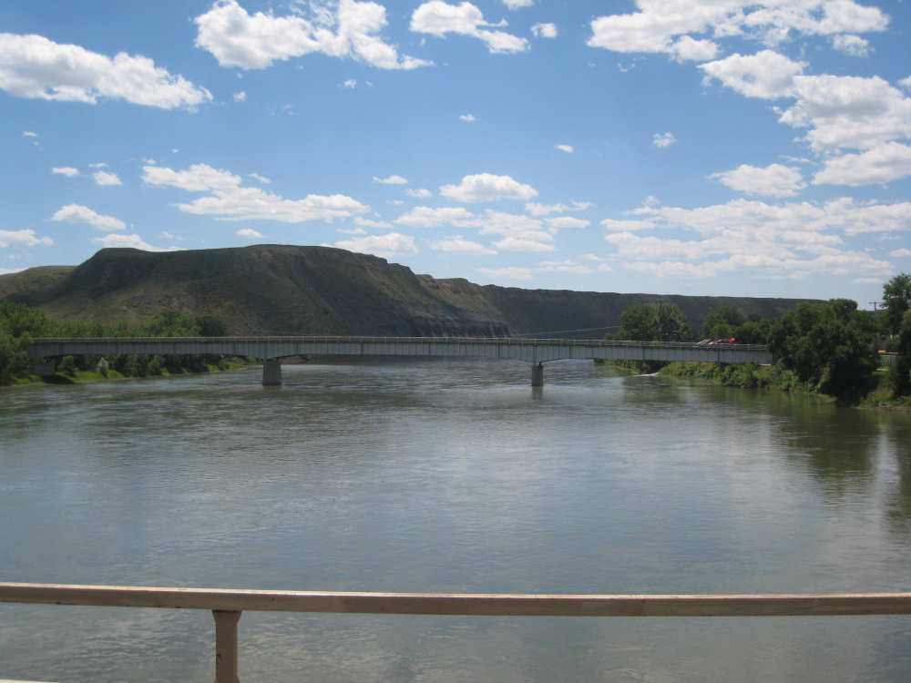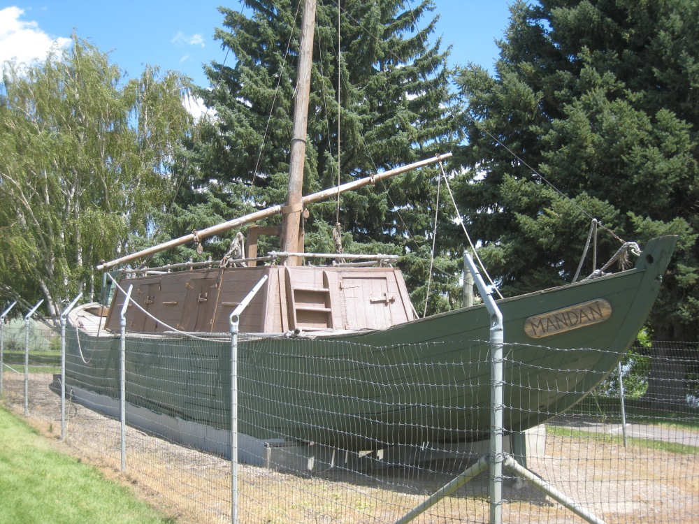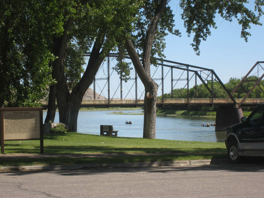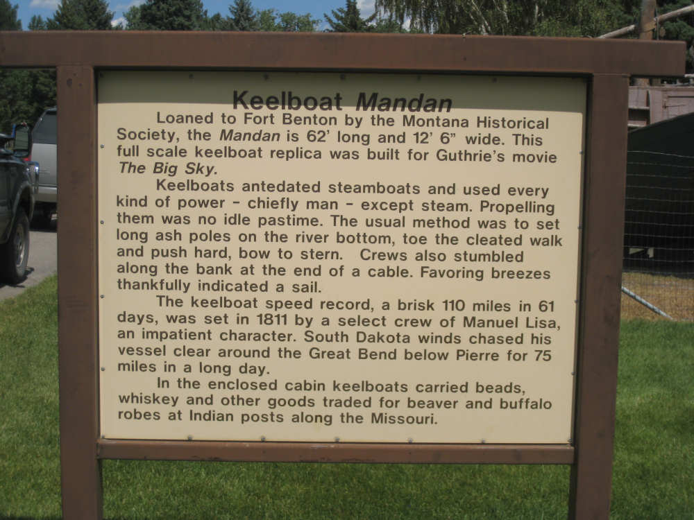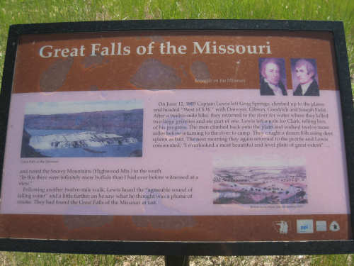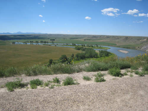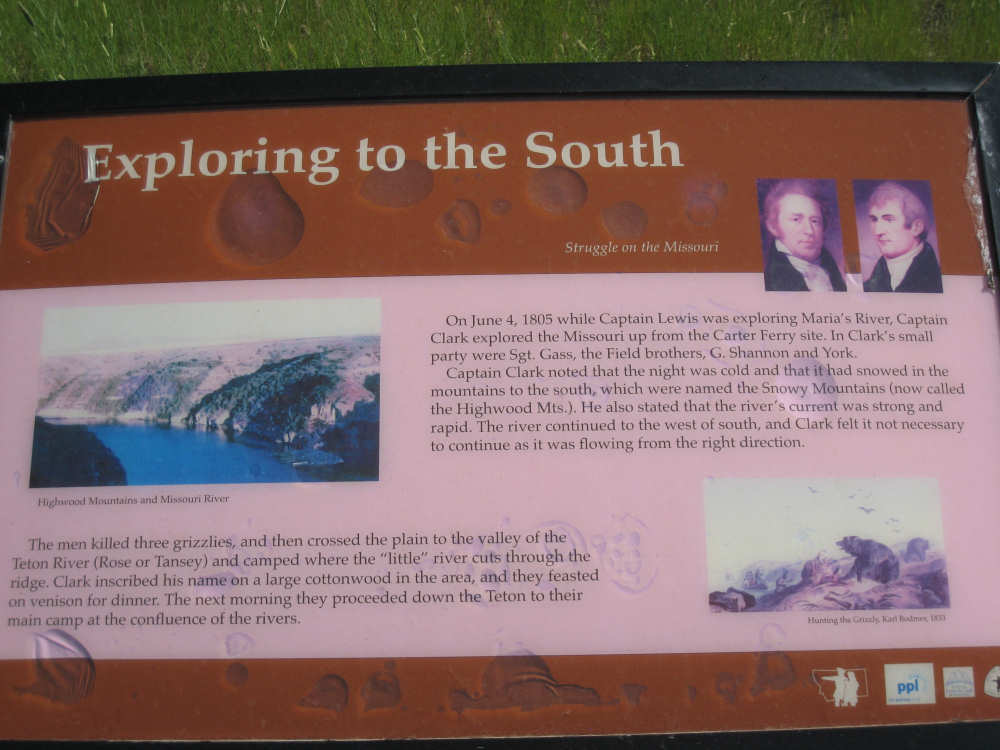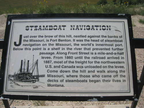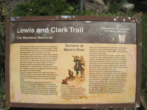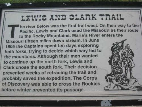 Monday, July 14, 2008 Another pretty easy day, mostly downhill except for a couple of hills - one of which was the climb out of Great Falls, shades of the L&C Portage! The temperature was pleasantly cool again this morning, in the 50's I think, and we had a great tail wind again as well. We set out across the Missouri River after breakfast at a nearby restaurant (they fixed us some sandwiches to take along as well, since we didn't have any pass-through towns today. Just as we got to the bridge over the river, we passed a lady walking over the bridge and we asked her if she would take our picture, which she kindly did. So we got our 6000 mile photo with the Missouri behind us. After we climbed the hill out of Great Falls, we were on a plateau for most of the day, descending very, very gradually - from about 3500 to 3000 by the end of the day. We were on Hwy. 87 nearly all day, and it was straight as an arrow for a good part of the day, so we could see it stretching out ahead of us. There were some rolling hills at the beginning which slowed us down a bit. One downside of our early morning ride was that we found a lot of hungry mosquitoes. They didn't bother us when we were zipping along donwhill, but when we slowed on the uphills, they came in for a bite. We tried to stop for a rest at about 20 miles and they were so annoying we had to go on. Luckily, their numbers diminished after that and we didn't have any further trouble from them a little while later. The terrain during most of the day was mostly farm fields as far as we could see on either side, growing either hay or some other kind of grain. We saw a few clusters of houses like little subdivisions out in the middle of nowhere, and a few single farm houses, but most of them were way off on the horizon or completely out of sight. Today was a big historical marker day. When we stopped at the little town of Carter to eat our sandwiches, we found two Lewis & Clark plaques in a field next to a bar/restaurant that had been closed for a year or so. We didn't see anything else in Carter except for grain silos, some houses, and a sign for a quiliting shop. Then as we approached the town of Fort Benton, a very historic town itself, we found a viewing area where we could see the Missouri River and a bit of the town below us. It made our position, being up on a plateau, very clear; we dropped another 200-300 feet very quickly going into the town. There were also a half-dozen historic markers up there in the viewing area, most of which were about the town and the area nearby, and only one or two about Lewis & Clark, the main point being that it was near here that Lewis correctly chose to go up the Great Falls fork rather than the Marias River. We took pictures of all the plaques there and marvelled at the beautiful view before going the last 3 miles into town. We arrived in town around noon, having left Great Falls about 7:40. We had reservations at a fancy hotel - the Grand Union, one of several places in town that is a National Historic Landmark; we knew we were awfully early to check into our hotel, but were aghast when the woman at the desk told us the room wouldn't be ready until 4. She also told us we couldn't bring our bike inside until after 10 pm when the restaurant was closed. We were thoroughly annoyed at this point and stalked off to have some food while we considered what to do. We found a very friendly restaurant a block or so away and ended up bringing our laptop over there and working on the website for an hour or two. The rest of the time we wandered along the riverfront taking in the sites. There were a number of historic markers in the park along the river, as well as a lovely walking bridge over the Missouri, a statue to a faithful dog named Shep who waited at the train station there for his dead owner to return, a replica of a keelboat used extensively in the 1800's, and finally a statue of Lewis, Clark, and Sacajawea commemorating their choosing the right fork. Some of the markers here were essentially the same as the markers at the viewing area, but they were enough different that we thought they might still be of interest; sorry for the duplication. When we headed back to the hotel to check in around 4, there was another woman at the desk who was much more helpful and accommodating. She found a cubbyhole to tuck our bike in for the night and answered all our usual questions about the timing of breakfast and where to get ice, etc. So we went up to our room for a shower, feeling a great deal more mollified. We will be going down to dinner soon which should cure any lingering ill will we might still have. We ended the day at 42 miles in 3-1/4 bike hours, even better time than yesterday. |