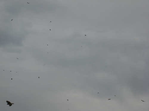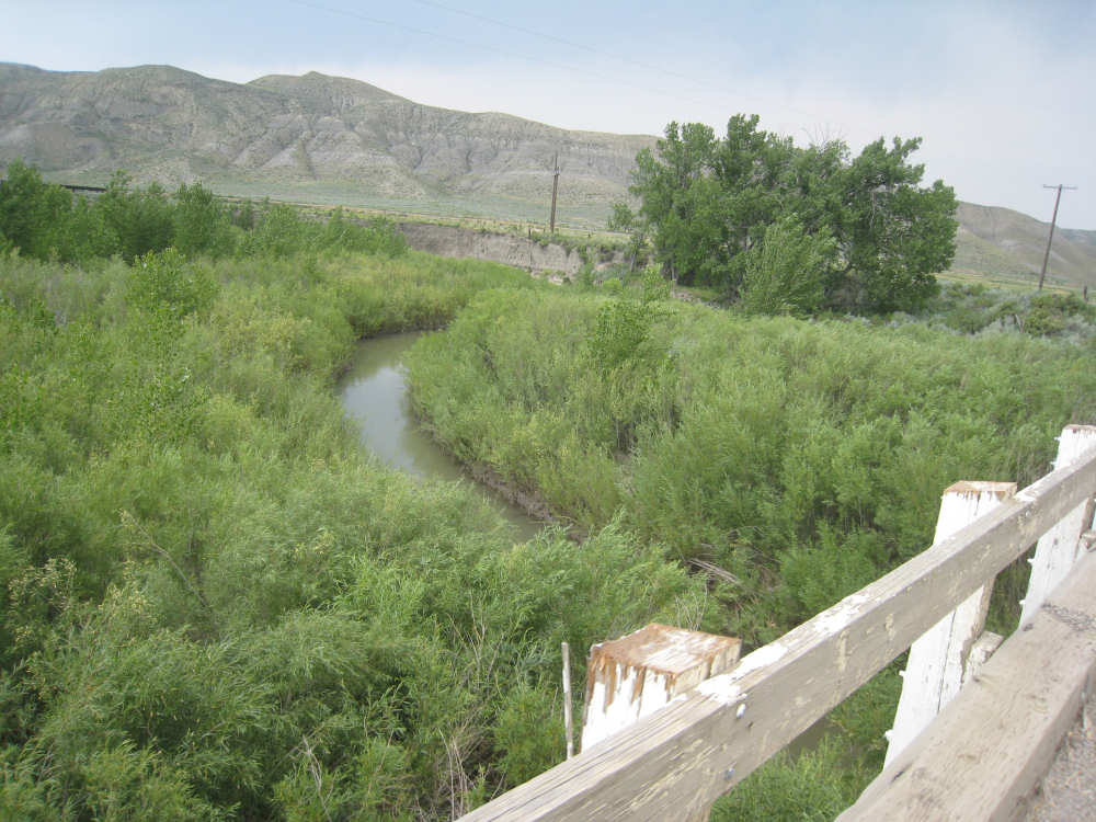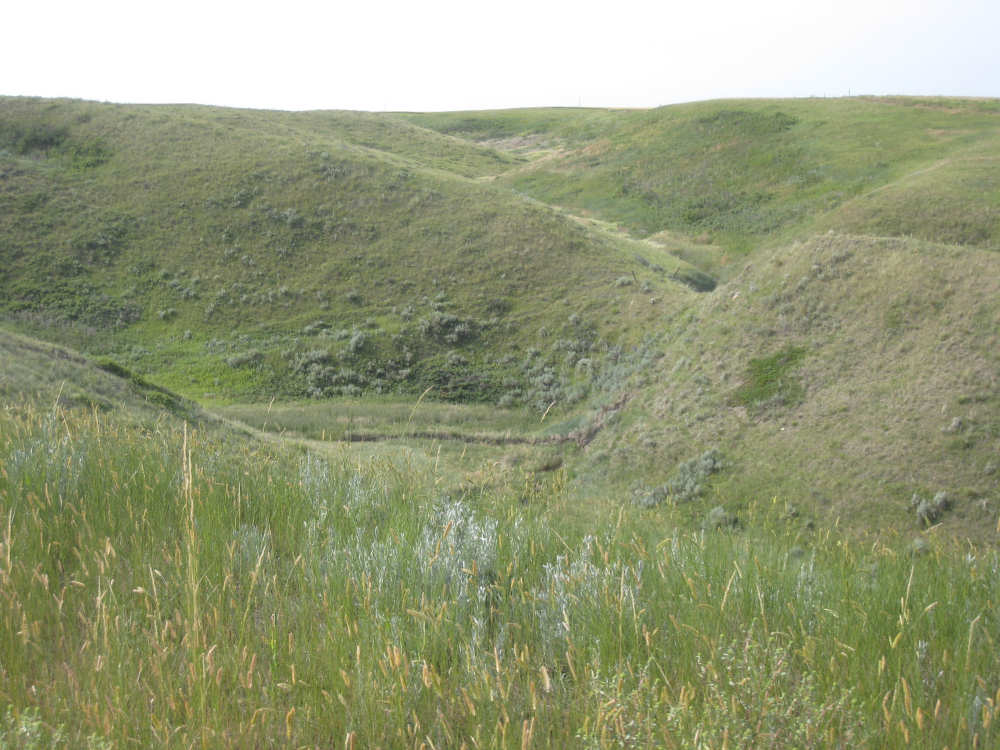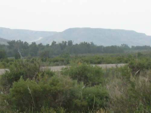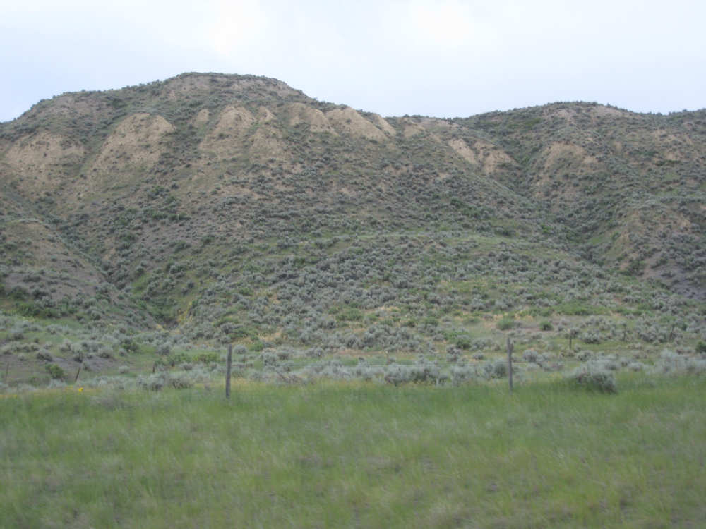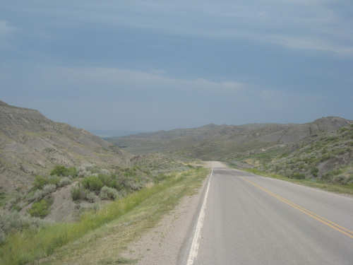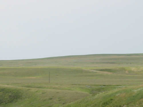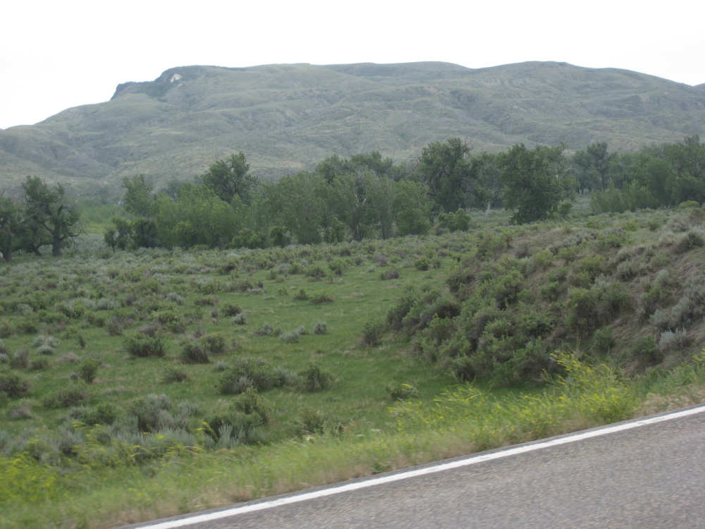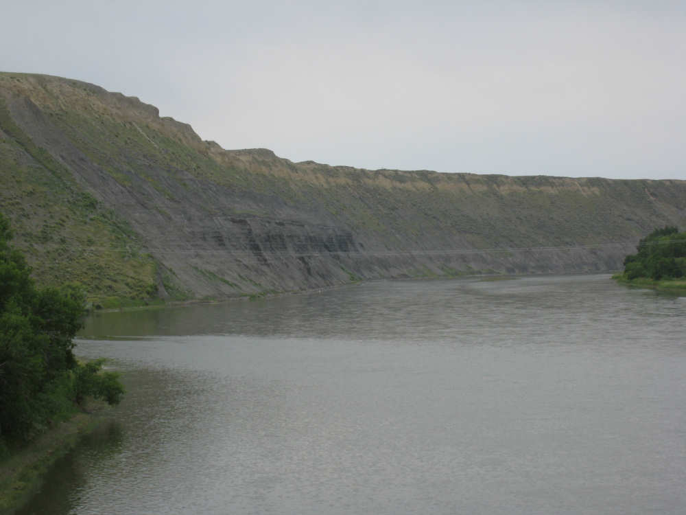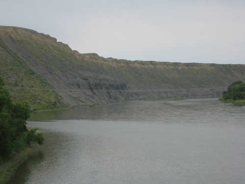 We had a later start than usual, as the hotel's breakfast didn't start until 7:30, but we had a nice chat with 2 couples staying at the hotel while we waited. One couple were land surveyors who were working in the area, the other were touring the area with a group. The morning hotel manager was very helpful, when she heard we were going to Denton she warned us about the big hill we would be going up. We already knew the hill was long and steep, but she also told us there were some rough stretches on it where it had loose gravel on the road. So we had even more to look forward to. We got off at 8:15 and headed across the Missouri on Rt. 80. We heard lots of birds chirping as we came to the bridge and soon saw a huge flock of swallows swooping in all directions over the water. We wished we could bring one or two of them with us to take care of the mosquitoes. We didn't have too much trouble with mosquitoes today, actually - maybe because of the strong wind - but we did have a few unfriendly encounters with some horseflies. The cliffs along the Missouri were beautiful; the hotel manager explained that there really wasn't any name for the high part of the land (what I've been trying to call mesas or buttes), that was just the land. The openings in the land, most notably where the river cut through it, were called the Breaks, as in the Missouri Breaks. So we climbed out of the Missouri Breaks this morning, soon after we crossed the bridge, our first big hill.