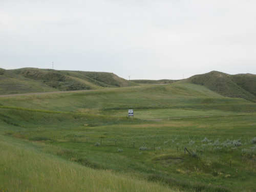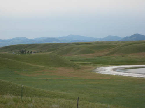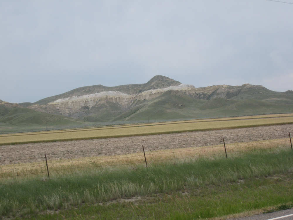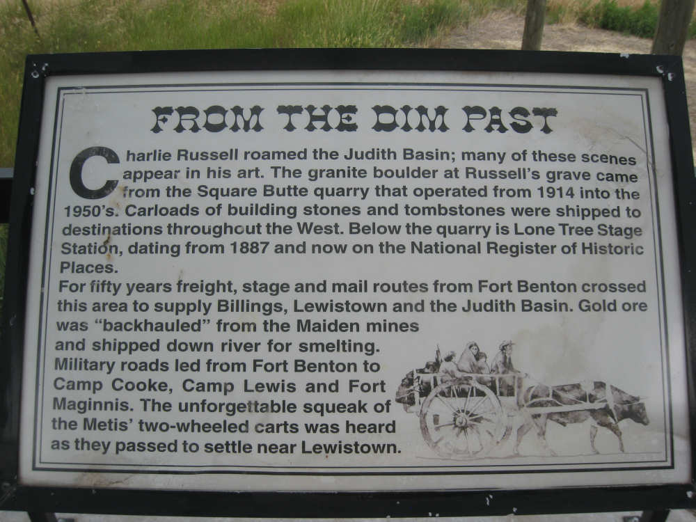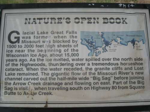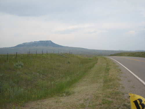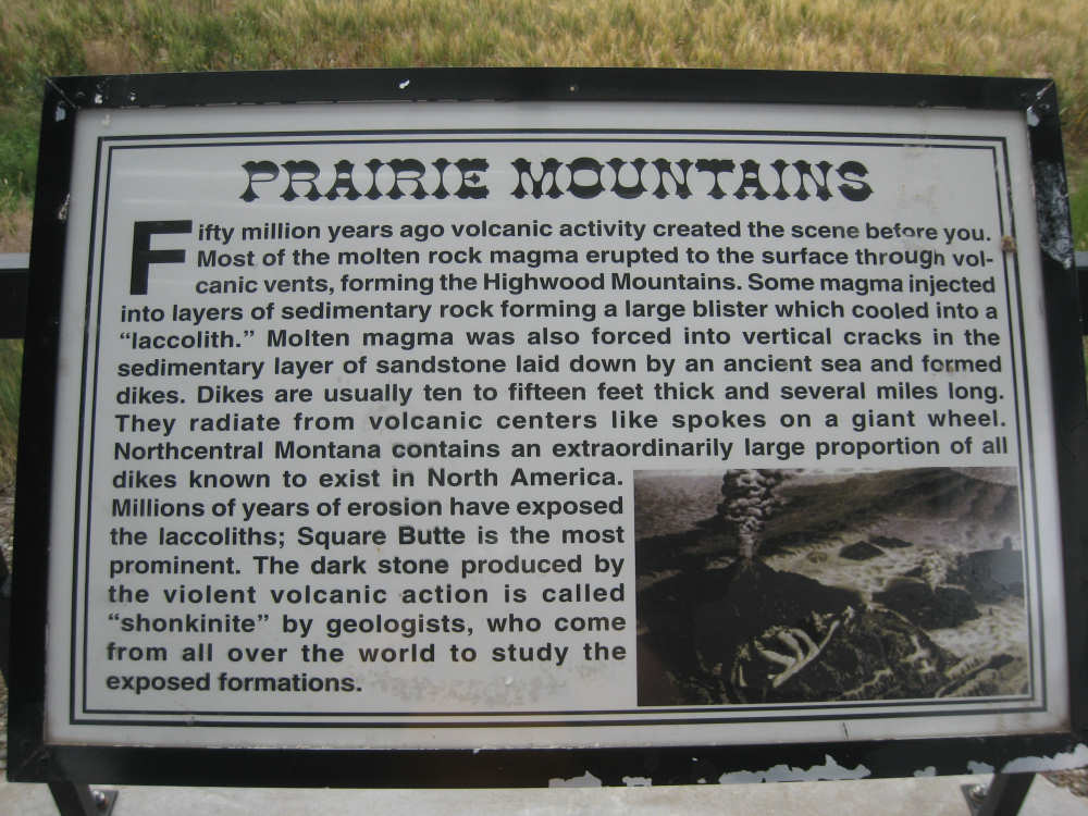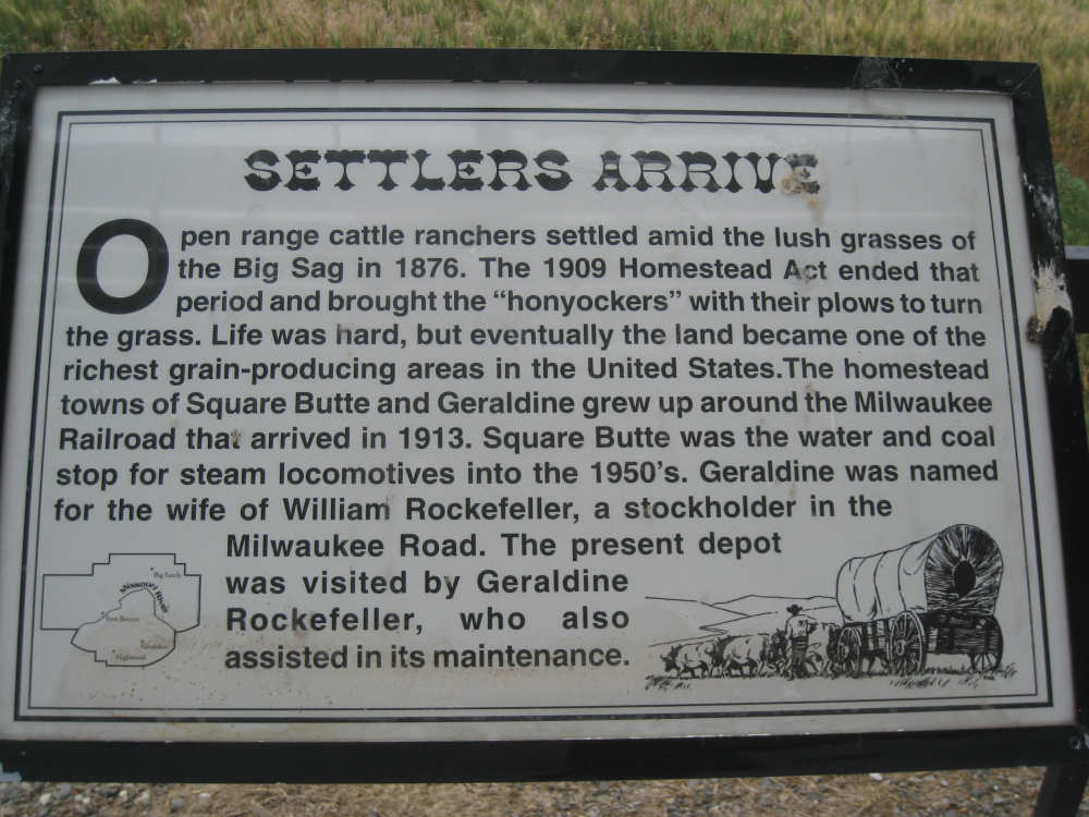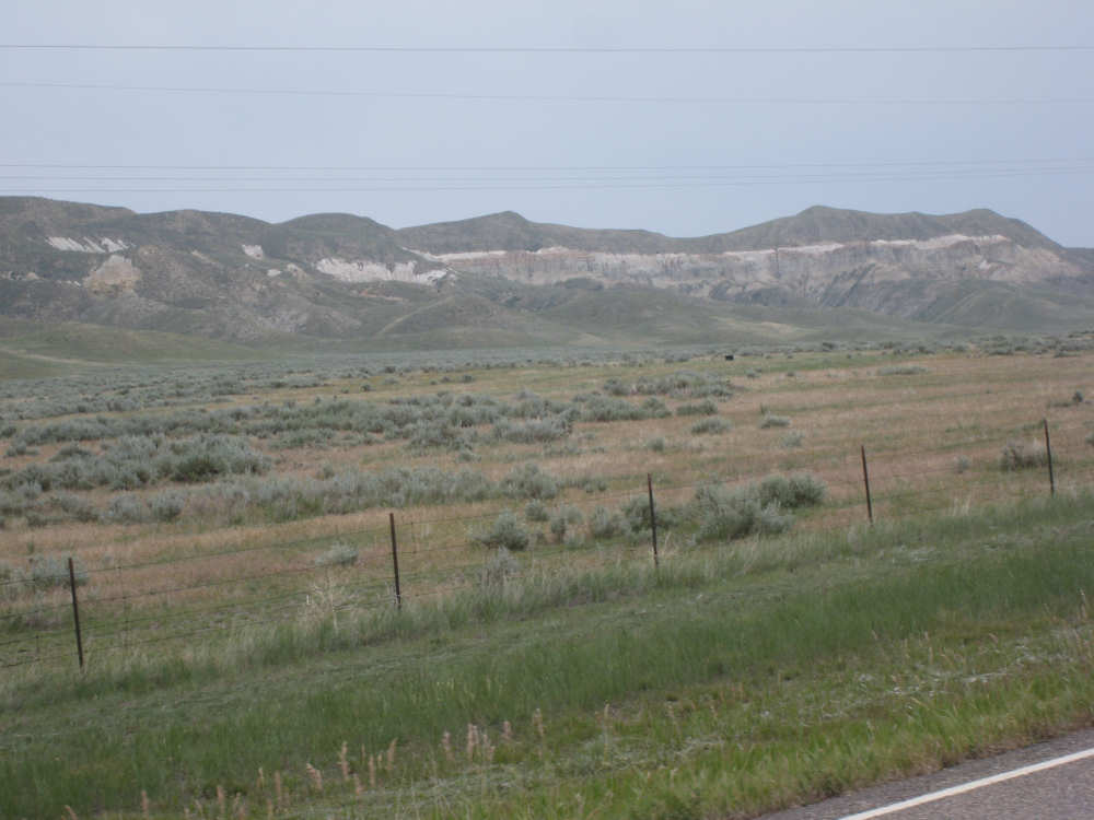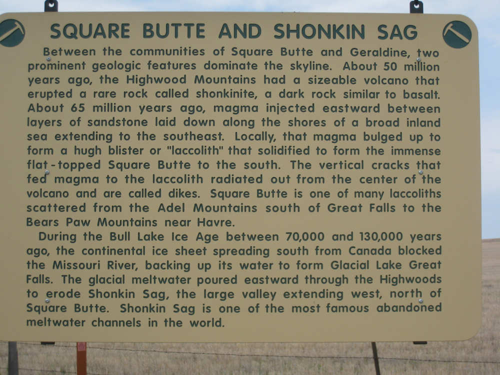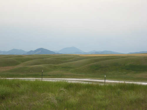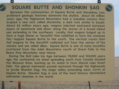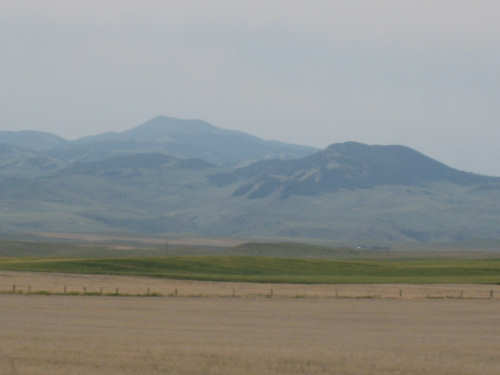 Once we got back up to the high land, we expected to see flat terrains and farm lands like we've seen the last 2 days. This area was quite different, though, it was more rolling and marked with many more ravines and gullies, more scrub brushes, and some interesting buttes and cliffs. We could still see the Highwood Mountains in the distance and had some plaques explaining their origins and the geology of the area. We saw a very large butte off in the distance before we saw the plaque describing it. This was Square Butte, which we passed today, as well as the small town with the same name. Our first and only significant town was Geraldine, about 26 miles from Fort Benton, where we stopped to eat lunch. The 2 land surveyors had passed us on the road early this morning; they had said they would be working in Geraldine and we had hoped to see them there at lunchtime, but we didn't see their truck anywhere. The restaurant/bar there turned out to be quite good and we had them pack us some sandwiches and goodies to eat on the road later. We went on, a little worried about how late we'd be getting to our motel, but the afternoon went a little better, with those few bouts of tailwind mixed in with the headwinds. The beautiful scenery helped take our mind off the hard work of pedaling.
