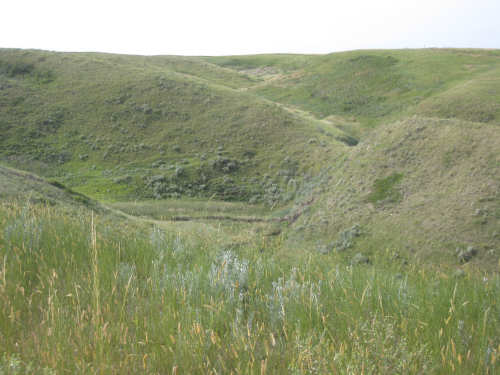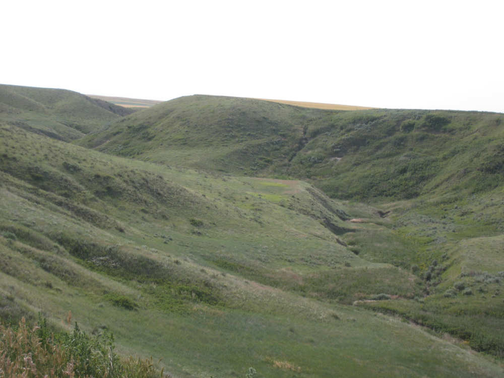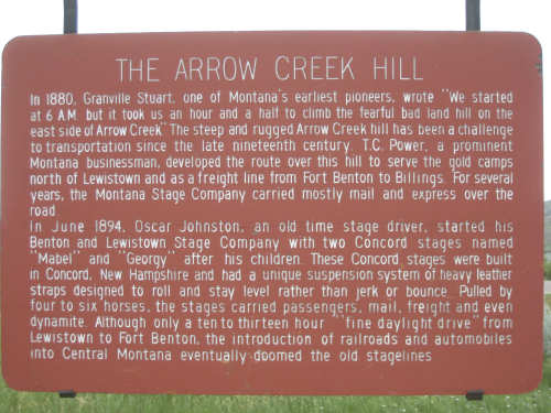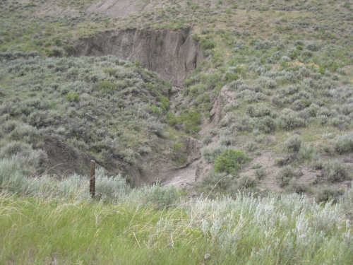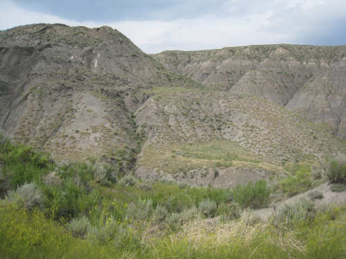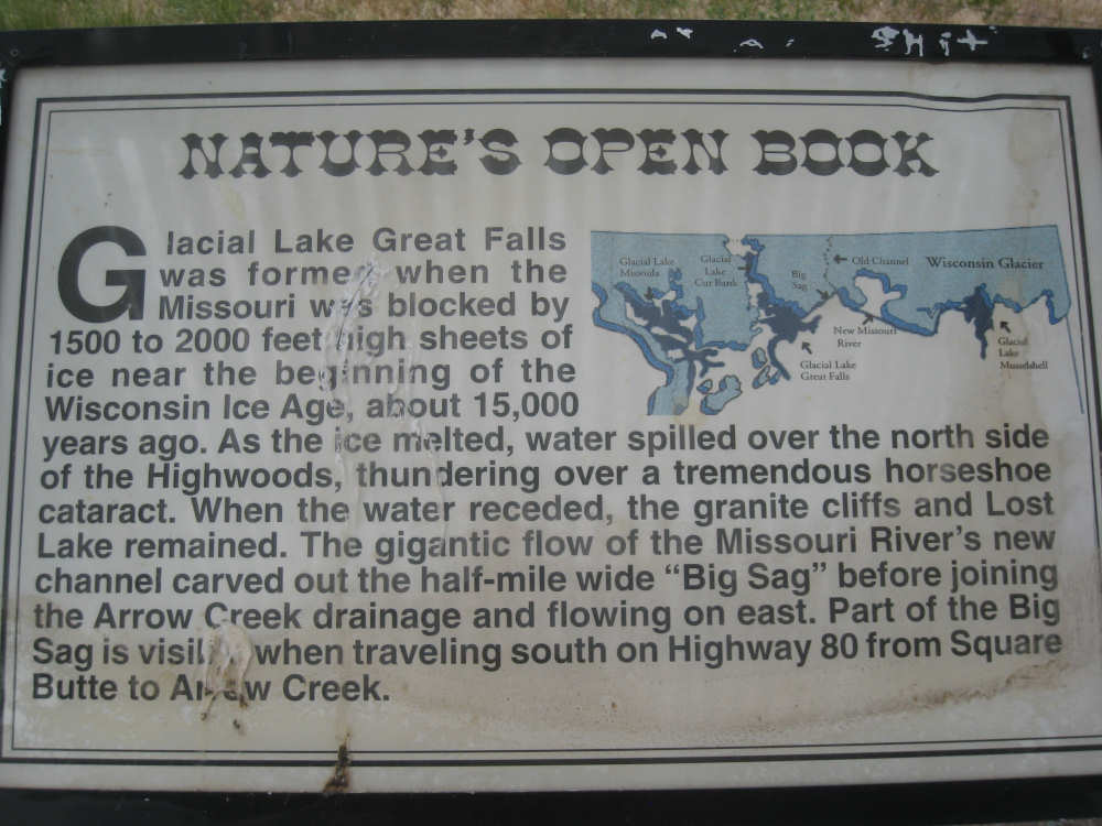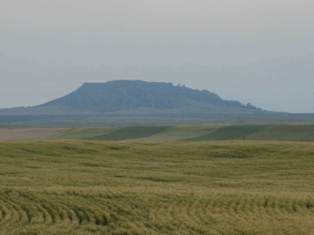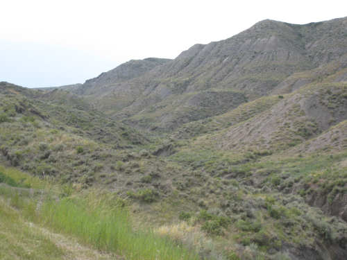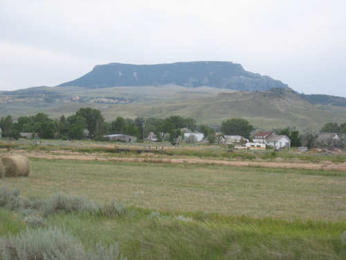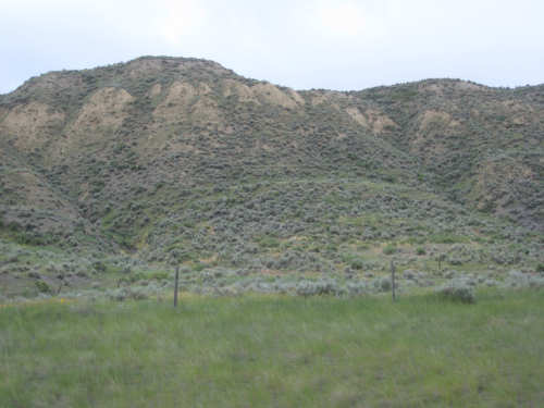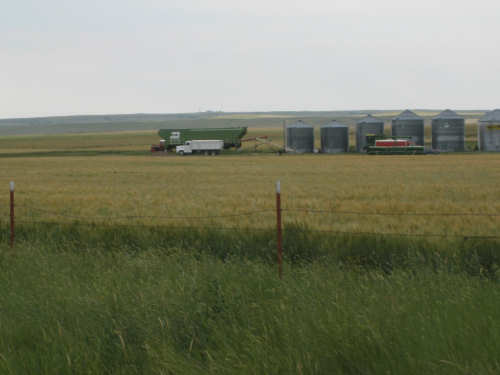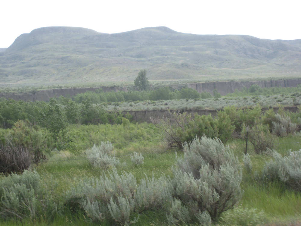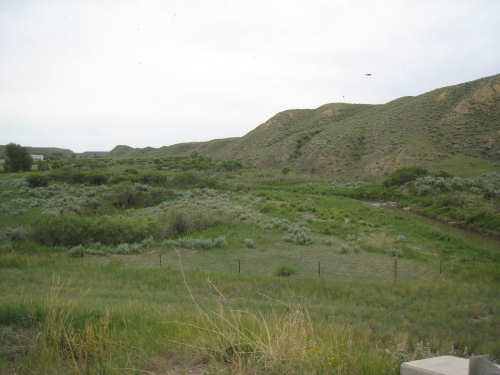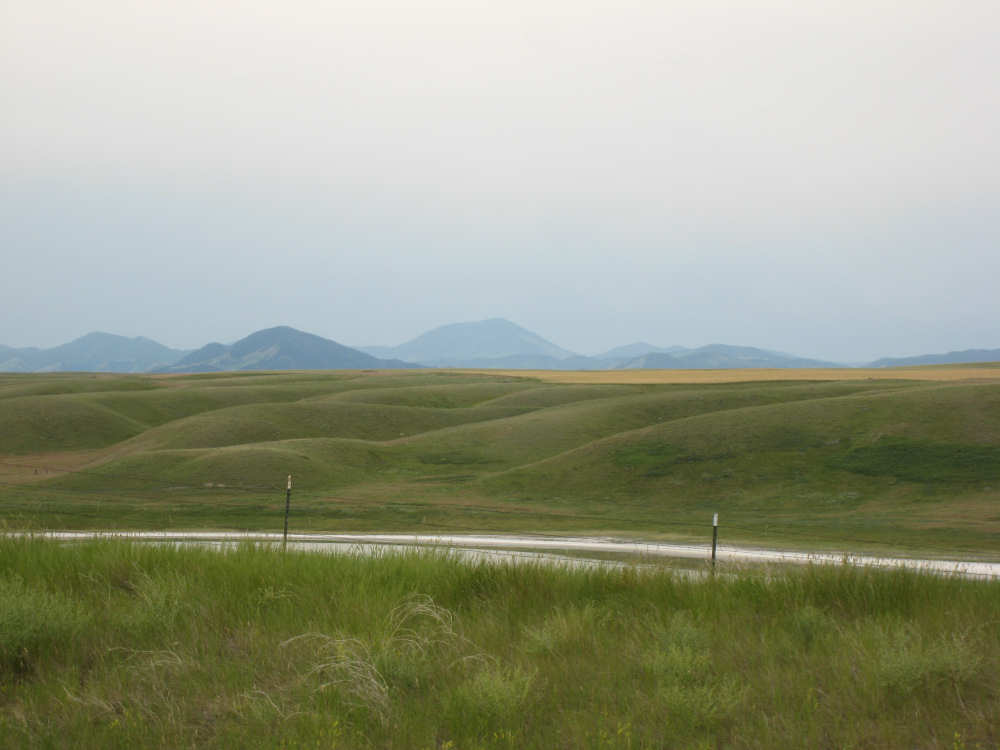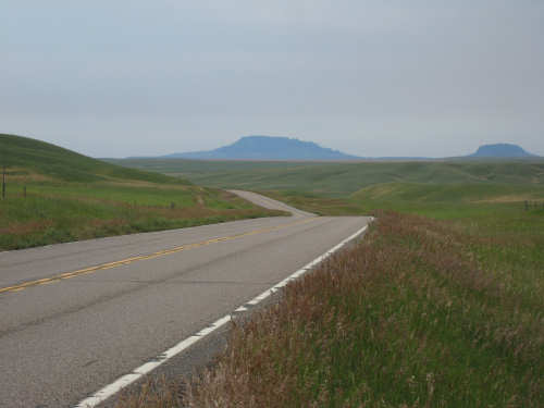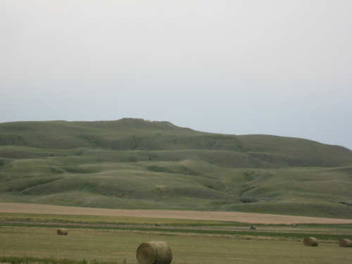 Once we got back up to the high land, we expected to see flat terrains and farm lands like we've seen the last 2 days. This area was quite different, though, it was more rolling and marked with many more ravines and gullies, more scrub brushes, and some interesting buttes and cliffs. We could still see the Highwood Mountains in the distance and had some plaques explaining their origins and the geology of the area. We saw a very large butte off in the distance before we saw the plaque describing it. This was Square Butte, which we passed today, as well as the small town with the same name. Our first and only significant town was Geraldine, about 26 miles from Fort Benton, where we stopped to eat lunch. The 2 land surveyors had passed us on the road early this morning; they had said they would be working in Geraldine and we had hoped to see them there at lunchtime, but we didn't see their truck anywhere. The restaurant/bar there turned out to be quite good and we had them pack us some sandwiches and goodies to eat on the road later. We went on, a little worried about how late we'd be getting to our motel, but the afternoon went a little better, with those few bouts of tailwind mixed in with the headwinds. The beautiful scenery helped take our mind off the hard work of pedaling.