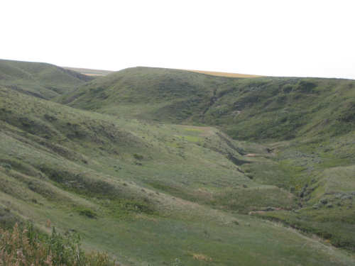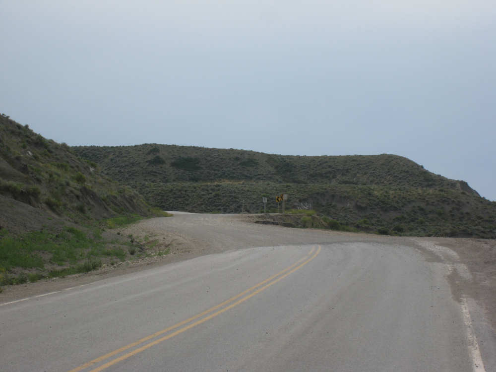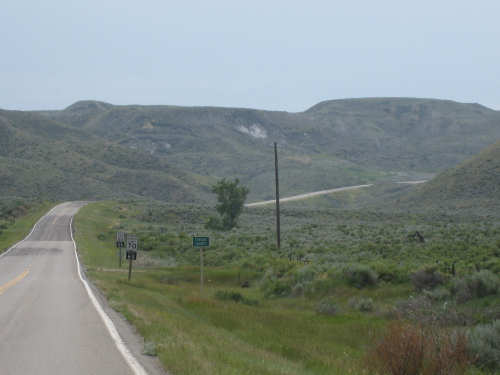 We finally approached Arrow Creek and the big hill of the day, catching a glimpse of our road winding up the hill (gulp!). First, we came to a viewing area which had a sign about the hill, which made it sound even worse than we had expected (thanks! just what we needed!). But off we went, gradually at first and then ever steeper, getting to 5-8% grades for most of the way. The wind was at least a bit calmer here, although we did have a few gusts now and then. Here again, though, the scenery was stupendous. The hills were fascinating and there were ditches cut deep into them at the edge of the road, where apparently a creek wound through. Some of the cliffs to our left had a strip of white stone in a layer near their tops. It may have been the same mineral that had left the dry lake beds that we had passed look white. At any rate, after after 2-1/2 miles of up, we got to the top! We celebrated by having the cinnamon rolls we bought in Geraldine and took pictures of where we had been. The top here was pretty flat and covered with wheat fields, much like our last 2 days had looked. We still had about 16 miles left to Denton, our stop for the night, but they went a lot more easily. We arrived in Denton at 5:30, earlier than we had expected. We had done almost 62 miles in almost 7 hours of bike time.