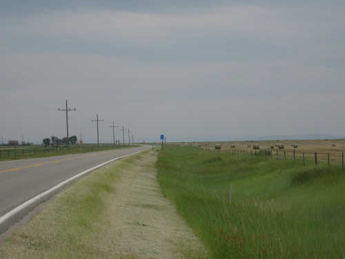 We found the motel in Denton, which was completely deserted at the time, and sat eating our sandwiches while we waited for the manager to arrive. We have to tell you the story of how we found this motel. It had been listed in our Adventure Cycling maps but the phone number it gave was disconnected. We tried getting the phone number online and through directory assistance, but the only number we found was the same discontinued one. We called the public library in Denton and the woman there said, yes, there was a motel there but she didn't have the number. She couldn't find the manager's number, although she said her name was Wanda, but she gave me the owner's number. I called and left a message but didn't get a call back. Things were looking bleak. When we were in Fort Benton, though, in our friendly restaurant (Bob's Riverfront Restaurant), the owner/cook said he used to live in Denton and his mother still did. So he called his mom and his mom called back a while later with the name and phone number of the motel manager. And the manager answered the phone! This was the third time we had gotten a motel room by happaening to ask the right person. We do have an internet connection here, but the connection is very slow and we're pretty tired. We have the pictures and the blog up but no captions yet, and we don't have the full-size pictures up yet either. How about we finish up tomorrow?
