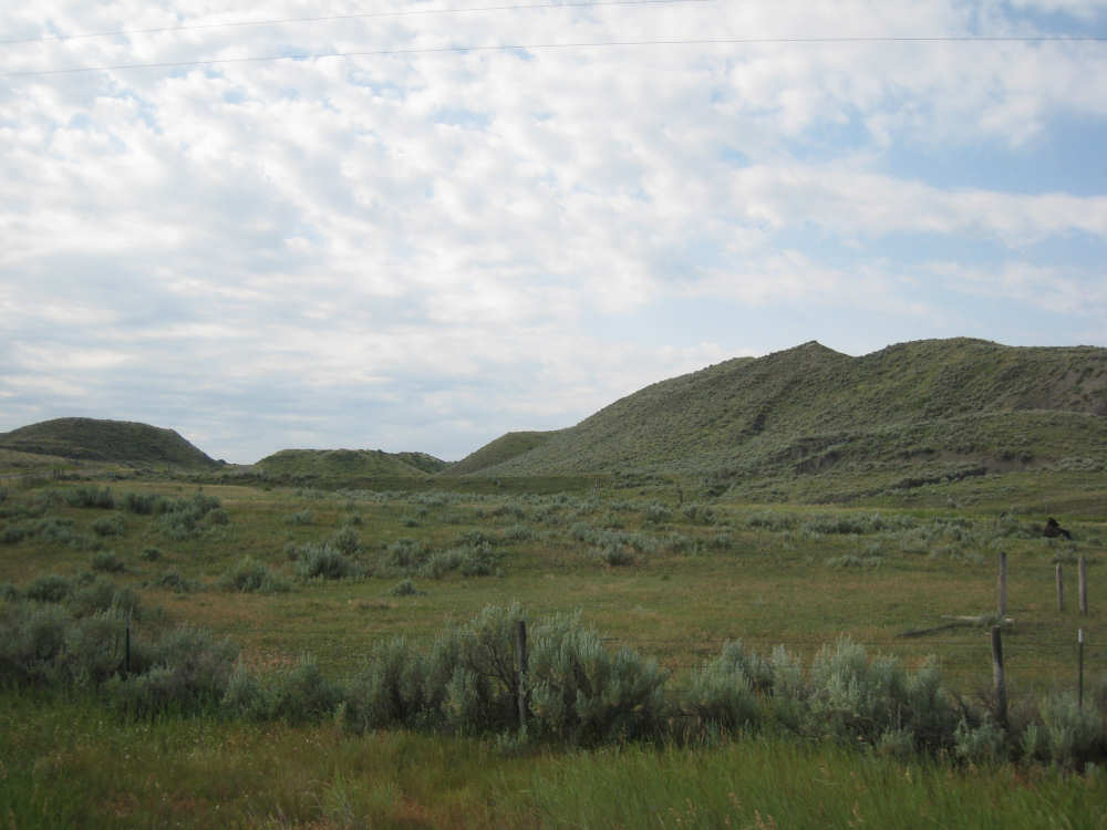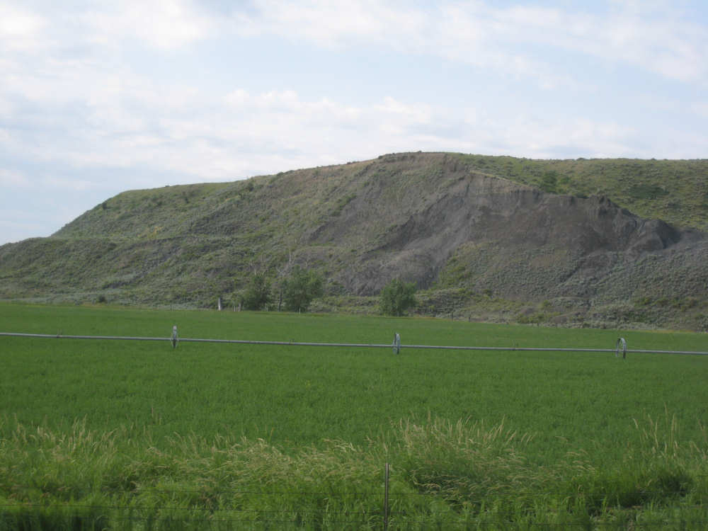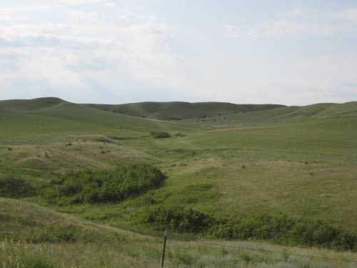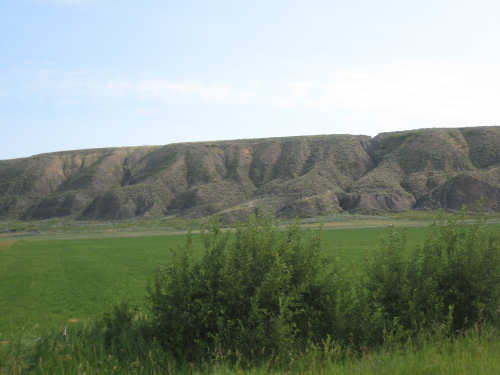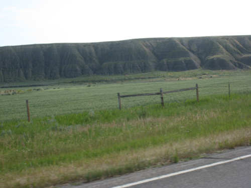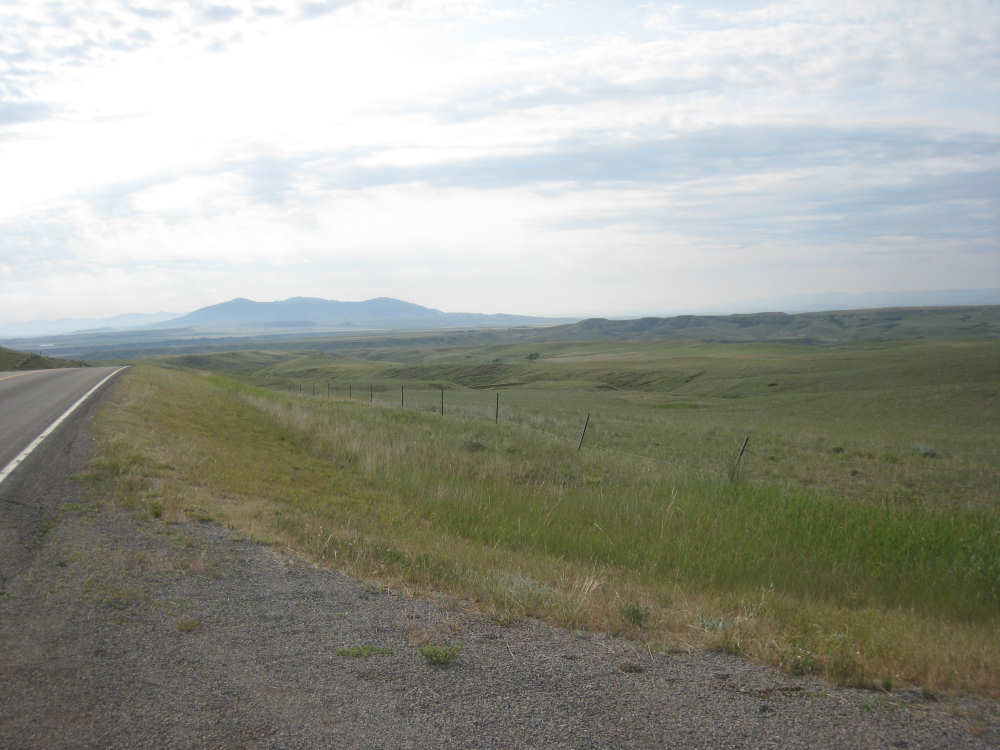 We left Denton around 7:45, still feeling a little tired out from yesterday and, I guess, the week in general. We were very much looking forward to our rest day tomorrow. Less than 40 miles today, but they weren't very easy. Lots of climb although in shorter, less steep spurts than yesterday's hills. The wind was calm today; it rained a little last night and today started out sunny and warm. It clouded over a little later and didn't get above 77 degrees as far as I know, but it felt warm going up some of the hills. The terrain was pretty flat to start with, too, with farm fields and pastures stretching out to the horizons to our right and left. Things started to look more interesting about 12 miles out when we started downhill into a valley where the Judith River flowed. The hills and ravines to either side of us were quite spectacular. I was trying to take pictures while Pat was barrelling down the hill (I can't use my brake while I'm taking pictures, so we were going faster than I would have allowed) - I'm surprised the pictures weren't all blurred. It was interesting that we could still see Square Butte behind us when we were up high enough. We had some new views of mountains today - the South Moccasin Mountains to our right, which we actually went around during the course of the day, and the Judith Mountains to our left. The Judith River, and I assume the Mountains as well, were named by William Clark after the woman he later married. We also crossed the Warm Springs Creek several times and saw a sign for a Gigantic Warm Springs a little before we turned onto 191 for Lewistown. Apparently, there is a warm spring here (68 degrees year-round) where people can swim.