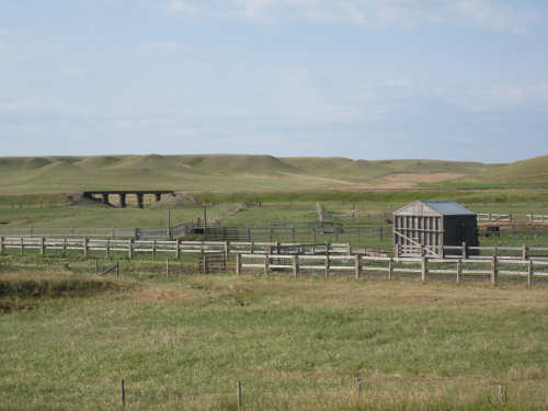 A ranch with a livestock pen and a railroad trestle in the backyard