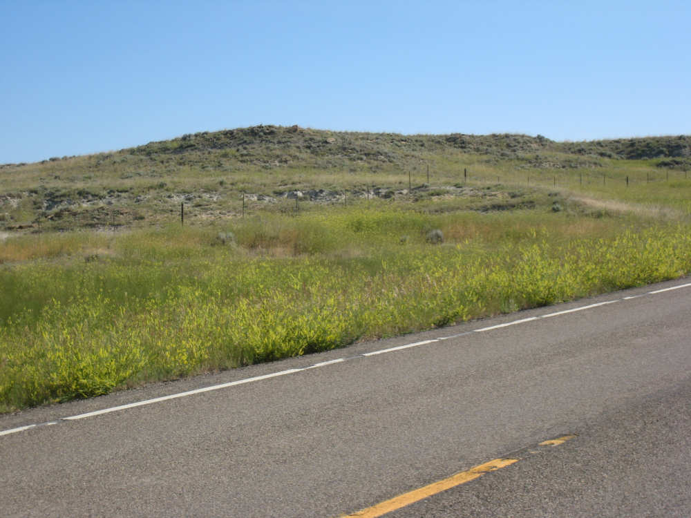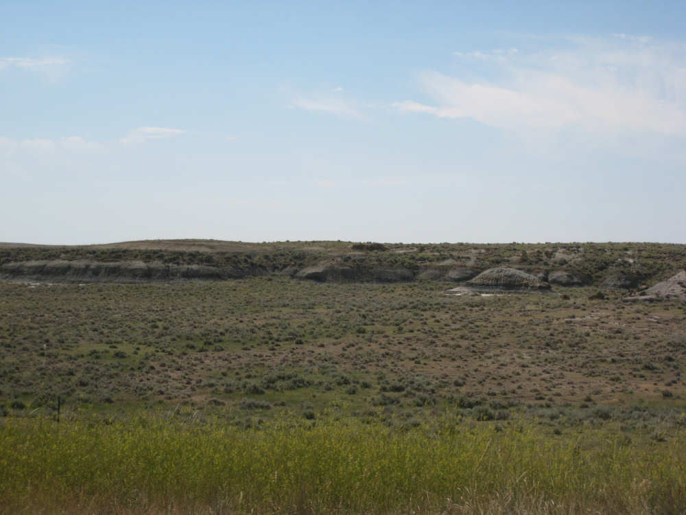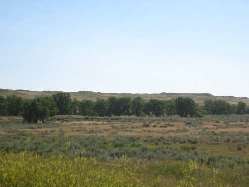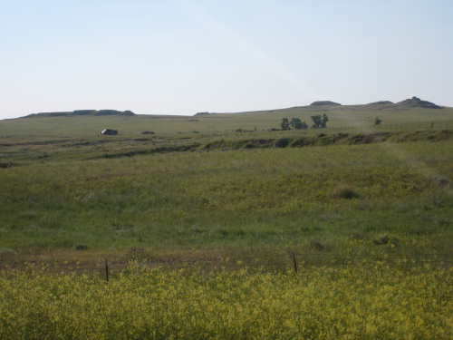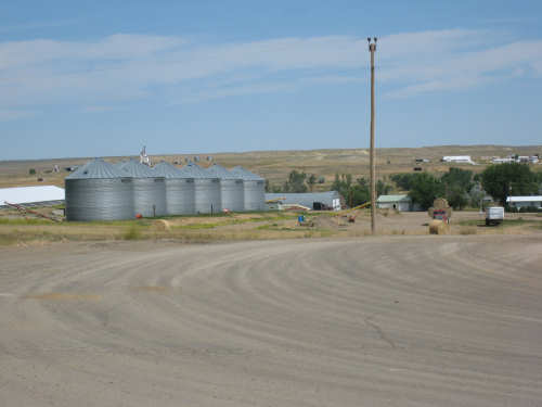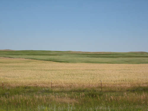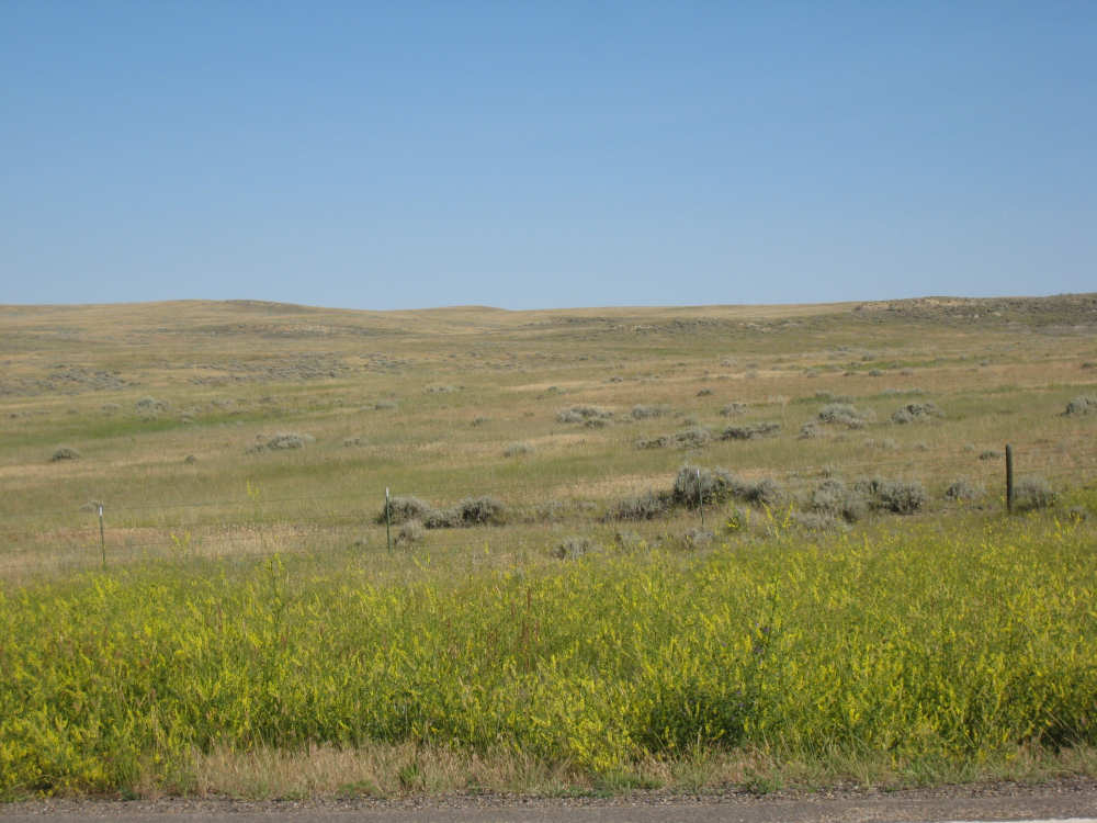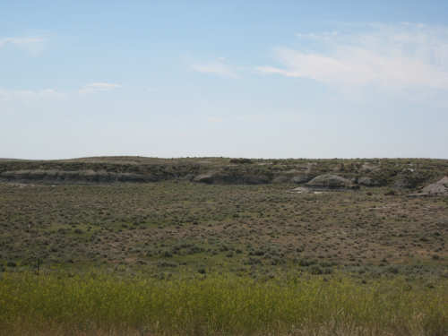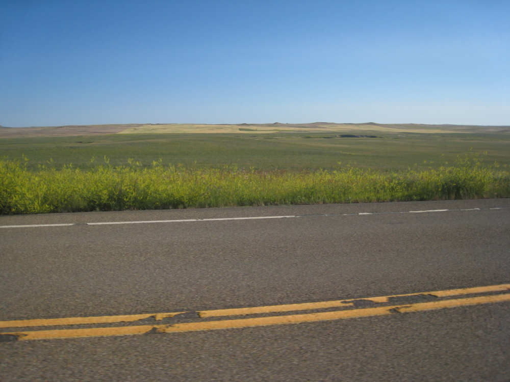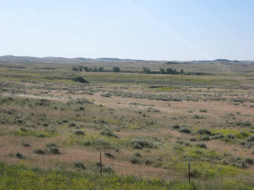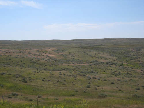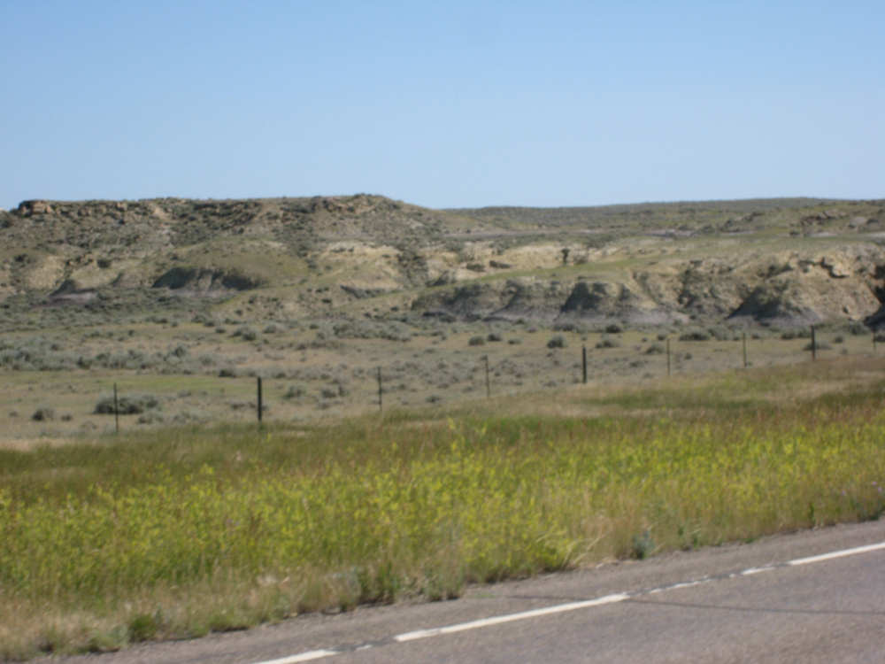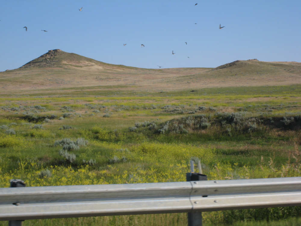 Sunday, July 20, 2008 Short day, but with lots of rolling hills, so we were glad we didn't try to go the extra 32 miles yesterday. It was also hotter today, got up to 86 degrees by noon, and a little buggy (I used the bug spray, Pat toughed it out). There wasn't much wind today, although it was very breezy until late last night; we're really hoping for a good tailwind tomorrow since we'll have our longest day and even more up and down than the last 2 days. There won't be any towns between here and Circle, tomorrow's spot, so we may stock up on some more food and water. Today was mostly lots of terrain and a little wildlife. We got a picture of some kind of deer or antelope, who conveniently stopped and stared at us long enough to get a picture taken before he loped away. We missed a fox or coyote who was bounding away over the shrubs - he seemed a little big for a fox but he was a bit too far away to be able to identify accurately. We also didn't get 3 large sheep who were climbing over a hillock. They weren't really wildlife I guess, but they looked like big horn sheep, without the horns - much larger and less woolly than most sheep we've seen in pastures. We saw our usual early morning flocks of swallows, diving madly, and managed to get a few of them in a shot. I didn't get the scores of little butterflies flitting around the wildflowers that lined the sides of the road. The terrain pictures may seem repetitive but that's really a function of trying to capture a wide vista with a little camera. The land changes constantly as we move along it - something that looks fairly flat at first will turn out to have interesting gullies in it as we get closer or see it from a different angle. Big and little hills will pop up suddenly in an otherwise flat landscape; sometimes the land seems to splay out like a big skirt from a little peak on a ridge. The texture will change suddenly, too; while today was mostly pastures with short-cropped grass and scrub brush, mixed with a few crop fields, we had some areas with rough rocks, some where the earth looked almost like cement, and others where pond edges were white from the alkaline soil. We went through a town called Edwards today, according to our map, but didn't notice it at all. Luckily, Jordan was quite noticeable, first from its grain silos and then from the cluster of houses. Our motel was conveniently right on the road (still Hwy. 200) and we pulled in at 11:15, having left Sand Springs at 7:45. We covered almost 32-1/3 miles in a little over 3 hours of bike time, a pretty good average considering the hills. We have pretty good connection here so Pat doesn't have to go out scrounging for it. We hope to use the extra time today to get a little ahead of things for our next rest day, or maybe just to rest. |