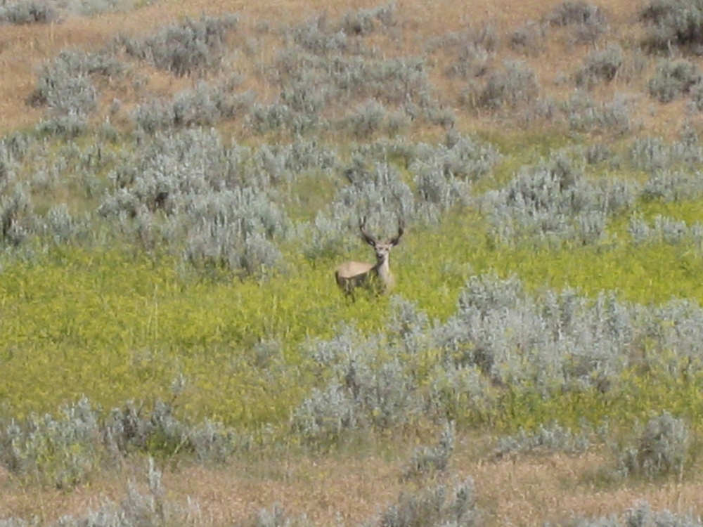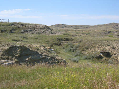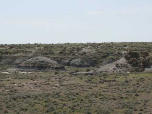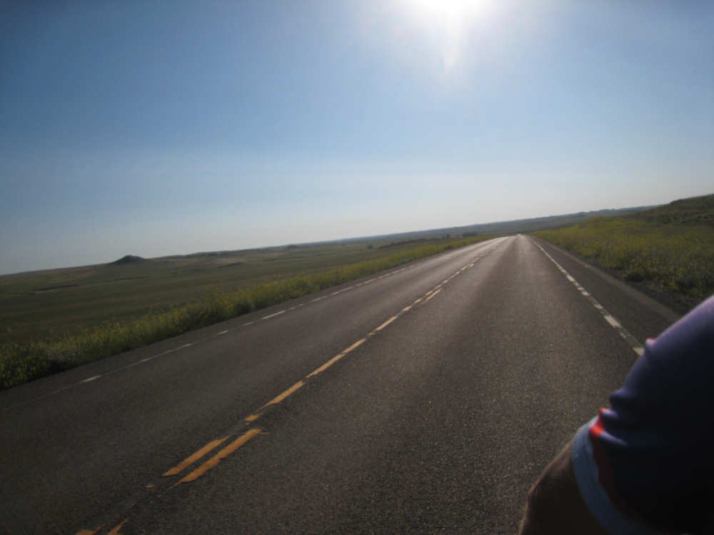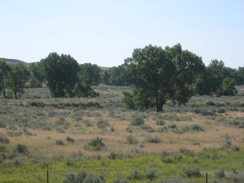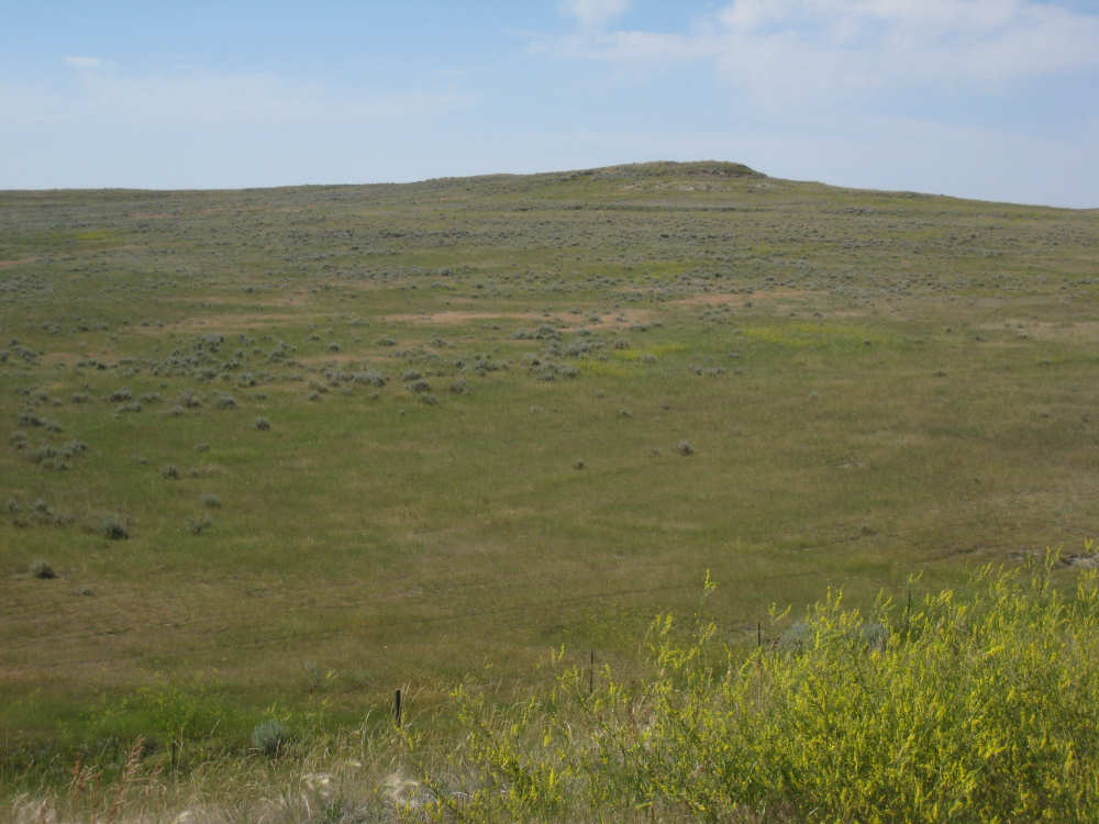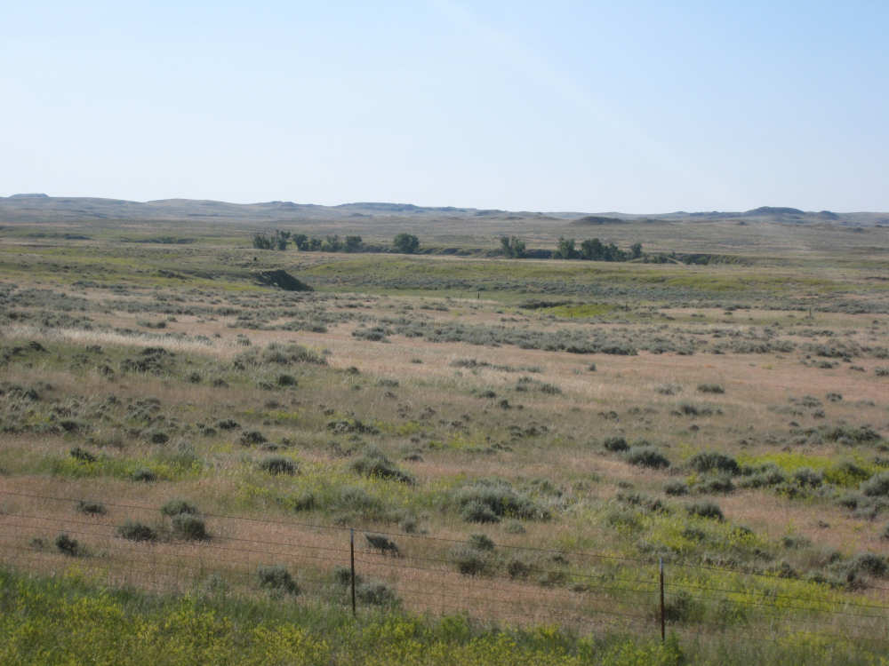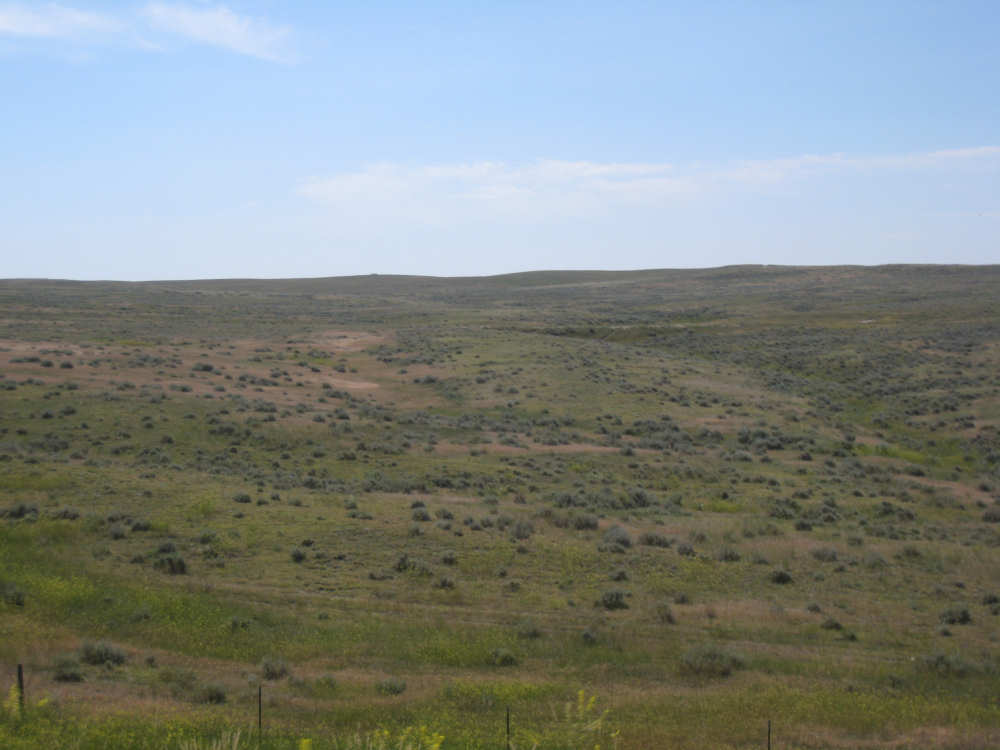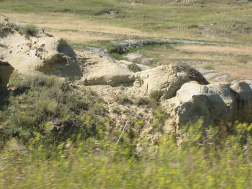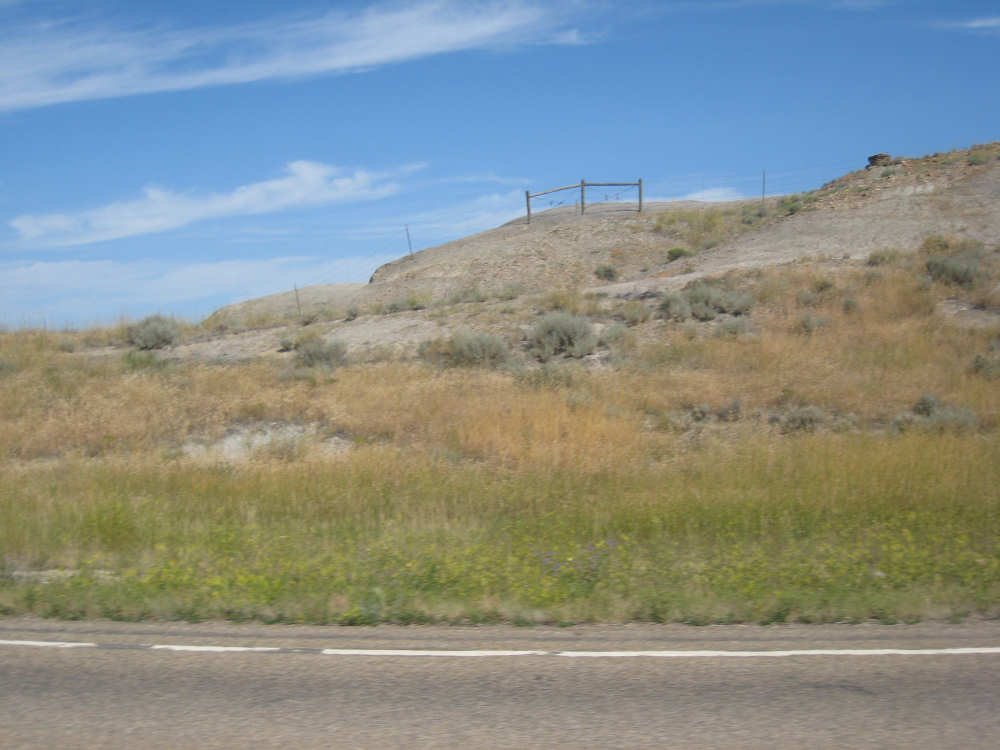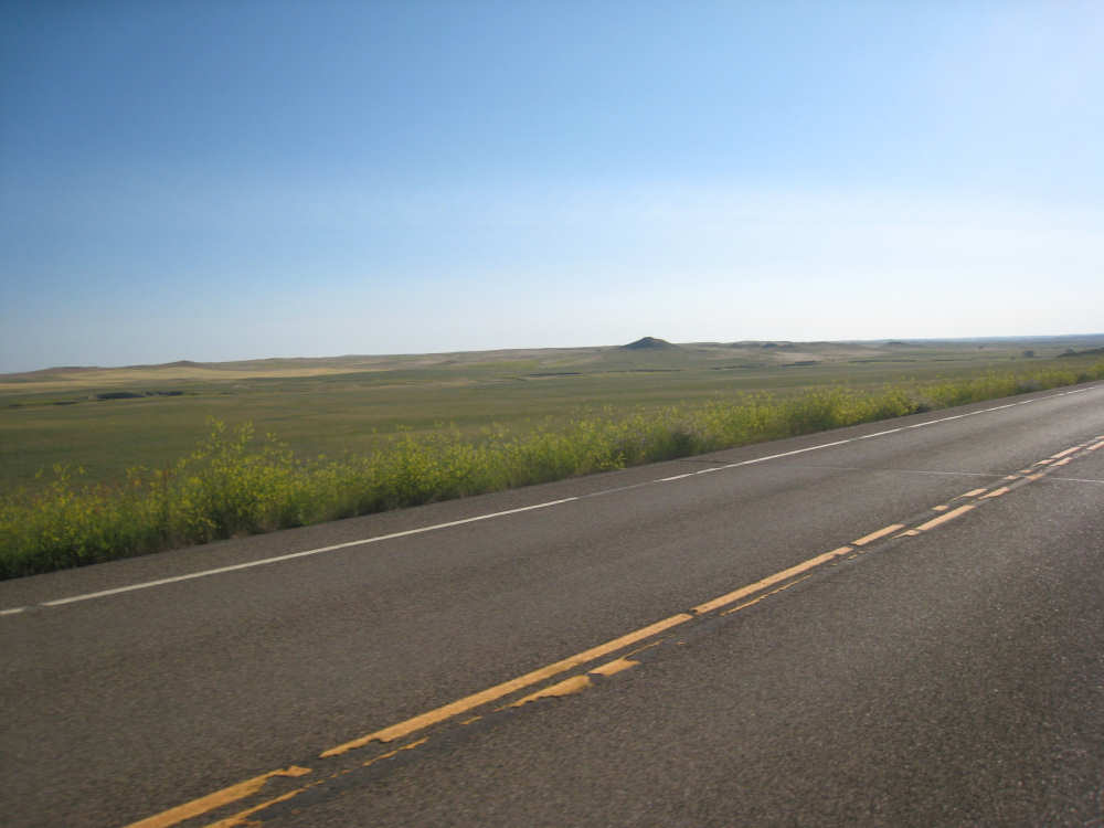 Sunday, July 20, 2008 Short day, but with lots of rolling hills, so we were glad we didn't try to go the extra 32 miles yesterday. It was also hotter today, got up to 86 degrees by noon, and a little buggy (I used the bug spray, Pat toughed it out). There wasn't much wind today, although it was very breezy until late last night; we're really hoping for a good tailwind tomorrow since we'll have our longest day and even more up and down than the last 2 days. There won't be any towns between here and Circle, tomorrow's spot, so we may stock up on some more food and water. Today was mostly lots of terrain and a little wildlife. We got a picture of some kind of deer or antelope, who conveniently stopped and stared at us long enough to get a picture taken before he loped away. We missed a fox or coyote who was bounding away over the shrubs - he seemed a little big for a fox but he was a bit too far away to be able to identify accurately. We also didn't get 3 large sheep who were climbing over a hillock. They weren't really wildlife I guess, but they looked like big horn sheep, without the horns - much larger and less woolly than most sheep we've seen in pastures. We saw our usual early morning flocks of swallows, diving madly, and managed to get a few of them in a shot. I didn't get the scores of little butterflies flitting around the wildflowers that lined the sides of the road. The terrain pictures may seem repetitive but that's really a function of trying to capture a wide vista with a little camera. The land changes constantly as we move along it - something that looks fairly flat at first will turn out to have interesting gullies in it as we get closer or see it from a different angle. Big and little hills will pop up suddenly in an otherwise flat landscape; sometimes the land seems to splay out like a big skirt from a little peak on a ridge. The texture will change suddenly, too; while today was mostly pastures with short-cropped grass and scrub brush, mixed with a few crop fields, we had some areas with rough rocks, some where the earth looked almost like cement, and others where pond edges were white from the alkaline soil. We went through a town called Edwards today, according to our map, but didn't notice it at all. Luckily, Jordan was quite noticeable, first from its grain silos and then from the cluster of houses. Our motel was conveniently right on the road (still Hwy. 200) and we pulled in at 11:15, having left Sand Springs at 7:45. We covered almost 32-1/3 miles in a little over 3 hours of bike time, a pretty good average considering the hills. We have pretty good connection here so Pat doesn't have to go out scrounging for it. We hope to use the extra time today to get a little ahead of things for our next rest day, or maybe just to rest. |