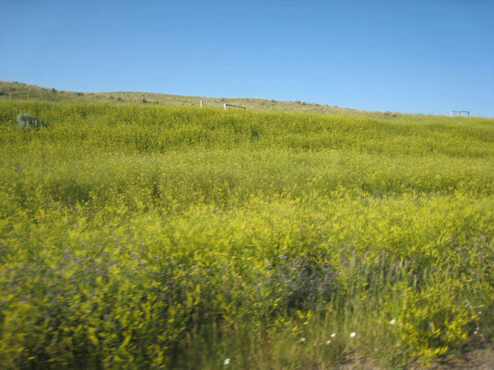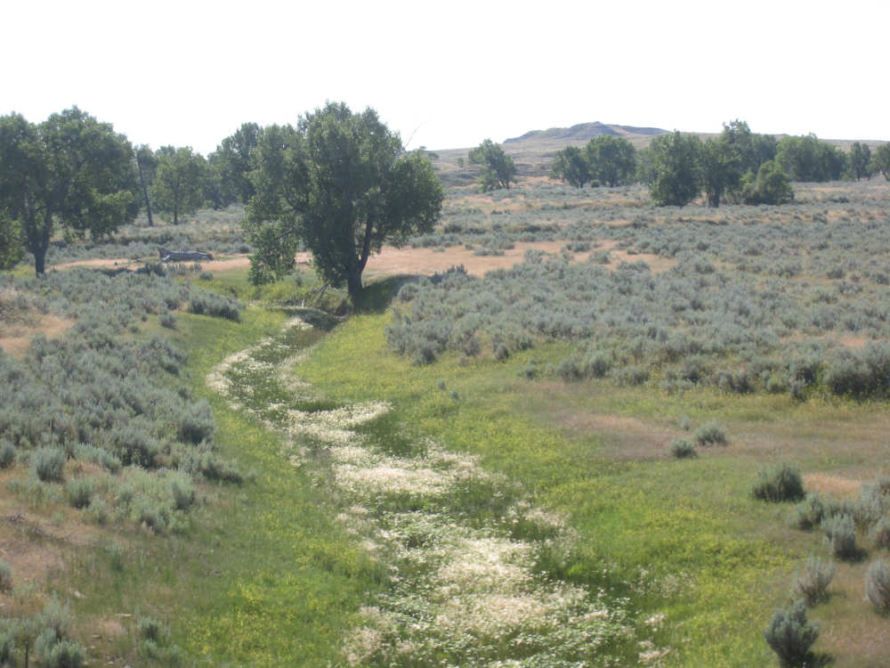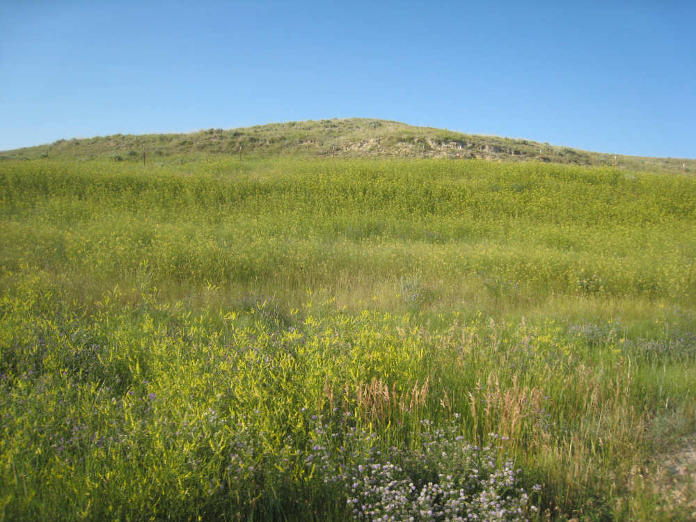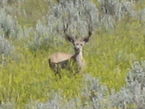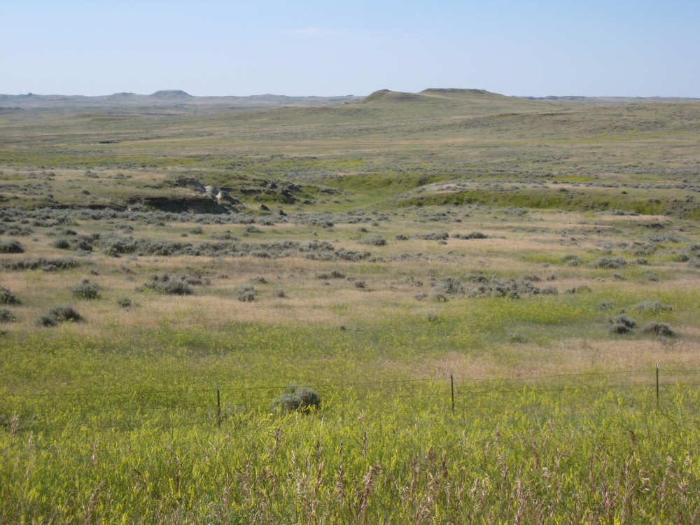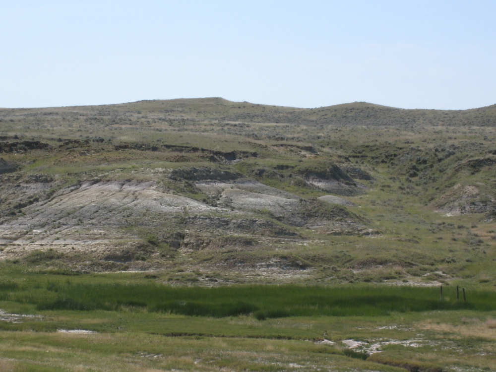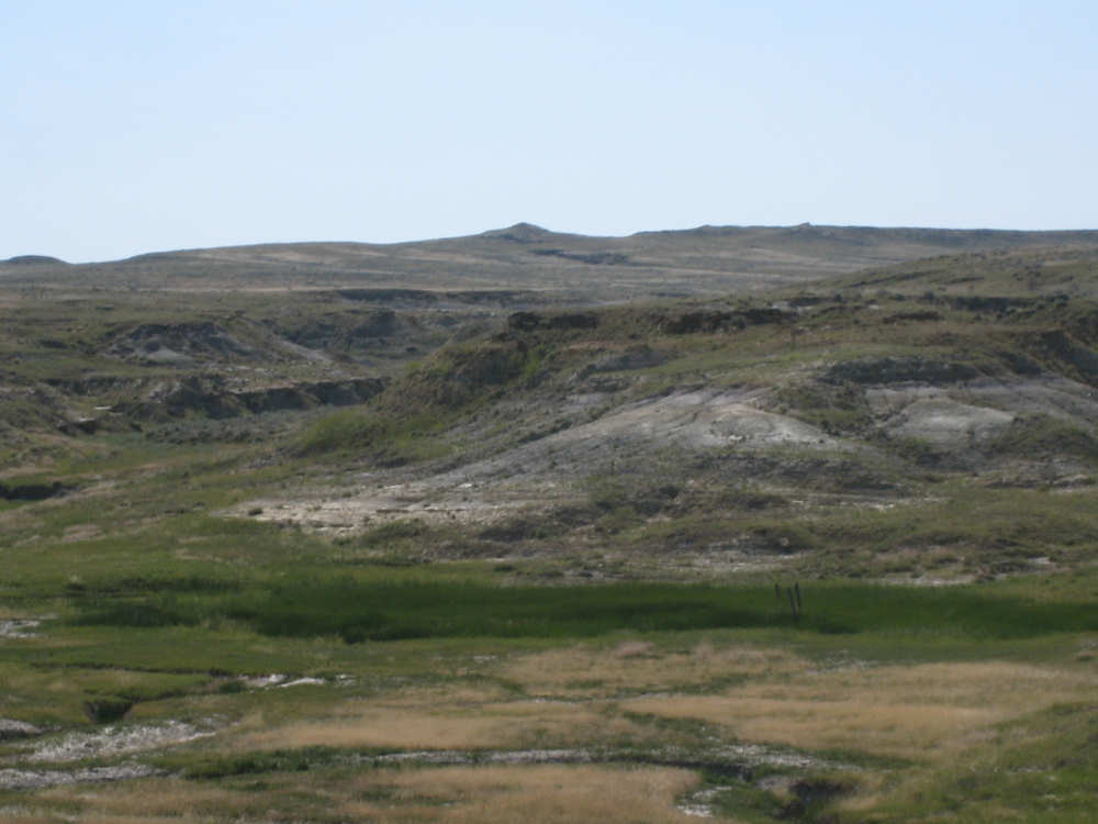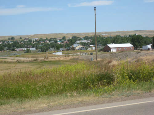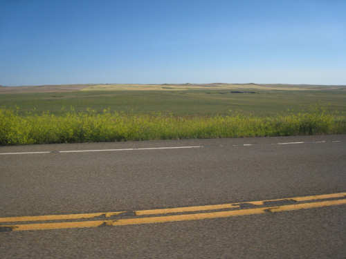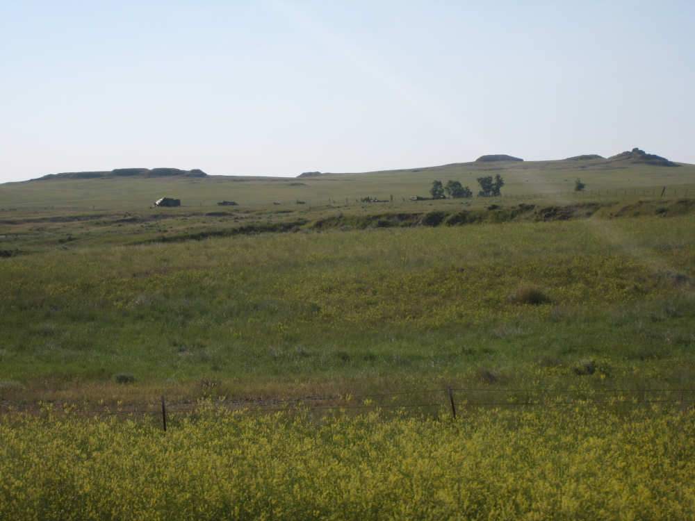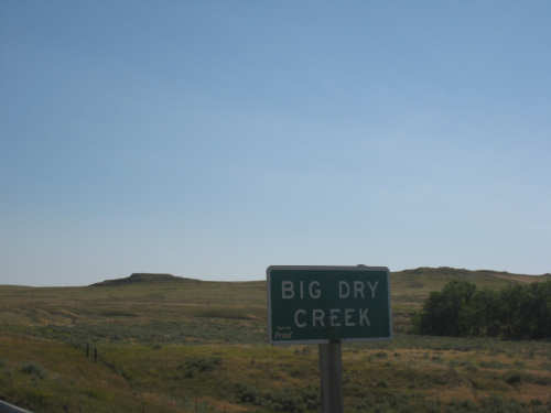 Sunday, July 20, 2008 Short day, but with lots of rolling hills, so we were glad we didn't try to go the extra 32 miles yesterday. It was also hotter today, got up to 86 degrees by noon, and a little buggy (I used the bug spray, Pat toughed it out). There wasn't much wind today, although it was very breezy until late last night; we're really hoping for a good tailwind tomorrow since we'll have our longest day and even more up and down than the last 2 days. There won't be any towns between here and Circle, tomorrow's spot, so we may stock up on some more food and water. Today was mostly lots of terrain and a little wildlife. We got a picture of some kind of deer or antelope, who conveniently stopped and stared at us long enough to get a picture taken before he loped away. We missed a fox or coyote who was bounding away over the shrubs - he seemed a little big for a fox but he was a bit too far away to be able to identify accurately. We also didn't get 3 large sheep who were climbing over a hillock. They weren't really wildlife I guess, but they looked like big horn sheep, without the horns - much larger and less woolly than most sheep we've seen in pastures. We saw our usual early morning flocks of swallows, diving madly, and managed to get a few of them in a shot. I didn't get the scores of little butterflies flitting around the wildflowers that lined the sides of the road. The terrain pictures may seem repetitive but that's really a function of trying to capture a wide vista with a little camera. The land changes constantly as we move along it - something that looks fairly flat at first will turn out to have interesting gullies in it as we get closer or see it from a different angle. Big and little hills will pop up suddenly in an otherwise flat landscape; sometimes the land seems to splay out like a big skirt from a little peak on a ridge. The texture will change suddenly, too; while today was mostly pastures with short-cropped grass and scrub brush, mixed with a few crop fields, we had some areas with rough rocks, some where the earth looked almost like cement, and others where pond edges were white from the alkaline soil. We went through a town called Edwards today, according to our map, but didn't notice it at all. Luckily, Jordan was quite noticeable, first from its grain silos and then from the cluster of houses. Our motel was conveniently right on the road (still Hwy. 200) and we pulled in at 11:15, having left Sand Springs at 7:45. We covered almost 32-1/3 miles in a little over 3 hours of bike time, a pretty good average considering the hills. We have pretty good connection here so Pat doesn't have to go out scrounging for it. We hope to use the extra time today to get a little ahead of things for our next rest day, or maybe just to rest. |