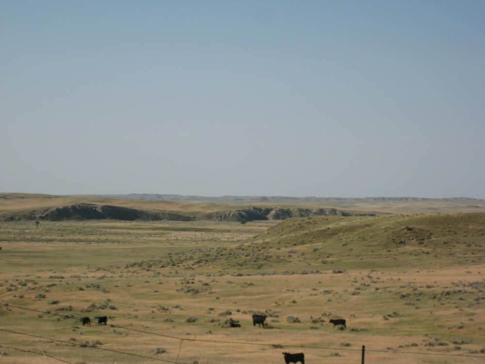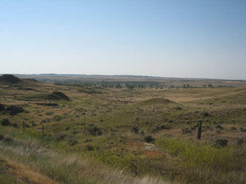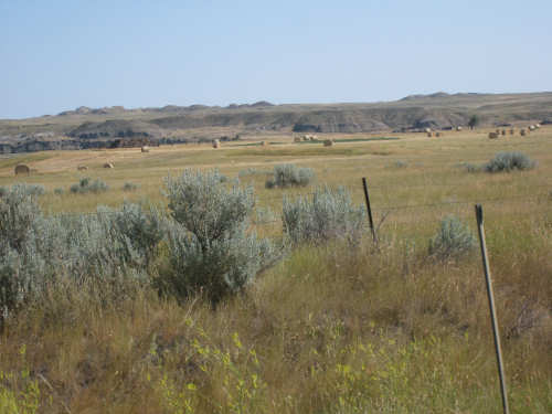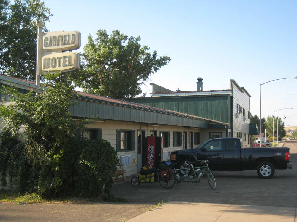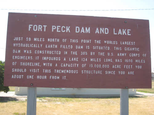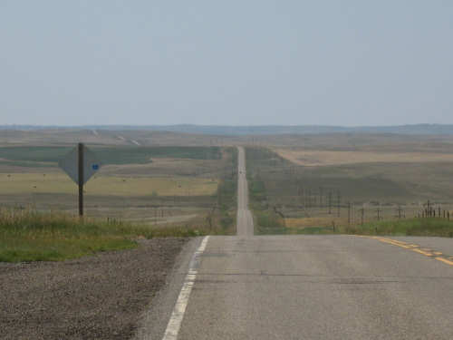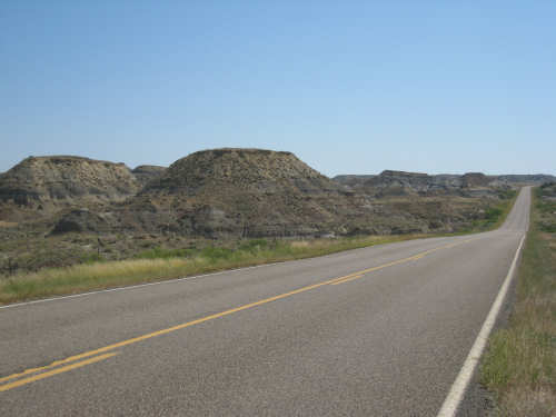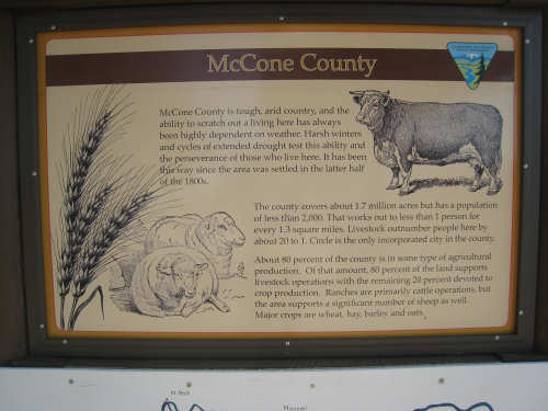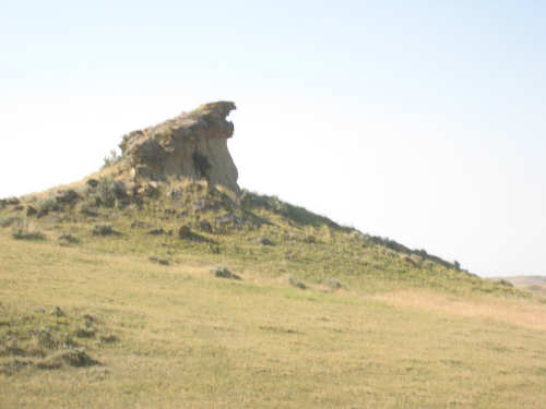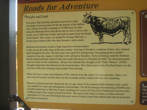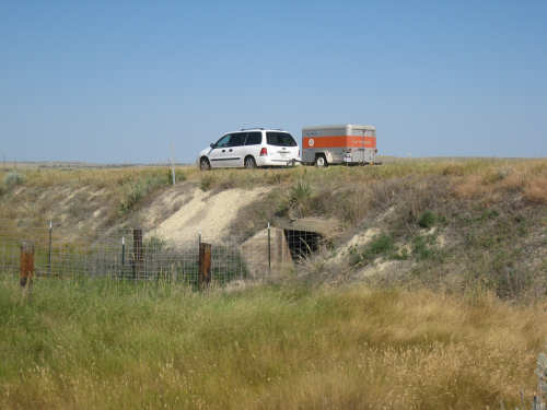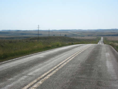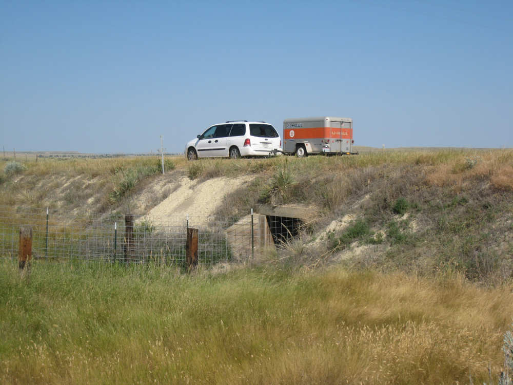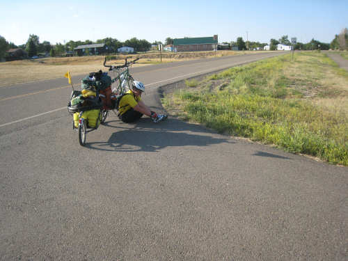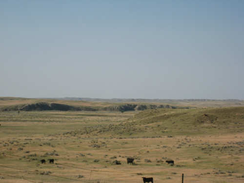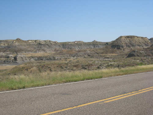 Monday, July 21, 2008 Long, hard day. We went 68-1/2 miles today on a very hilly road, one up and then down after another. It was also a very hot day and we had a fair bit of head wind. Later in the day it turned into a side wind, which didn't help much but at least didn't slow us down as much, and it also helped to cool us off some. One of the main problems, too, was that there were no towns along Hwy. 200 between Jordan and Circle, so we didn't have a nice air-conditioned restaurant to stop and eat lunch or get a cold soda. There were two places that helped in that regard - one was a rest area at the corner of 200 and 24, where we could have turned off to visit the famous Fort Peck, "only 59 miles away". Circle at this point was "only" 31 miles away which is why we chose to go there instead. At any rate, there was some cold water in the water fountains at the rest area, so we refilled our camelbaks there - after 37 miles, they were running a little low (we had more water in bottles on the bike, but it was all hot by then). The other thing that saved us was finding a bar/supper club at the side of the road near the town of Brockway, about 13 miles from Circle. The town itself was too far off the road for us to want to go to, but this bar was right there. The woman who worked there was very nice and chatted with us as Pat drank 2 Pepsis in about 5 seconds flat; I had one in about the same time. She also filled up our camelbaks with ice - by now we had to top them up with the hot bottles of water and getting ice and cold water in them was very much appreciated. She also called our motel to let them know we'd probably be later than 6 pm (we arrived at 6:30). The road also leveled out after Brockway, so we managed the last 13 miles a lot better than we had been doing. We were quite relieved to get into town and find our motel. We ended the day with 7-1/2 bike hours and almost 11 hours of road time (we had to stop and rest a lot towards the end). Our big excitement of the day was seeing a couple of cowboys on horses, rounding up some cattle. We first saw some cattle moving around in a field, then saw that a guy on a horse was behind them, urging them along. He galloped around to the front of the herd next and got them to move back to join the others. The cattle were moaning and groaning about being shoved around, but they moved where they were supposed to. Another cowboy on a horse was coming up from the other side of the road to join in the fun, too. We also got a picture of a cattle tunnel, which we have seen lots of, but never got a picture. Cattle use them to cross underneath the road. And finally, we got some good pictures of the windmill columns that we've seen carted around on wide-load trucks. The terrain today was unusual, too. It started out much the same as usual - crops and pastures with some creeks running through them and some fairly shallow canyons from time to time. At one stretch, however, the canyons and the peaks were quite impressive. The peaks were much taller and the canyons much deeper, and the strata of the rocks were quite different - some dark and cement-like, some pale with red and pale yellow streaks. We had the feeling that Montana was giving us a sneak preview of the North Dakota badlands. After a bit, the land got more level and the crops and pastures reappeared again. |