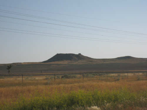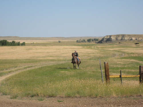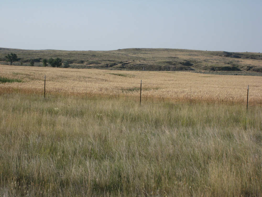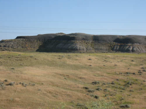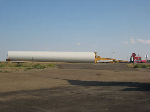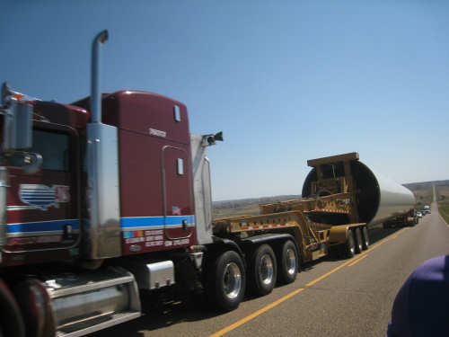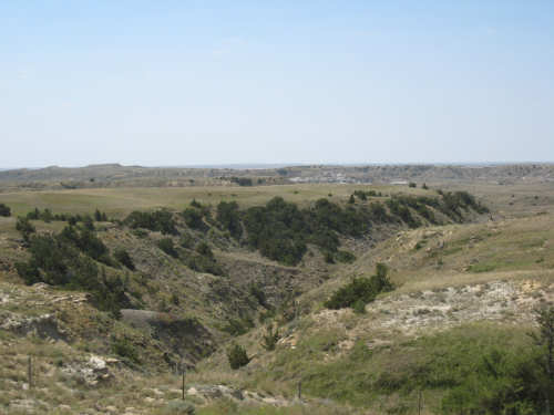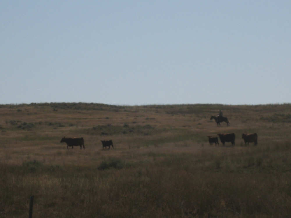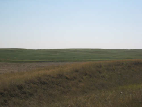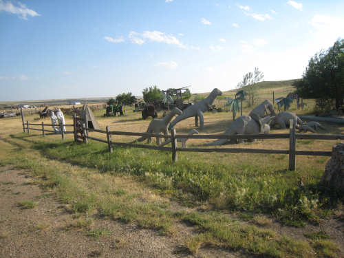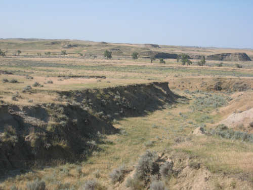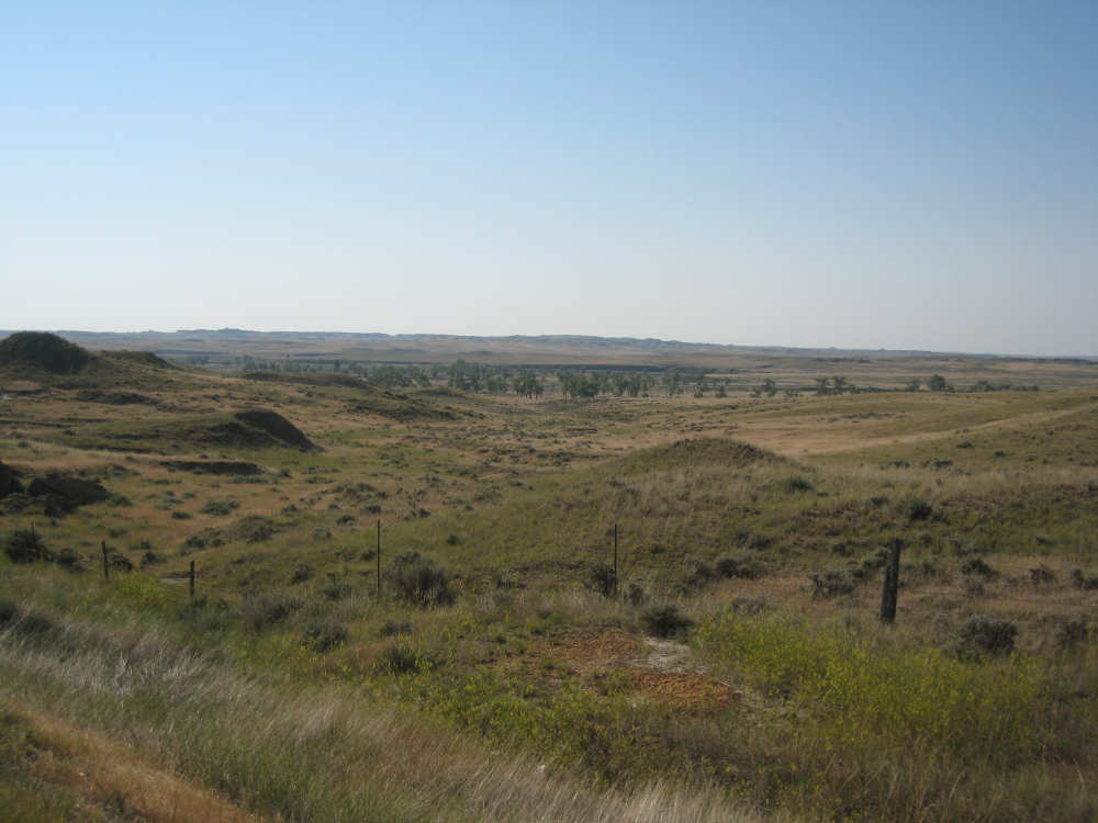 Monday, July 21, 2008 Long, hard day. We went 68-1/2 miles today on a very hilly road, one up and then down after another. It was also a very hot day and we had a fair bit of head wind. Later in the day it turned into a side wind, which didn't help much but at least didn't slow us down as much, and it also helped to cool us off some. One of the main problems, too, was that there were no towns along Hwy. 200 between Jordan and Circle, so we didn't have a nice air-conditioned restaurant to stop and eat lunch or get a cold soda. There were two places that helped in that regard - one was a rest area at the corner of 200 and 24, where we could have turned off to visit the famous Fort Peck, "only 59 miles away". Circle at this point was "only" 31 miles away which is why we chose to go there instead. At any rate, there was some cold water in the water fountains at the rest area, so we refilled our camelbaks there - after 37 miles, they were running a little low (we had more water in bottles on the bike, but it was all hot by then). The other thing that saved us was finding a bar/supper club at the side of the road near the town of Brockway, about 13 miles from Circle. The town itself was too far off the road for us to want to go to, but this bar was right there. The woman who worked there was very nice and chatted with us as Pat drank 2 Pepsis in about 5 seconds flat; I had one in about the same time. She also filled up our camelbaks with ice - by now we had to top them up with the hot bottles of water and getting ice and cold water in them was very much appreciated. She also called our motel to let them know we'd probably be later than 6 pm (we arrived at 6:30). The road also leveled out after Brockway, so we managed the last 13 miles a lot better than we had been doing. We were quite relieved to get into town and find our motel. We ended the day with 7-1/2 bike hours and almost 11 hours of road time (we had to stop and rest a lot towards the end). Our big excitement of the day was seeing a couple of cowboys on horses, rounding up some cattle. We first saw some cattle moving around in a field, then saw that a guy on a horse was behind them, urging them along. He galloped around to the front of the herd next and got them to move back to join the others. The cattle were moaning and groaning about being shoved around, but they moved where they were supposed to. Another cowboy on a horse was coming up from the other side of the road to join in the fun, too. We also got a picture of a cattle tunnel, which we have seen lots of, but never got a picture. Cattle use them to cross underneath the road. And finally, we got some good pictures of the windmill columns that we've seen carted around on wide-load trucks. The terrain today was unusual, too. It started out much the same as usual - crops and pastures with some creeks running through them and some fairly shallow canyons from time to time. At one stretch, however, the canyons and the peaks were quite impressive. The peaks were much taller and the canyons much deeper, and the strata of the rocks were quite different - some dark and cement-like, some pale with red and pale yellow streaks. We had the feeling that Montana was giving us a sneak preview of the North Dakota badlands. After a bit, the land got more level and the crops and pastures reappeared again. |