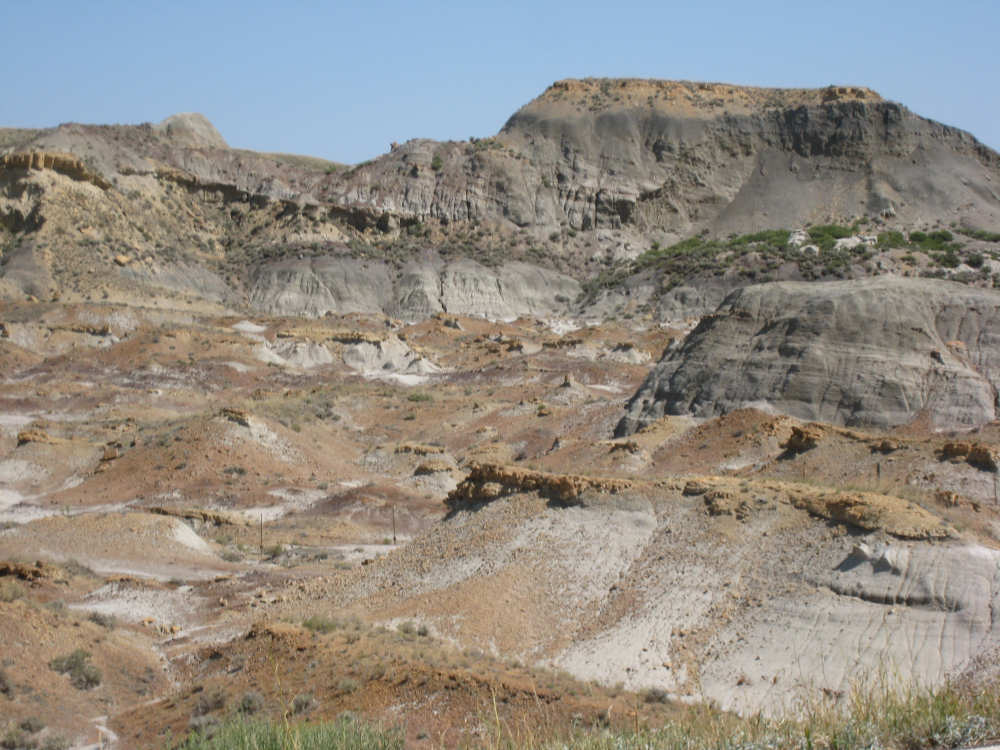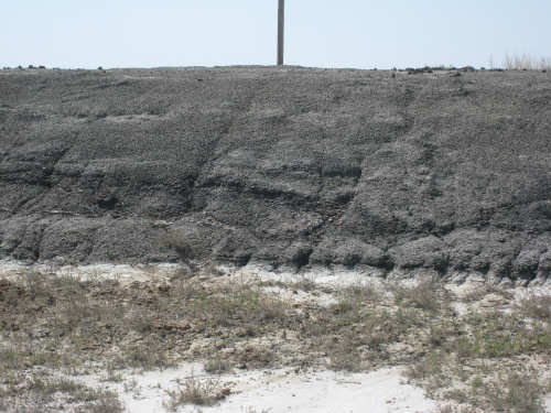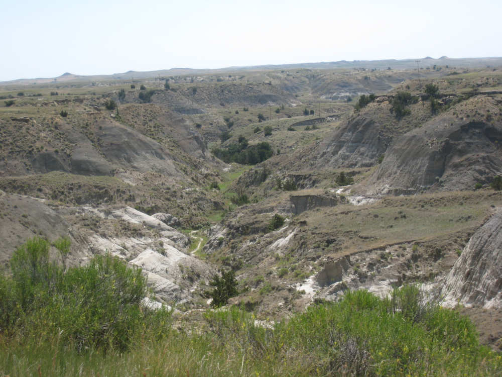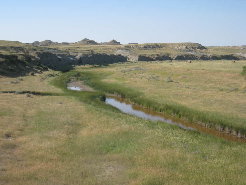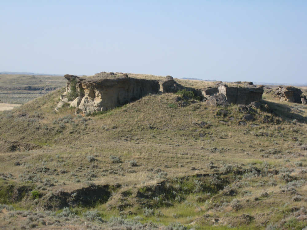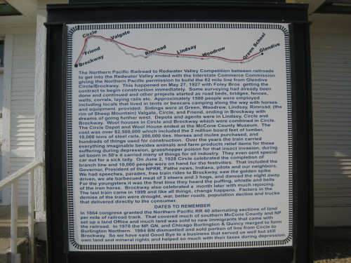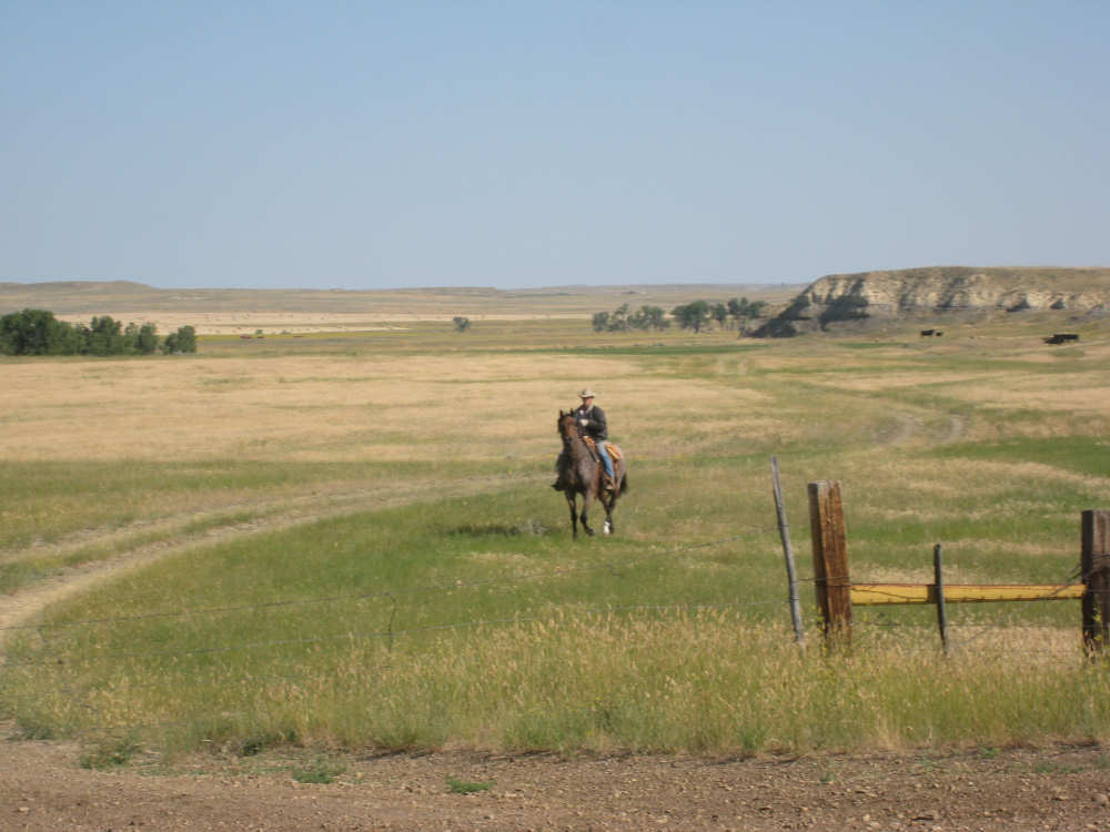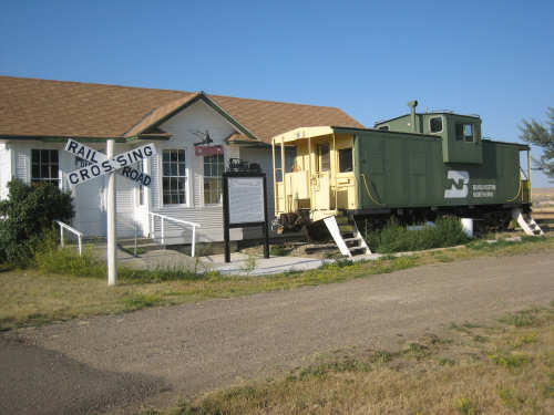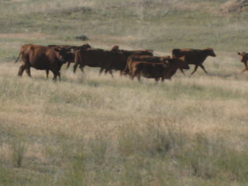 Monday, July 21, 2008 Long, hard day. We went 68-1/2 miles today on a very hilly road, one up and then down after another. It was also a very hot day and we had a fair bit of head wind. Later in the day it turned into a side wind, which didn't help much but at least didn't slow us down as much, and it also helped to cool us off some. One of the main problems, too, was that there were no towns along Hwy. 200 between Jordan and Circle, so we didn't have a nice air-conditioned restaurant to stop and eat lunch or get a cold soda. There were two places that helped in that regard - one was a rest area at the corner of 200 and 24, where we could have turned off to visit the famous Fort Peck, "only 59 miles away". Circle at this point was "only" 31 miles away which is why we chose to go there instead. At any rate, there was some cold water in the water fountains at the rest area, so we refilled our camelbaks there - after 37 miles, they were running a little low (we had more water in bottles on the bike, but it was all hot by then). The other thing that saved us was finding a bar/supper club at the side of the road near the town of Brockway, about 13 miles from Circle. The town itself was too far off the road for us to want to go to, but this bar was right there. The woman who worked there was very nice and chatted with us as Pat drank 2 Pepsis in about 5 seconds flat; I had one in about the same time. She also filled up our camelbaks with ice - by now we had to top them up with the hot bottles of water and getting ice and cold water in them was very much appreciated. She also called our motel to let them know we'd probably be later than 6 pm (we arrived at 6:30). The road also leveled out after Brockway, so we managed the last 13 miles a lot better than we had been doing. We were quite relieved to get into town and find our motel. We ended the day with 7-1/2 bike hours and almost 11 hours of road time (we had to stop and rest a lot towards the end). Our big excitement of the day was seeing a couple of cowboys on horses, rounding up some cattle. We first saw some cattle moving around in a field, then saw that a guy on a horse was behind them, urging them along. He galloped around to the front of the herd next and got them to move back to join the others. The cattle were moaning and groaning about being shoved around, but they moved where they were supposed to. Another cowboy on a horse was coming up from the other side of the road to join in the fun, too. We also got a picture of a cattle tunnel, which we have seen lots of, but never got a picture. Cattle use them to cross underneath the road. And finally, we got some good pictures of the windmill columns that we've seen carted around on wide-load trucks. The terrain today was unusual, too. It started out much the same as usual - crops and pastures with some creeks running through them and some fairly shallow canyons from time to time. At one stretch, however, the canyons and the peaks were quite impressive. The peaks were much taller and the canyons much deeper, and the strata of the rocks were quite different - some dark and cement-like, some pale with red and pale yellow streaks. We had the feeling that Montana was giving us a sneak preview of the North Dakota badlands. After a bit, the land got more level and the crops and pastures reappeared again. |