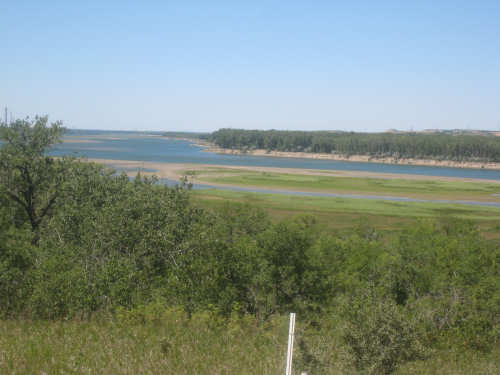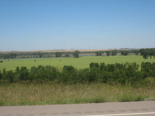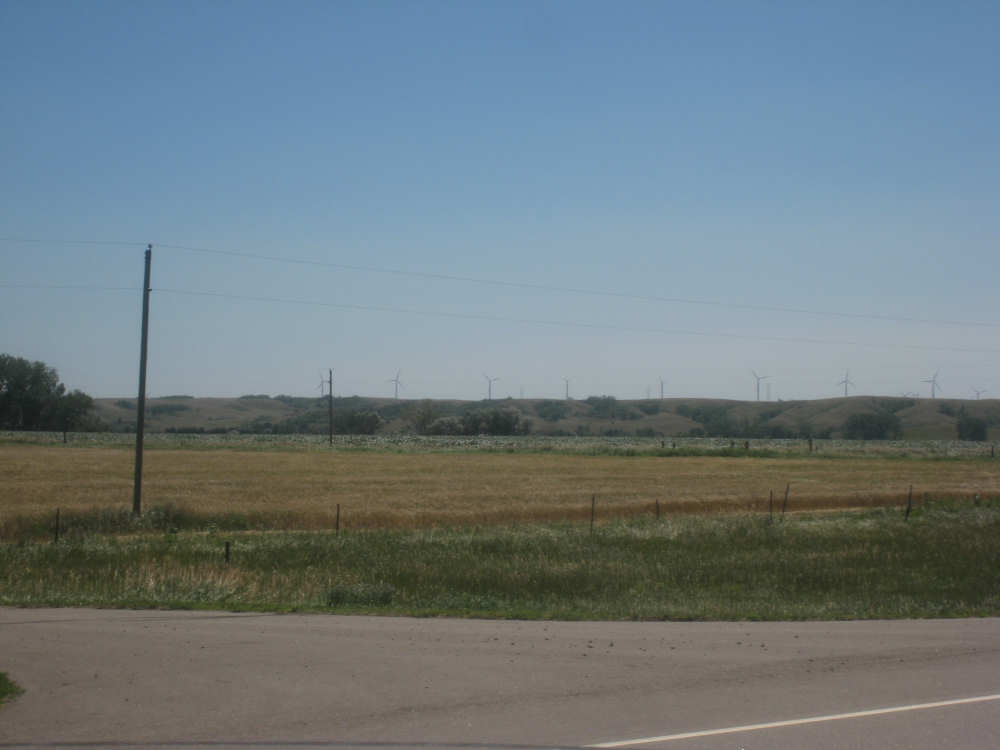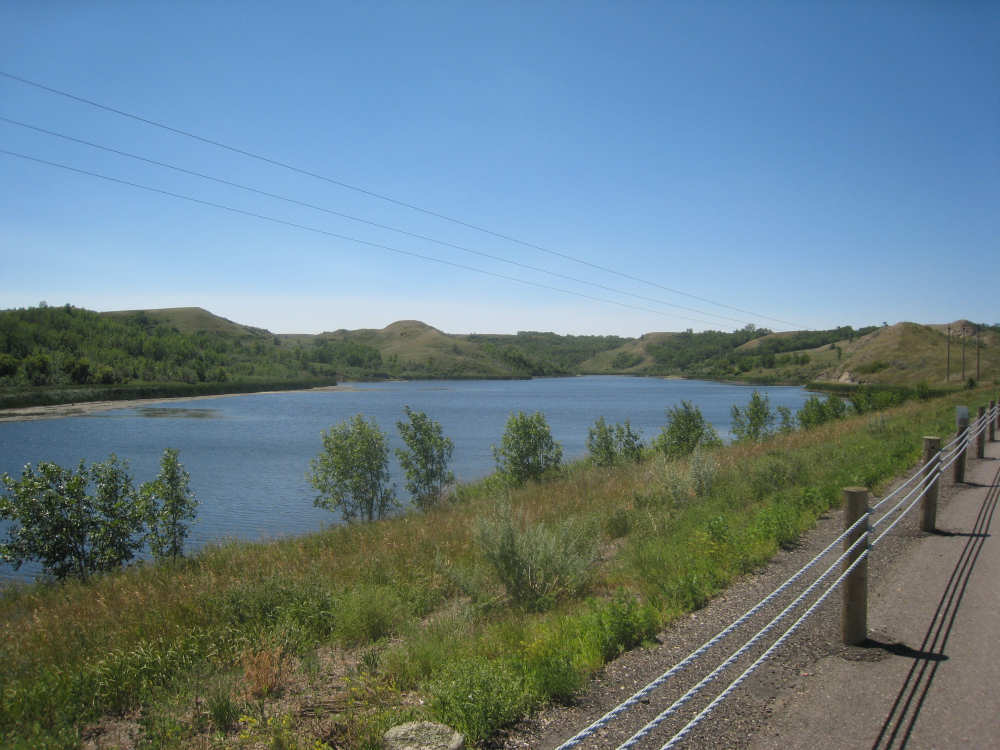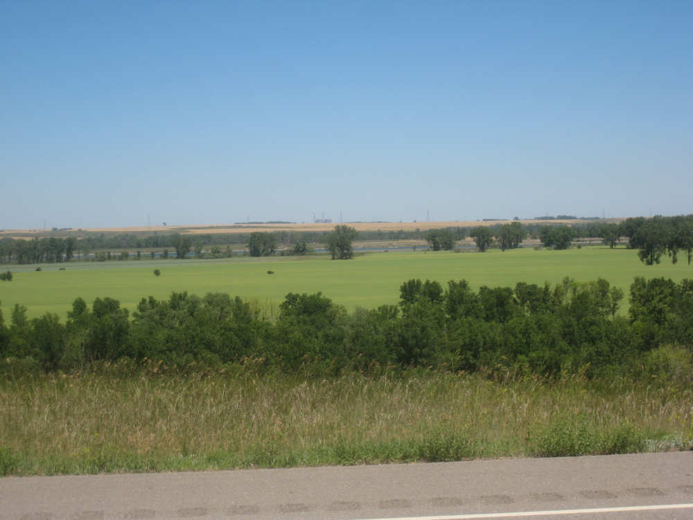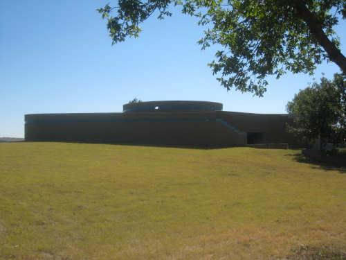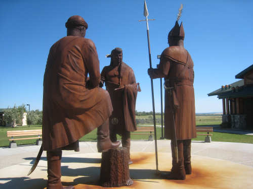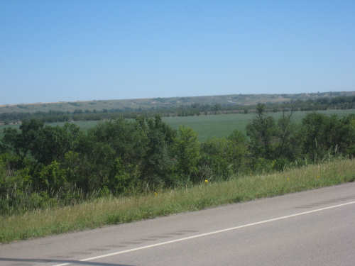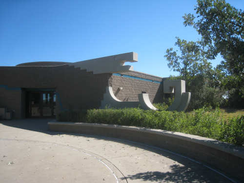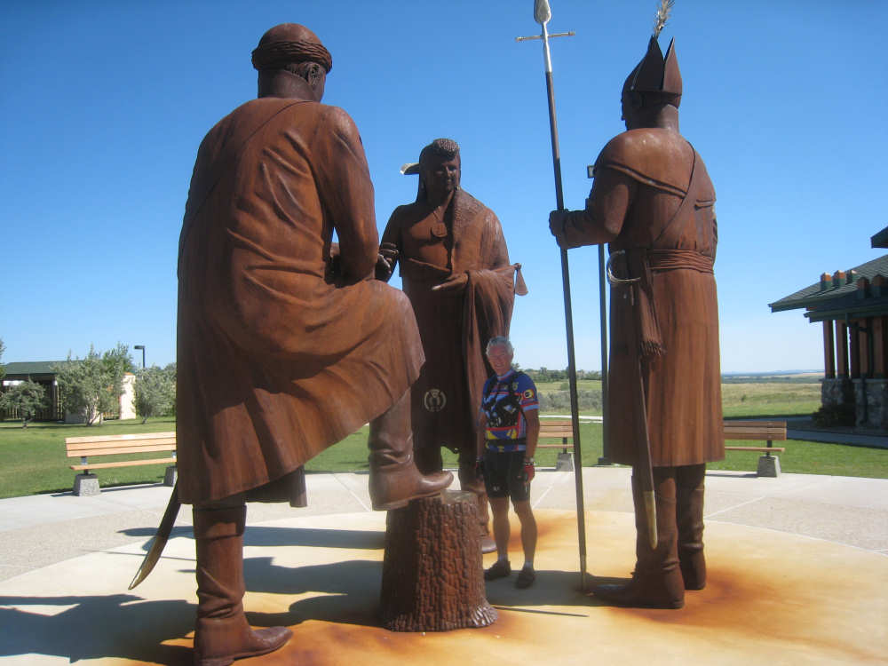 After lunch, we got back on Rt. 200 (alternate) and headed toward Washburn and the Missouri River. This stretch was fairly uneventful until we reached the river, except for seeing a bank of windmills turning in the distance at one turn in the road. We also saw a very wide house being transported, and a group of cows enjoying a dip in a stream. As we neared the river, we also went by Mandan Lake, a small lake nestled among hills, with a beautiful deep blue color. We also passed a wetlands area. The river itself looked very low. Les had told us that the rainfall had been extremely low for the last 5 years and had just gotten better this year, so water levels in general were low. In any case, it was still a lovely river. We had a long climb into Washburn on the other side of the river. The North Dakota Lewis & Clark Interpretive Center was to our left as we approached Hwy. 83 and our motel was on our right. We opted to go to the motel first and unload and then head back to the Interpretive Center. The center was supposed to be open until 7 (summer hours) we were told, but when we got there, they said it was closing at 5, so we only had about a half-hour to tour it. The main exhibit was fairly small, though, with some additional art exhibits which we did not go through. The exhibit dealt primarily with Lewis & Clark's dealings with the local Indians, the 3 tribes discussed at the Knife River exhibit. It also had a lifesize replica of a partially-made dugout canoe, being carved out of a cottonwood log. The enormous statues in front of the center, Lewis & Clark in formal attire meeting with an Indian chief, were among the highlights of the center.